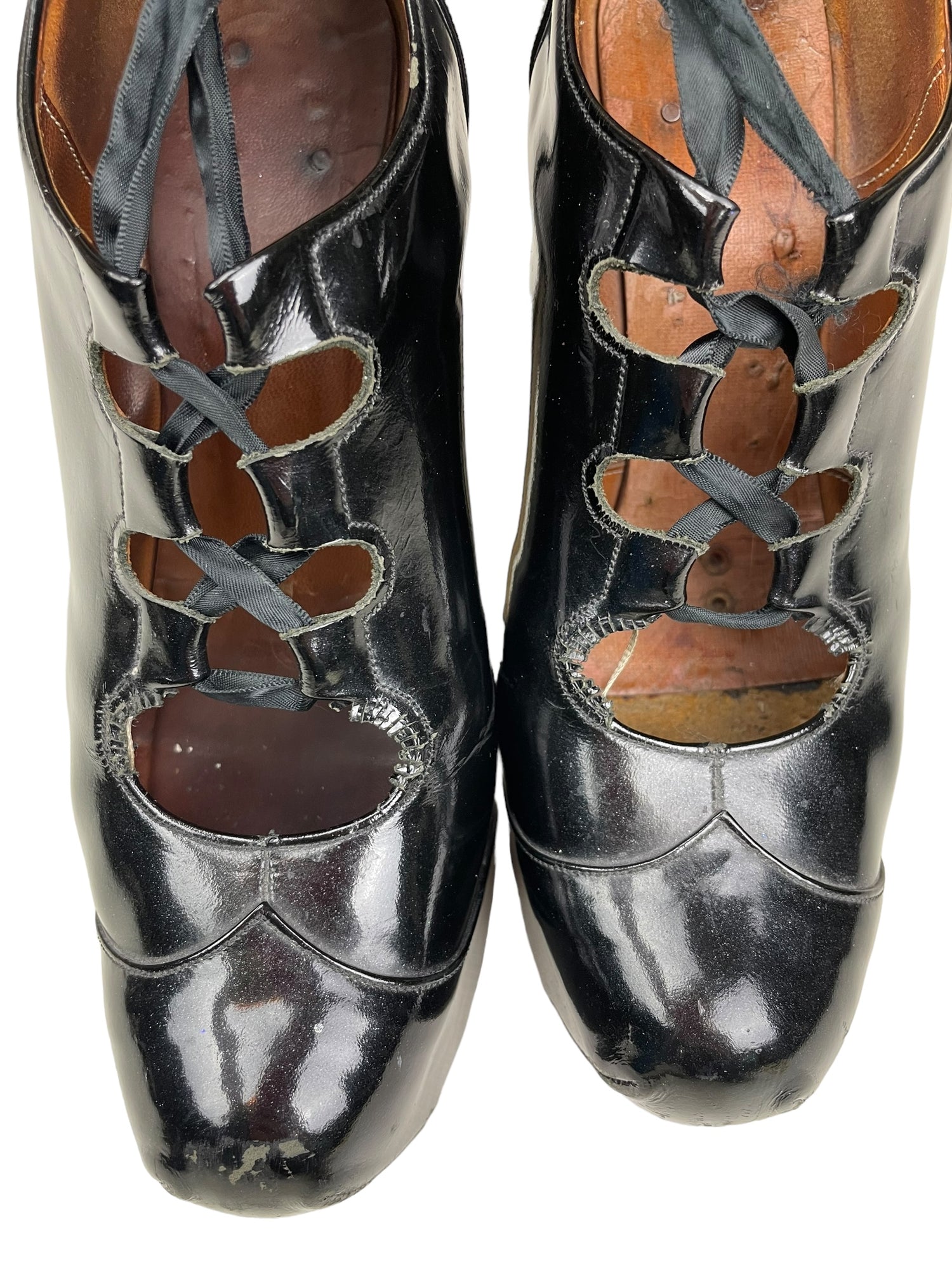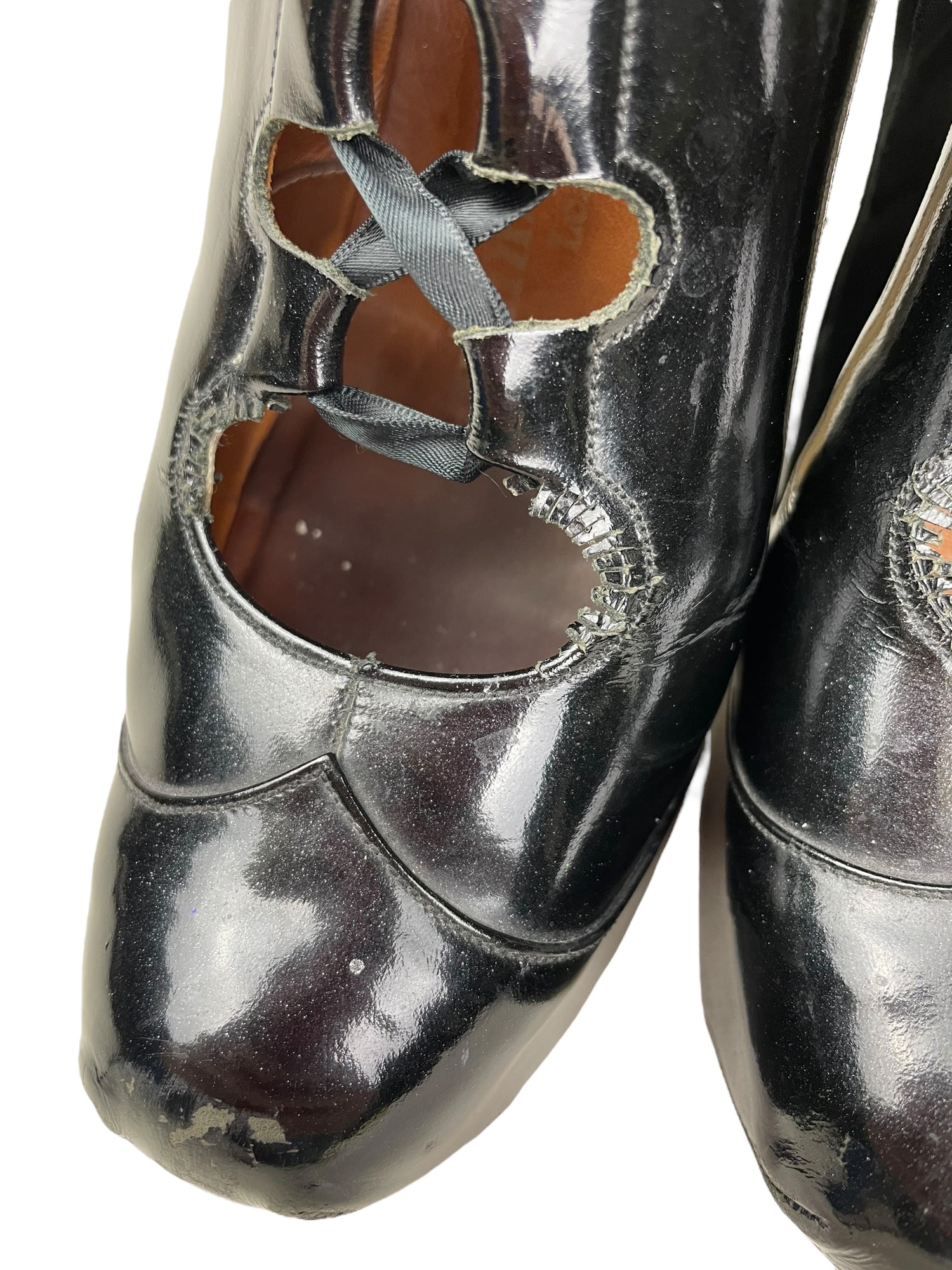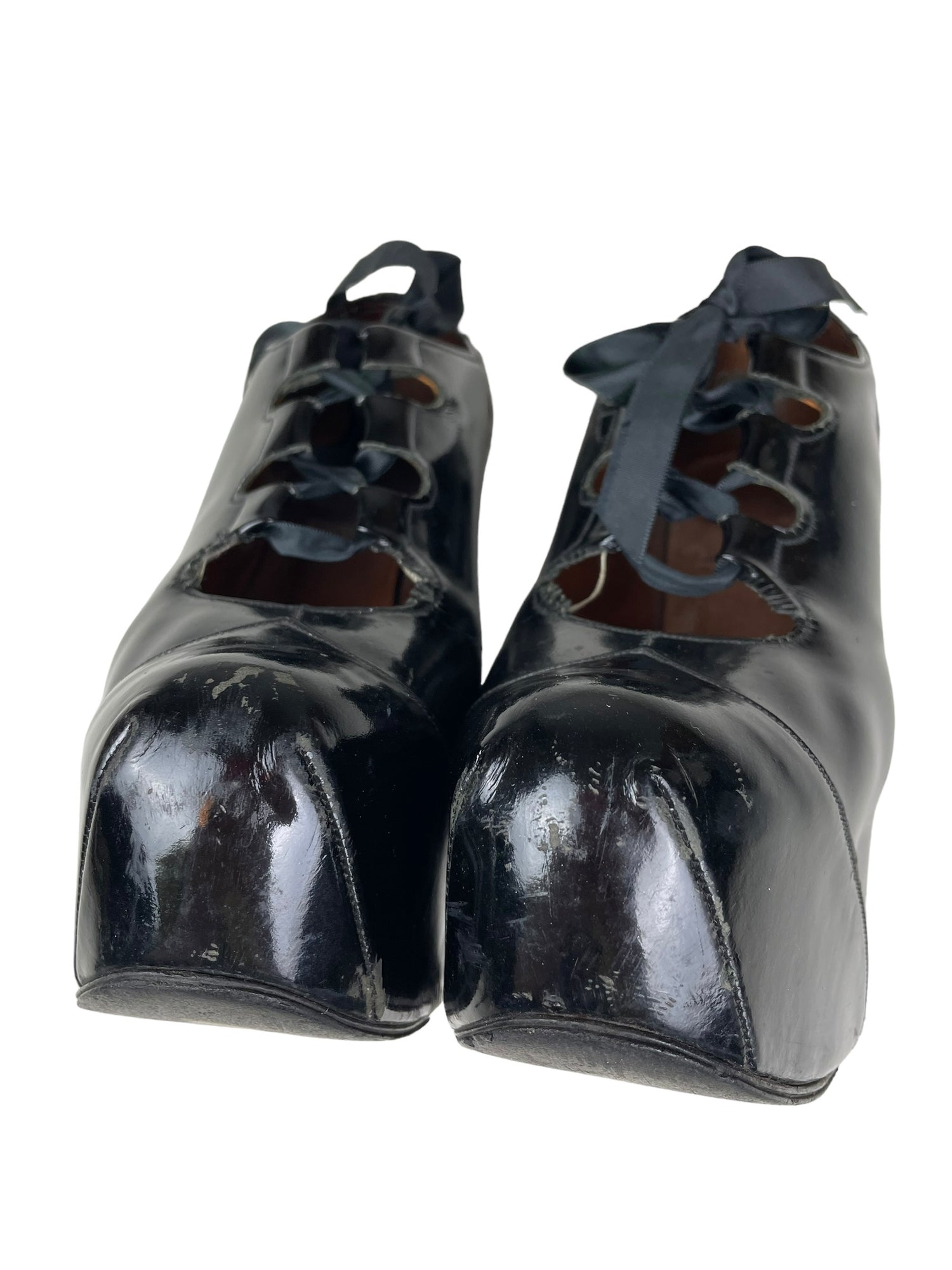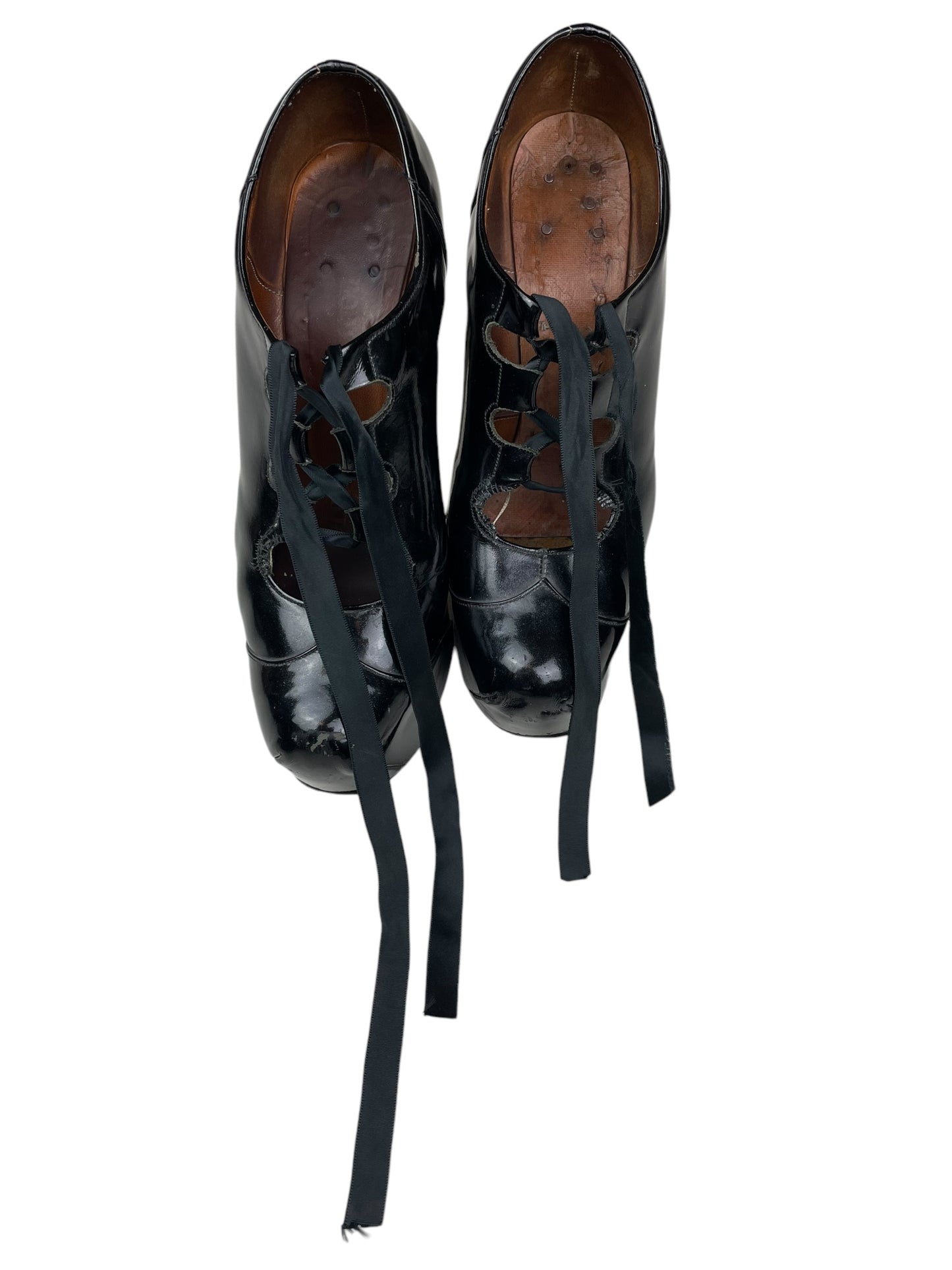 👢Condition is preloved with lots of signs of wear, but structurally sound. Overall very worn, but still a show stopping historical archival collectors piece. Ribbon laces functional but odd lengths and would look super if replaced with longer ones that wrap around the legs, or even brightly coloured ones. There are scuffs throughout - please zoom in on pictures and examine closely. Patent leather flaking where the upper shoe meets the soles on inner side of each shoe. Heels evenly worn and still have lots of life. Inner sole missing from left shoe but easy to replace and isn’t uncomfortable to wear in current condition. The leather edging on the bridge of each shoe is intentionally ‘cut’ to allow for movement, and there’s a small white piece of cord underneath which holds its shape - the cords have slipped loose but this doesn’t effect functionality. 100% leather. No original box. I will send in a secure replacement cardboard box.