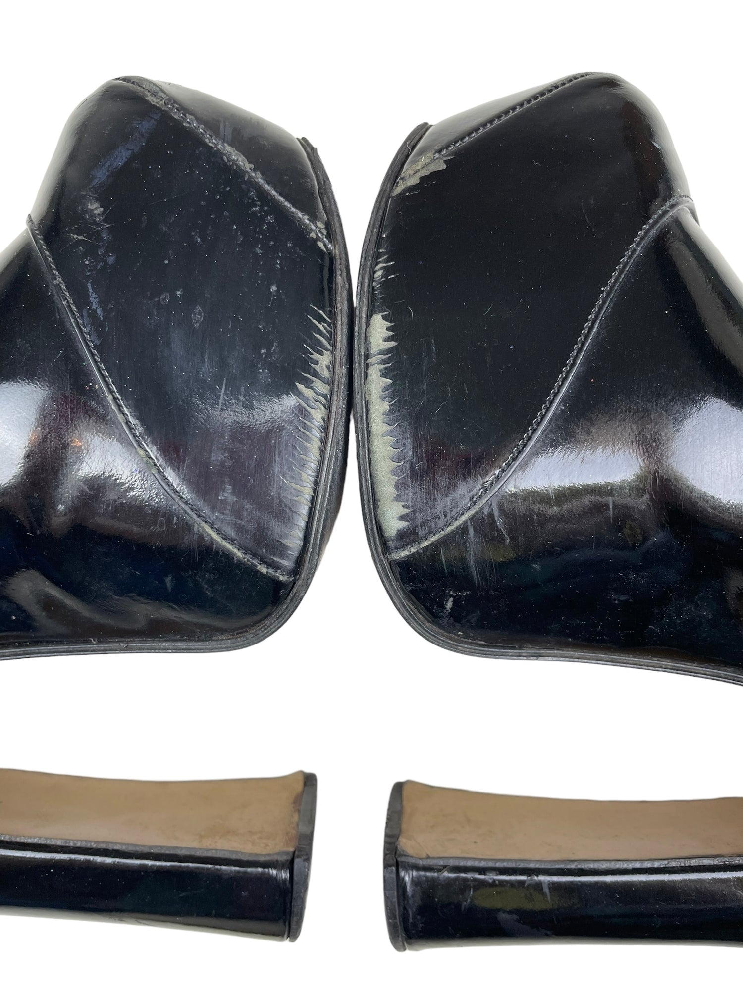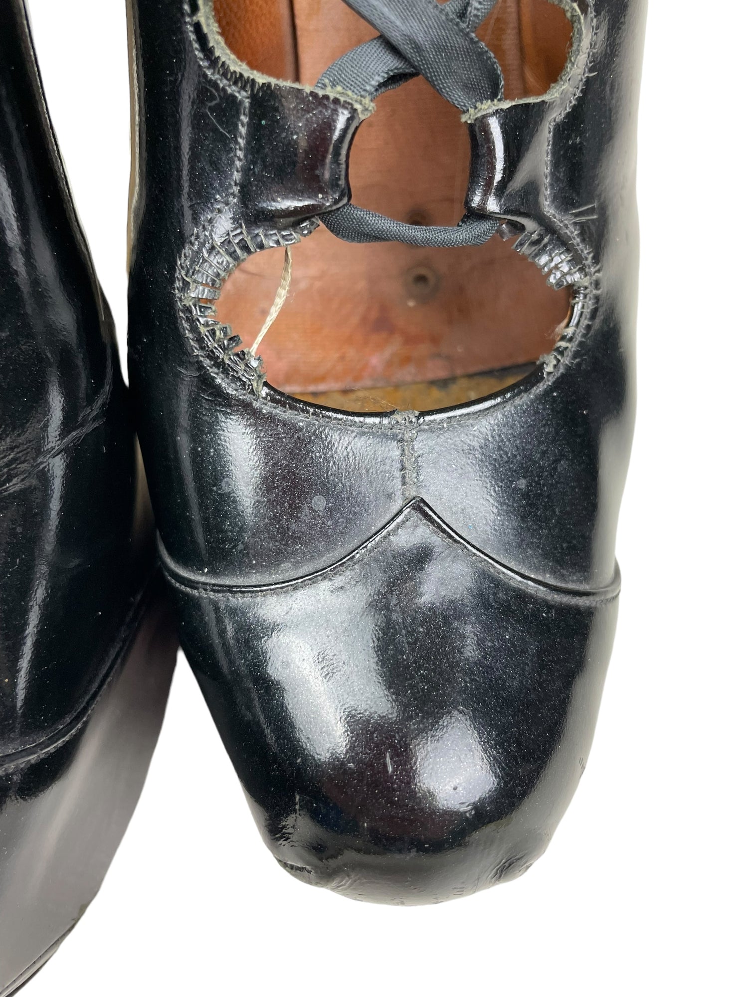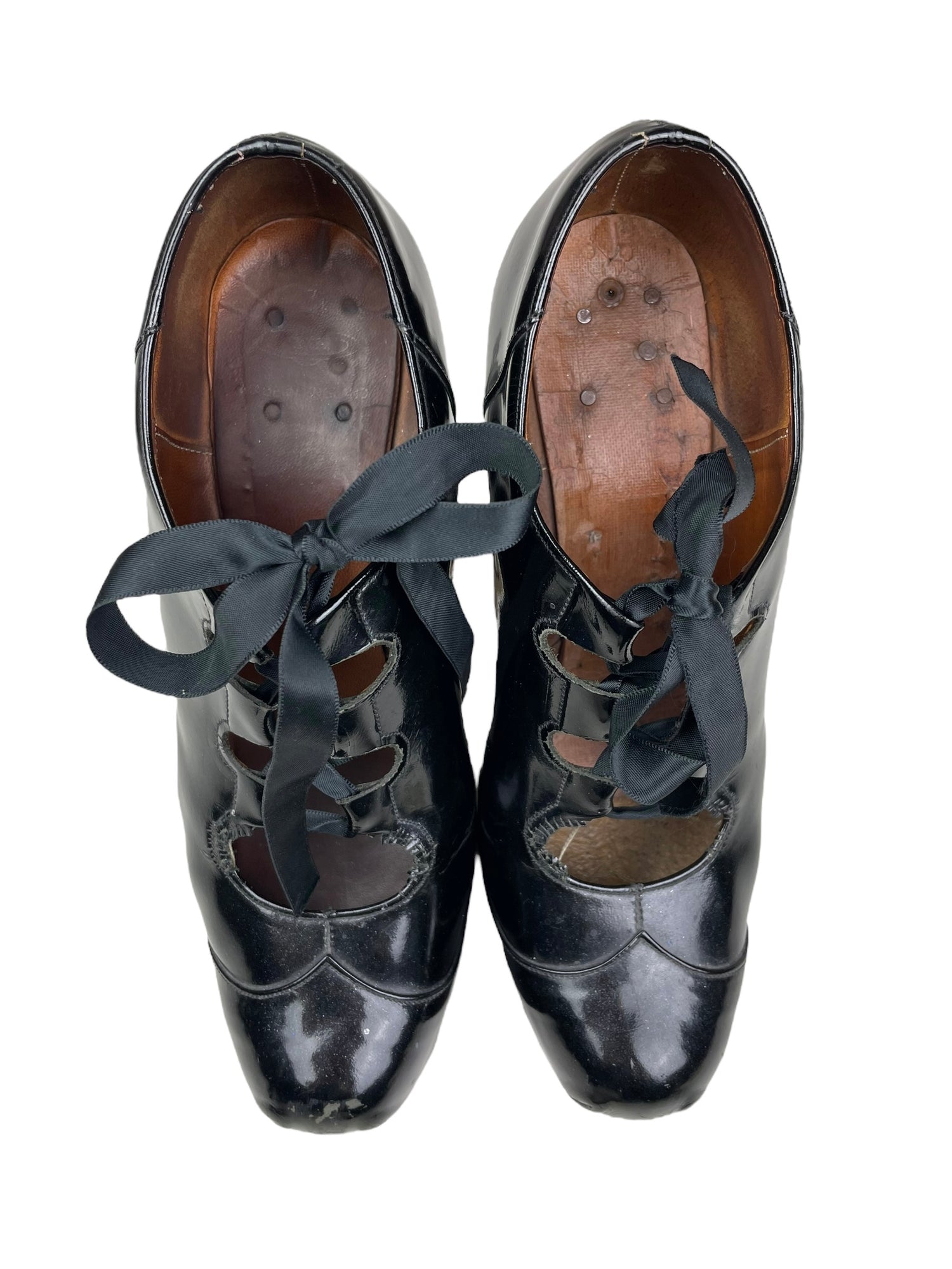 👢Condition is preloved with lots of signs of wear, but structurally sound. Overall very worn, but still a show stopping historical archival collectors piece. Ribbon laces functional but odd lengths and would look super if replaced with longer ones that wrap around the legs, or even brightly coloured ones. There are scuffs throughout - please zoom in on pictures and examine closely. Patent leather flaking where the upper shoe meets the soles on inner side of each shoe. Heels evenly worn and still have lots of life. Inner sole missing from left shoe but easy to replace and isn’t uncomfortable to wear in current condition. The leather edging on the bridge of each shoe is intentionally ‘cut’ to allow for movement, and there’s a small white piece of cord underneath which holds its shape - the cords have slipped loose but this doesn’t effect functionality. 100% leather. No original box. I will send in a secure replacement cardboard box.