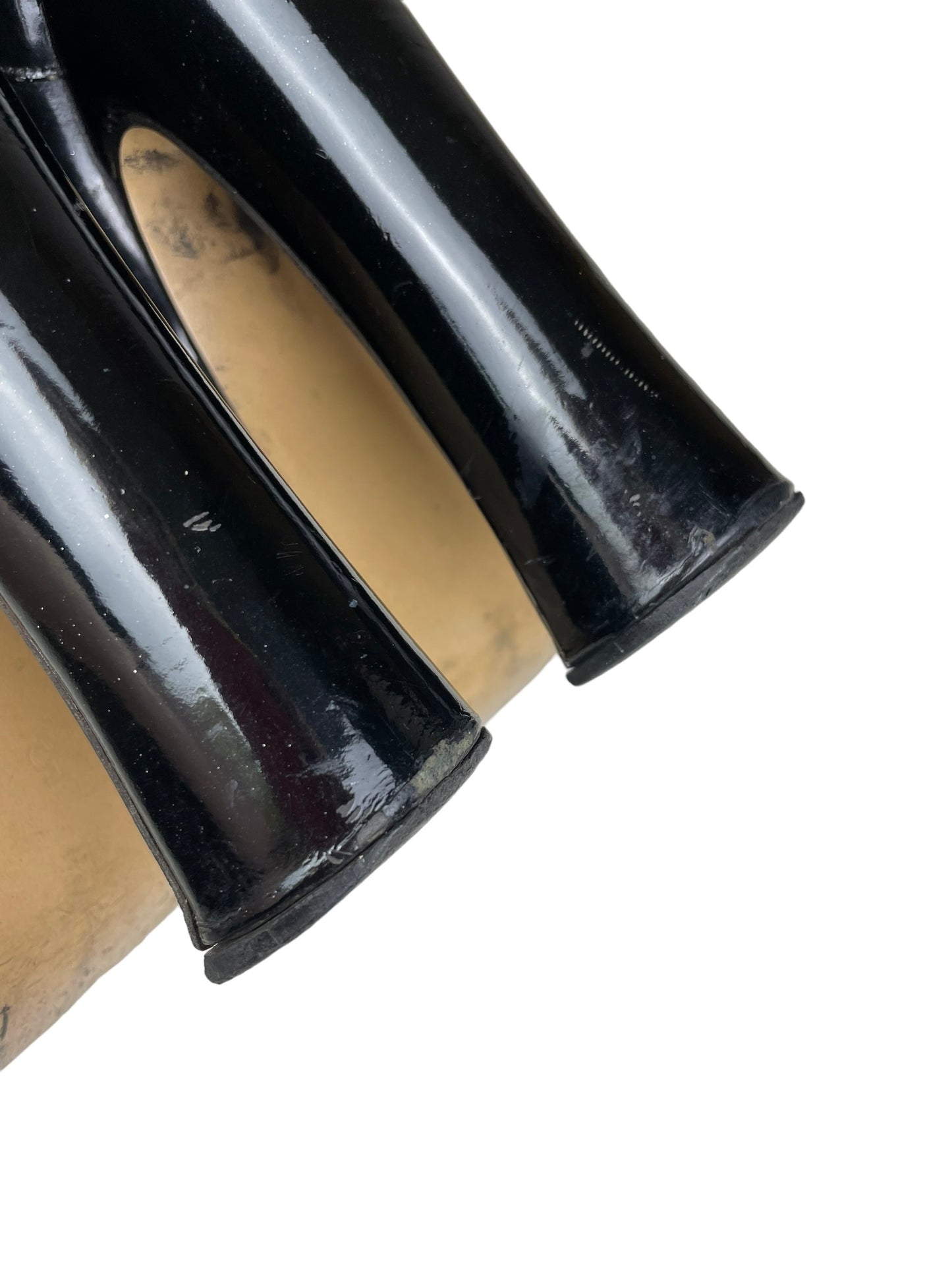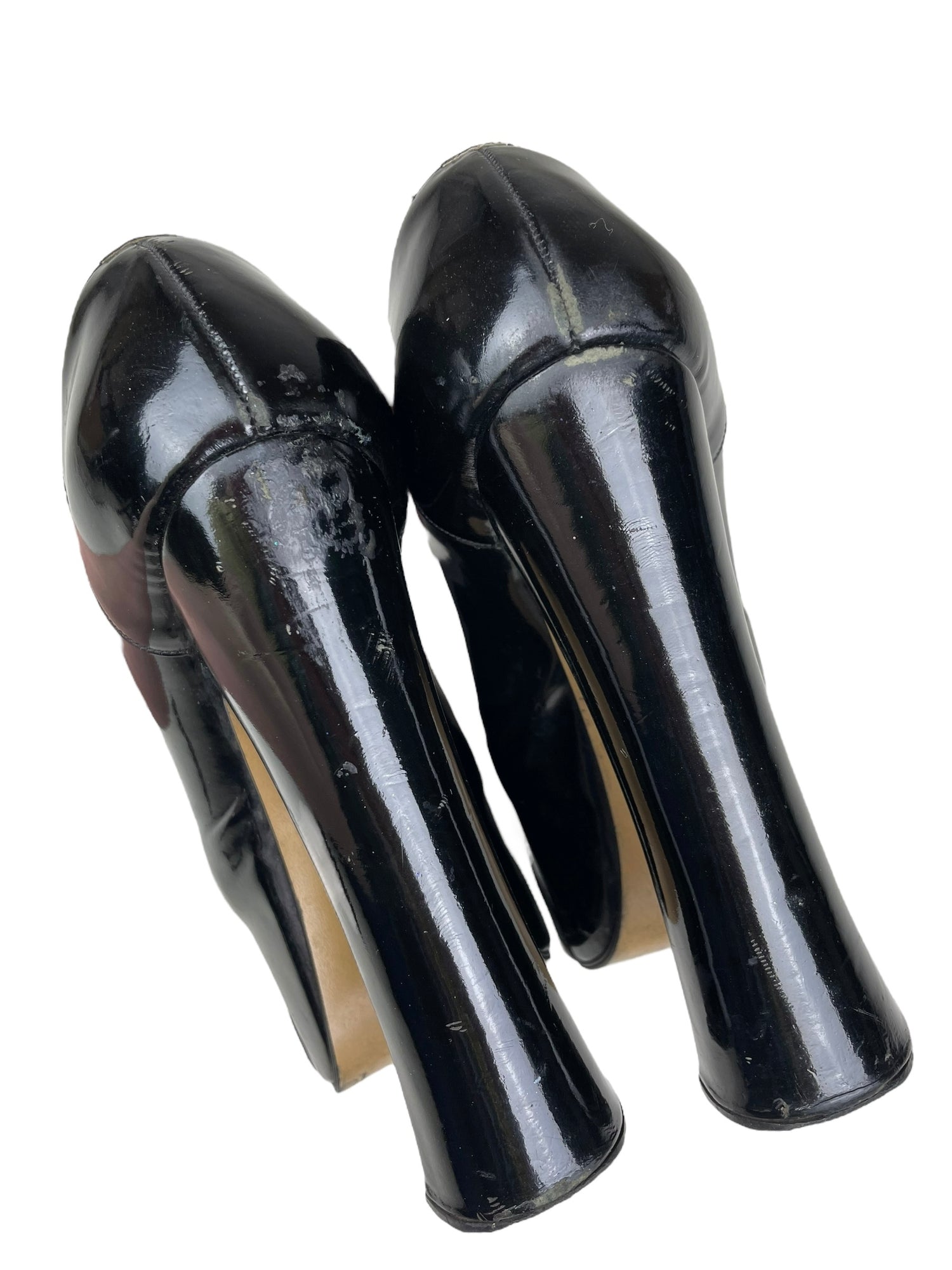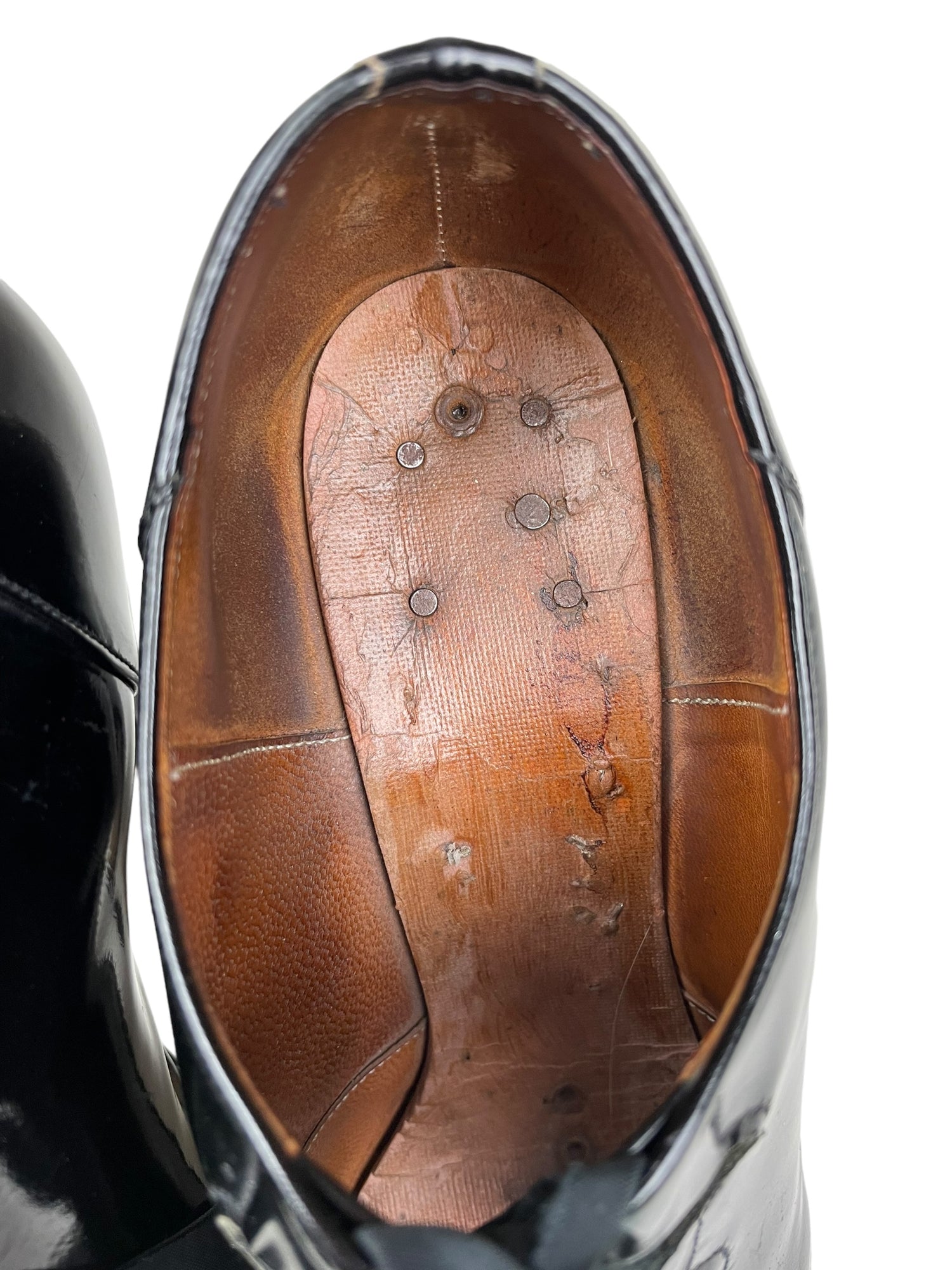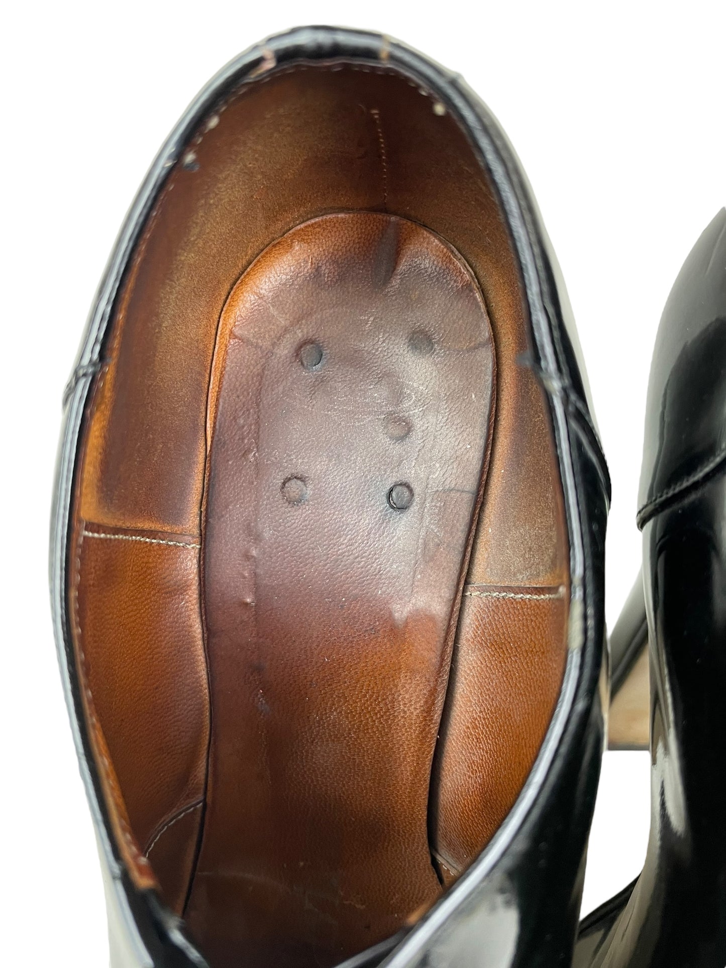👢Condition is preloved with lots of signs of wear, but structurally sound. Overall very worn, but still a show stopping historical archival collectors piece. Ribbon laces functional but odd lengths and would look super if replaced with longer ones that wrap around the legs, or even brightly coloured ones. There are scuffs throughout - please zoom in on pictures and examine closely. Patent leather flaking where the upper shoe meets the soles on inner side of each shoe. Heels evenly worn and still have lots of life. Inner sole missing from left shoe but easy to replace and isn’t uncomfortable to wear in current condition. The leather edging on the bridge of each shoe is intentionally ‘cut’ to allow for movement, and there’s a small white piece of cord underneath which holds its shape - the cords have slipped loose but this doesn’t effect functionality. 100% leather. No original box. I will send in a secure replacement cardboard box.
