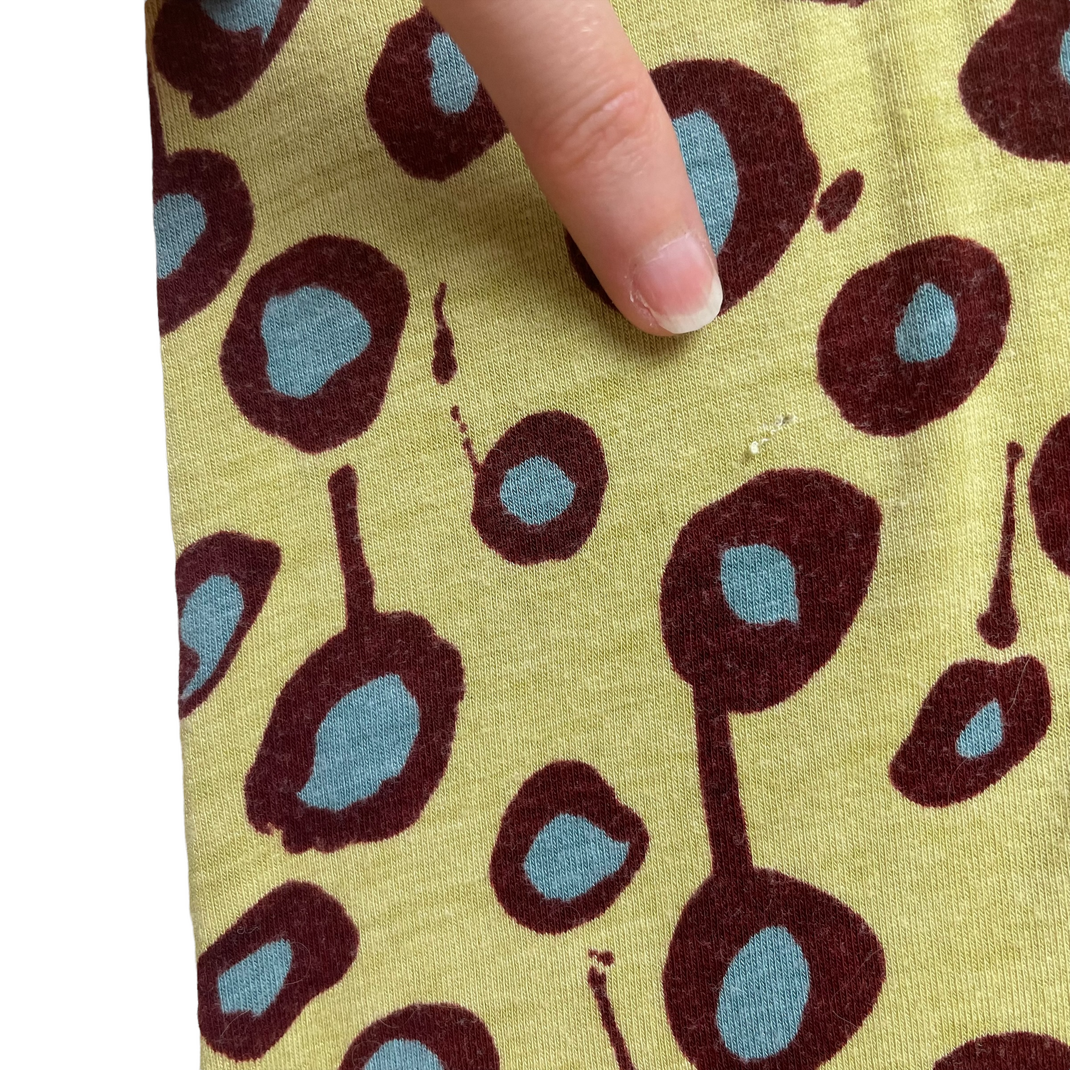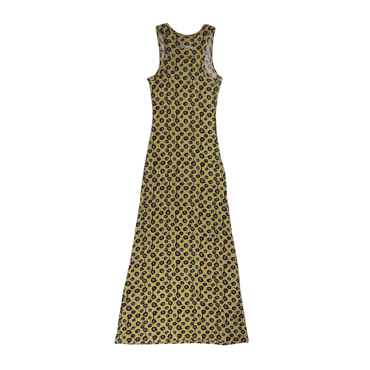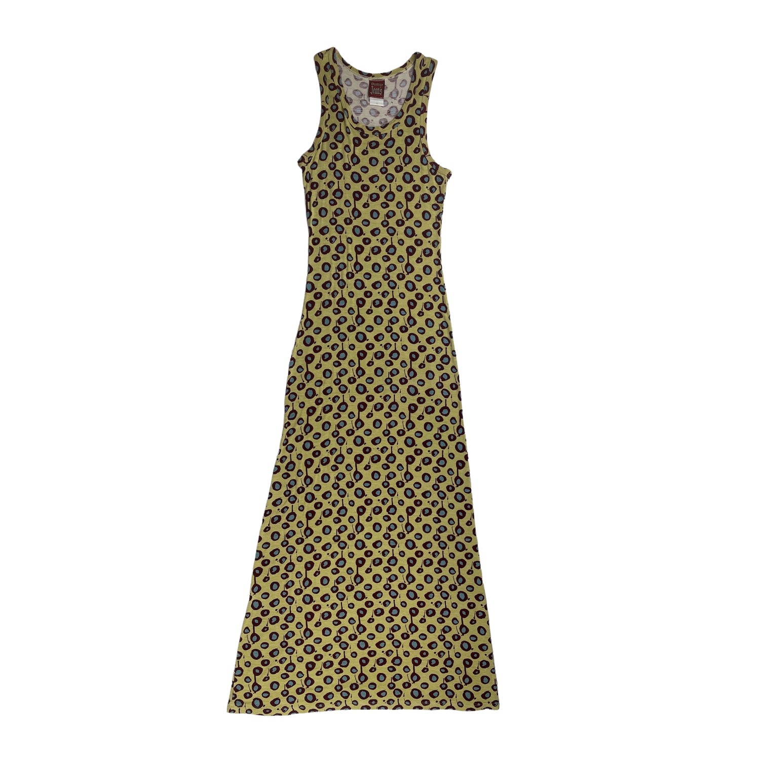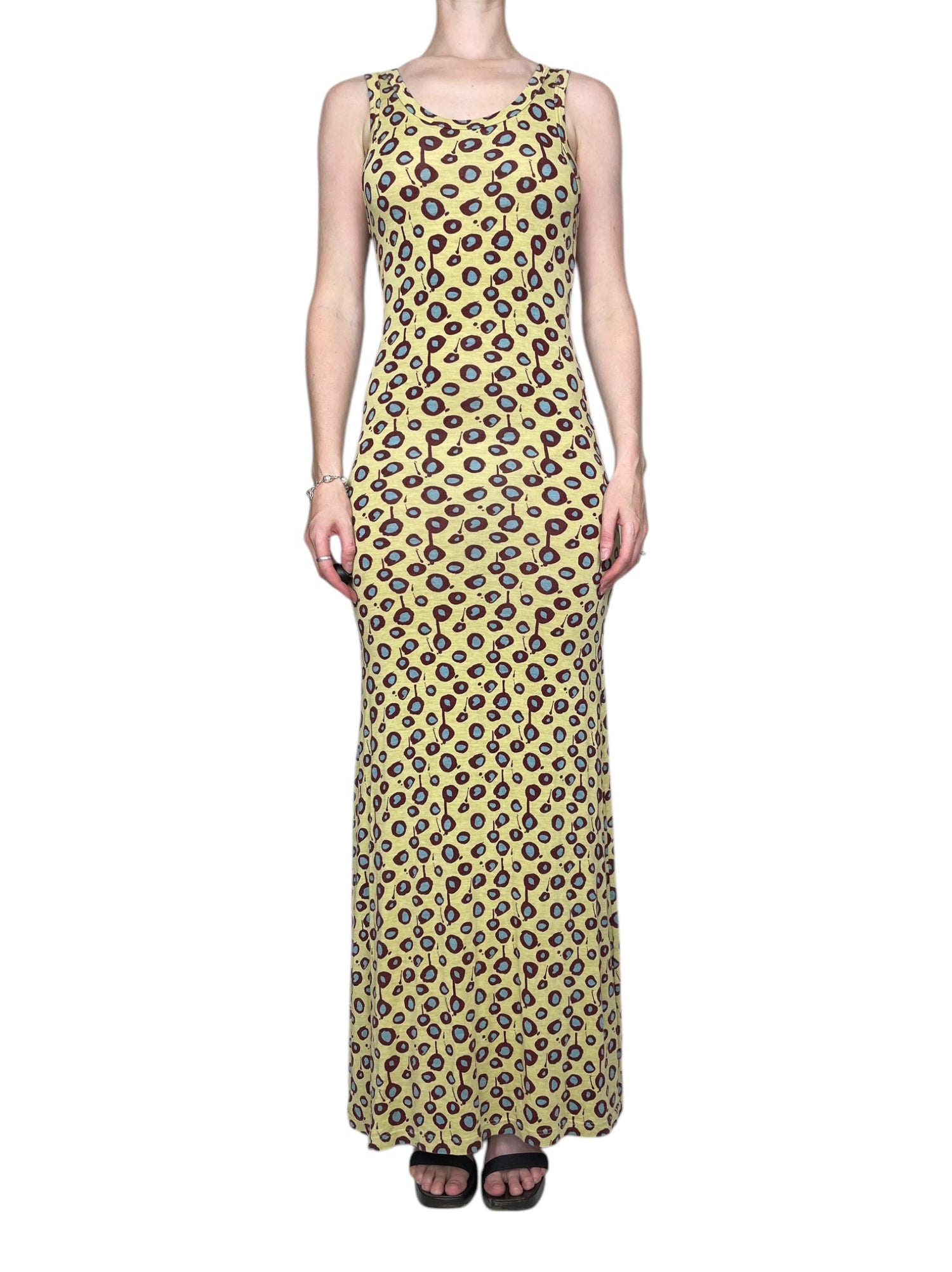 Spring 1996 yellow jersey-feel maxi dress with burgundy and blue paint splat dots. Size S (fits UK8/10). All details below:
