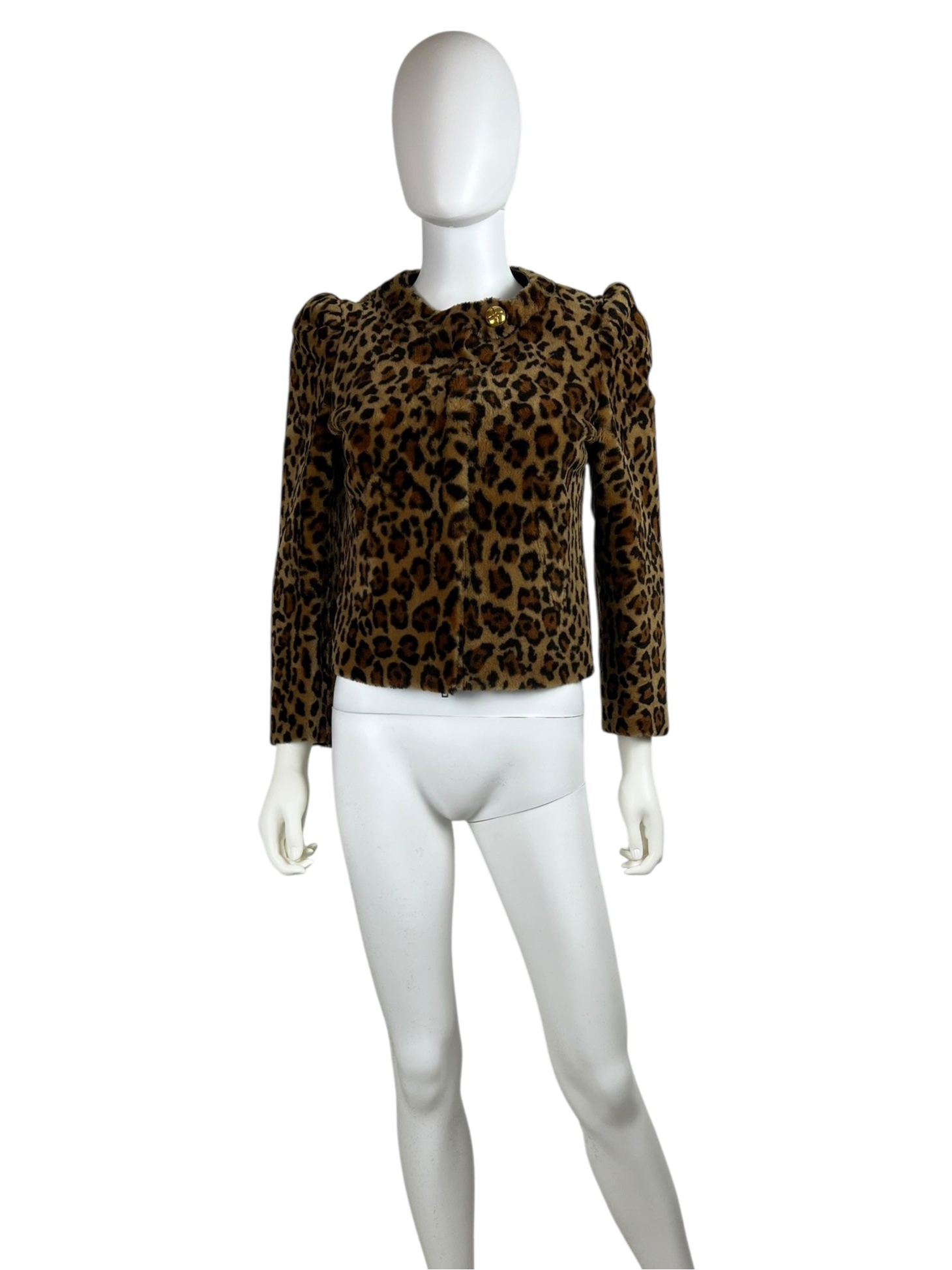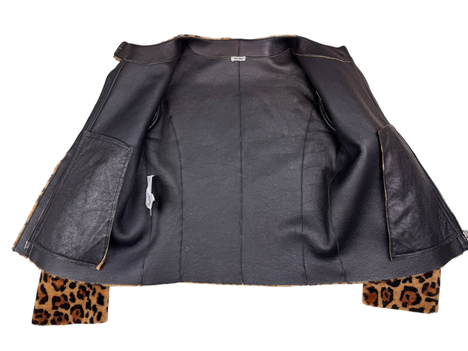 Miu Miu Automne Pre-Fall 2010 shearling leopard print jacket. Real leather shearling sheepskin that’s been expertly dyed in leopard print, and has a luxurious soft plush pile. Two-way zip with vintage style gold tone metal button as seen on the longer version in the lookbook. Size XS (UK6/8). All details below👇