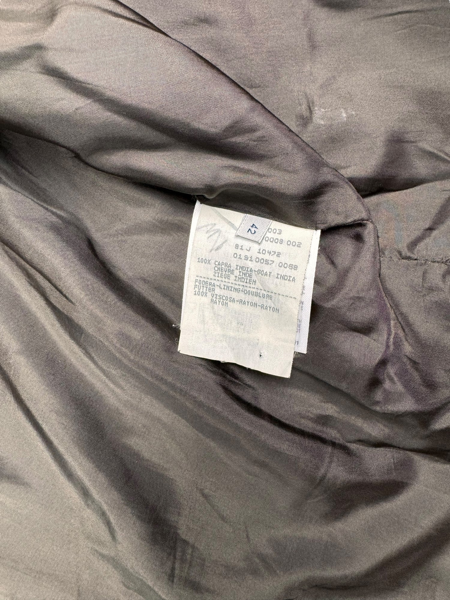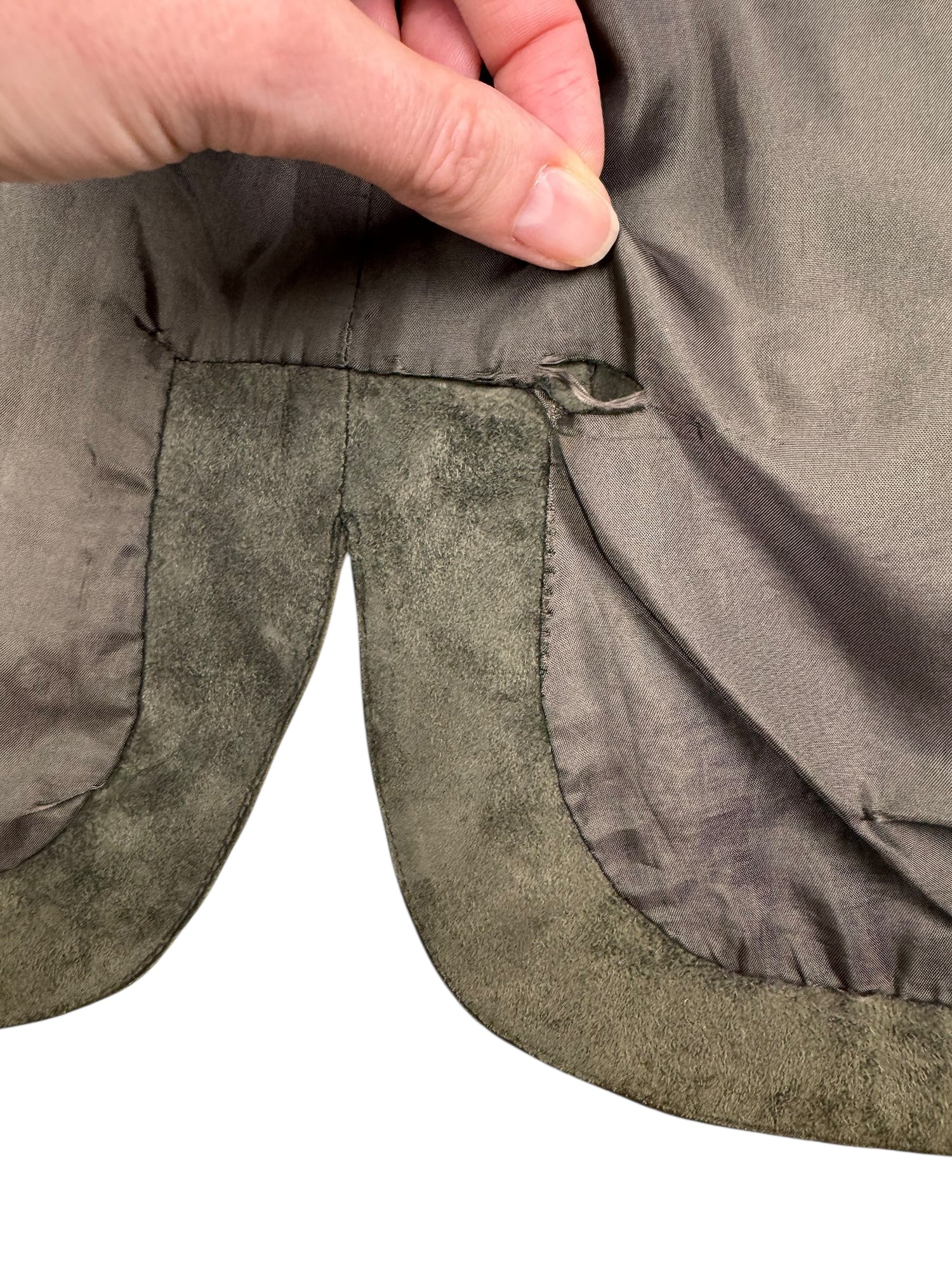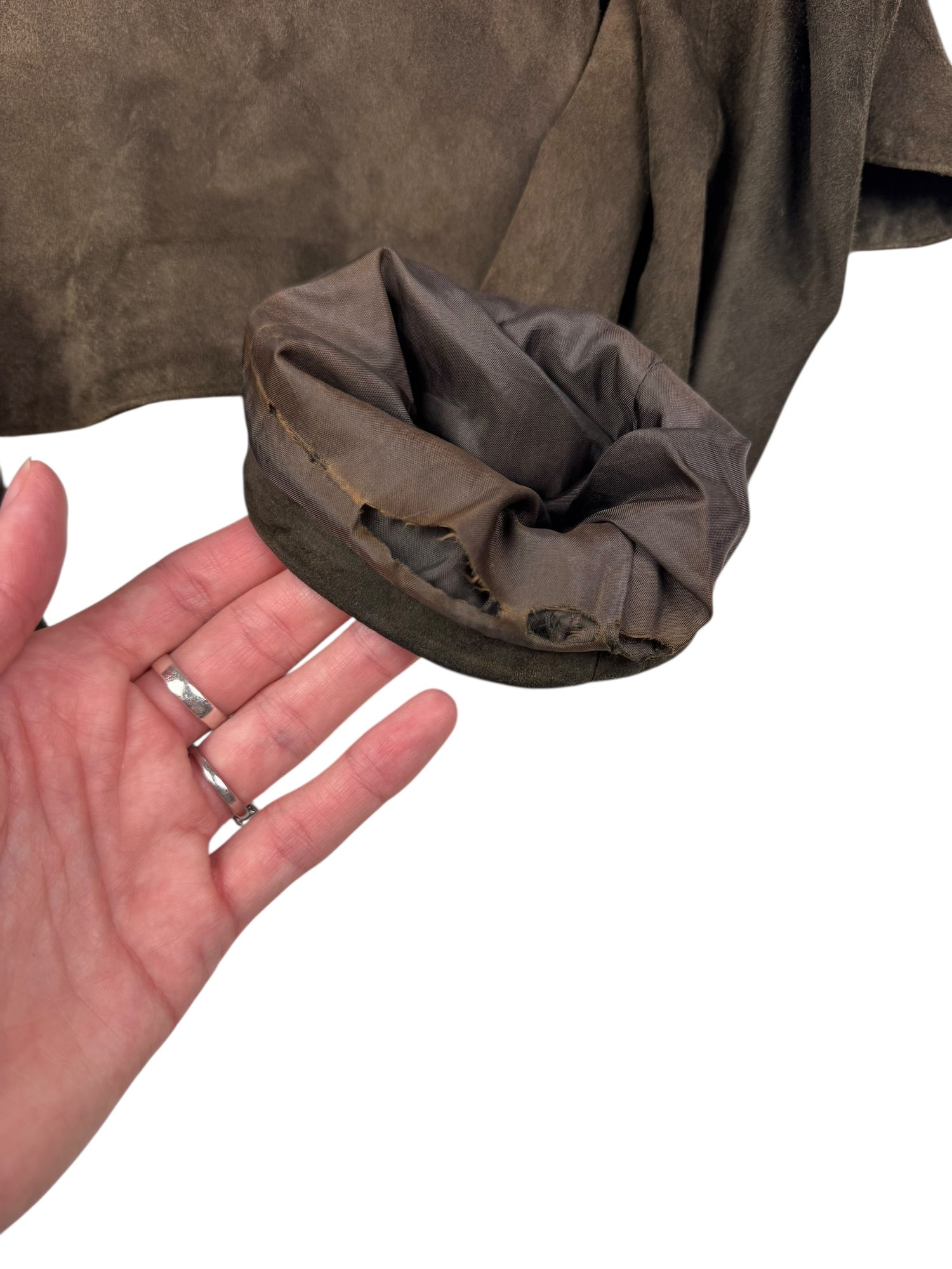 🐥 Condition is fair overall but there are some marks and small faults. No bad odour. Inside collar and outer armpits appear slightly darker from wear, although these colour variations are subtle, blend in and don’t stand out. A mark on the lapel that will likely brush out with a suede brush. Small tear in pocket lining - needs stitching. Small tear in lining at back near vent. Stitching come undone on side but not too noticeable and easily to repair. Cuffs good externally but inside lining has worn and ripped over the years. Still a wearable piece but with aging. 100% buttery soft goats leather outer. Viscose rayon lining. Dry clean only.