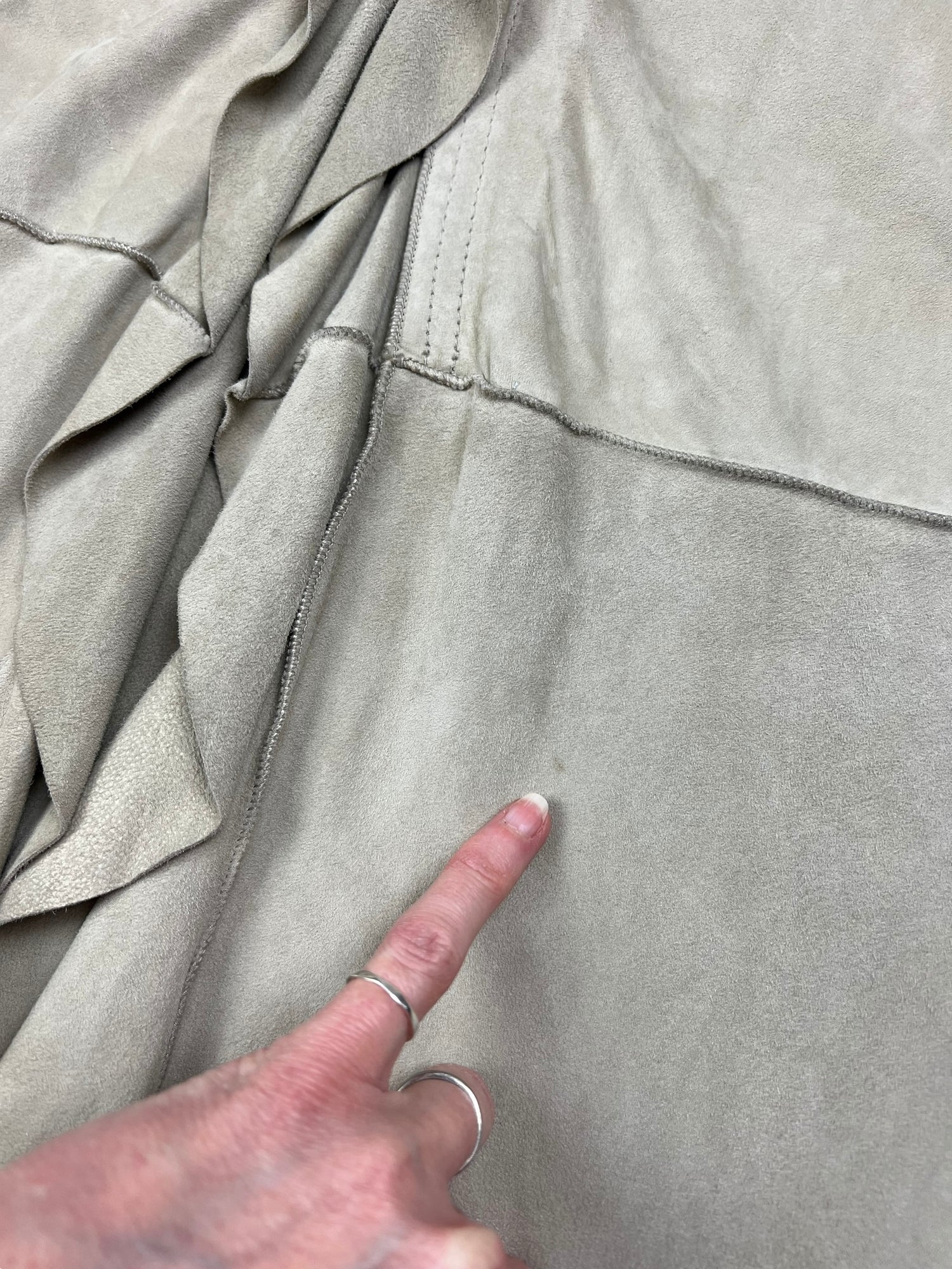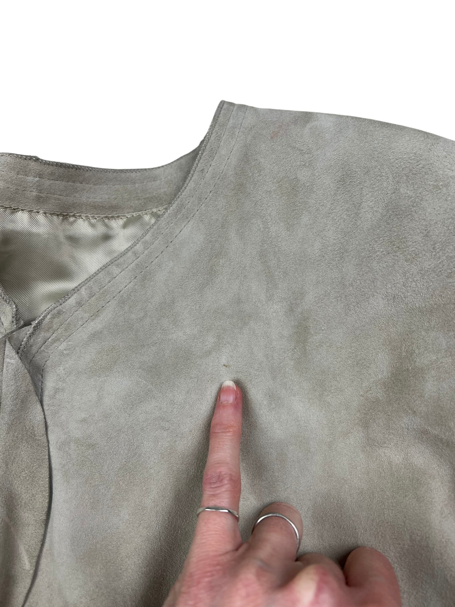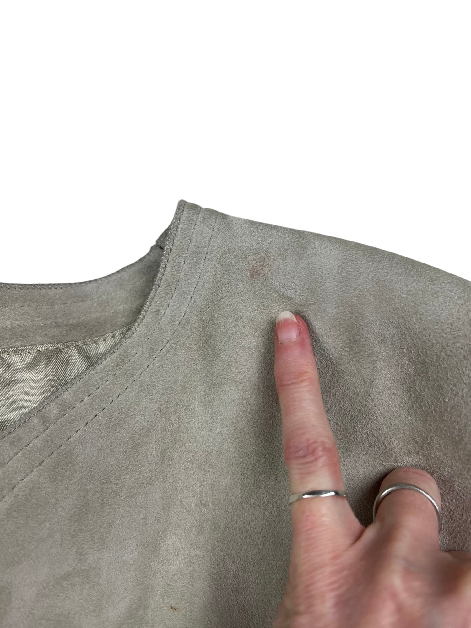 🐥 Condition is very good with minimal signs of wear. Several small but hard to see spot marks throughout as shown. Armpits clean and stain-free inside and out. 100% suede outer. Lining unknown but likely polyester. Dry clean.