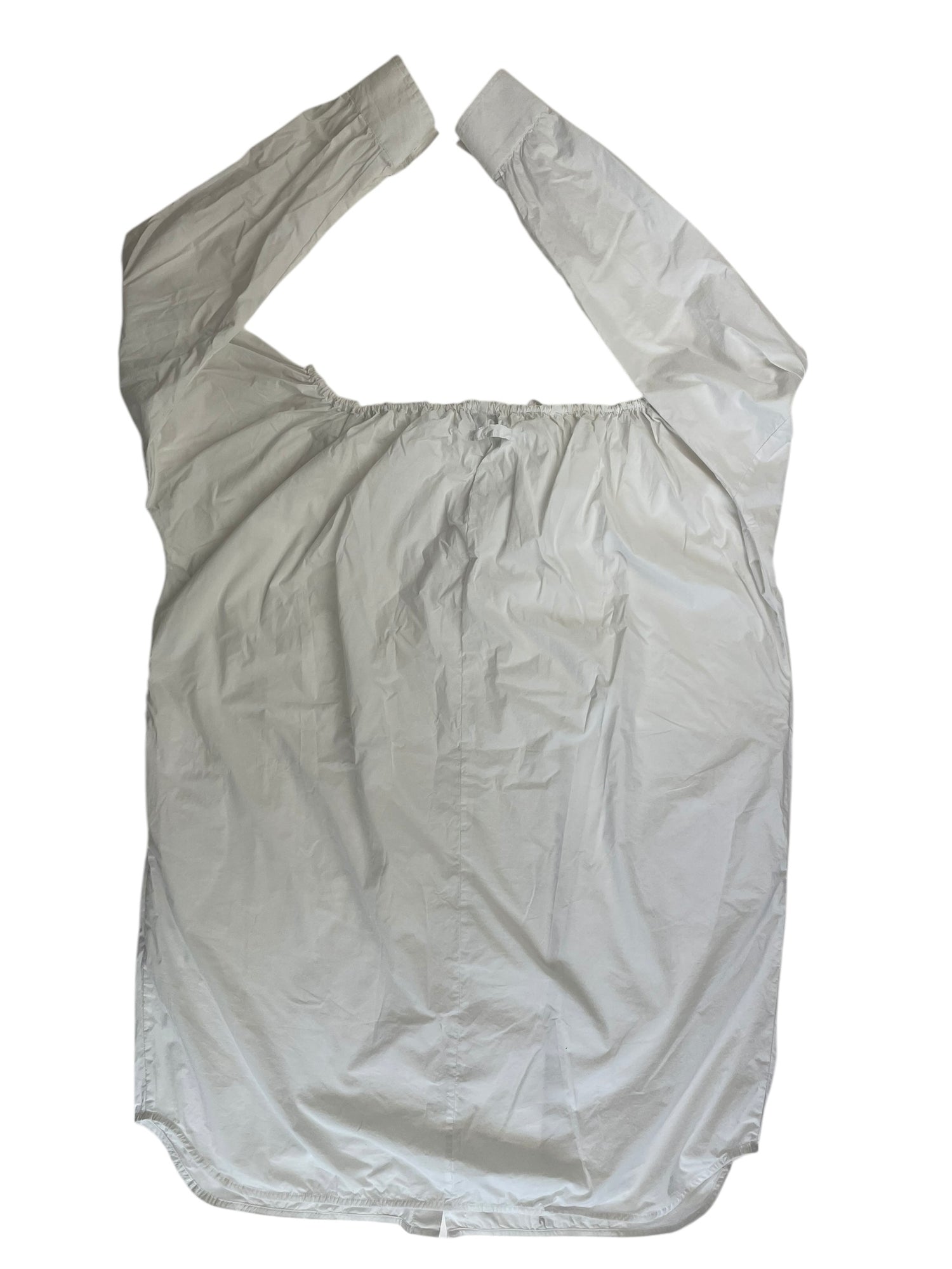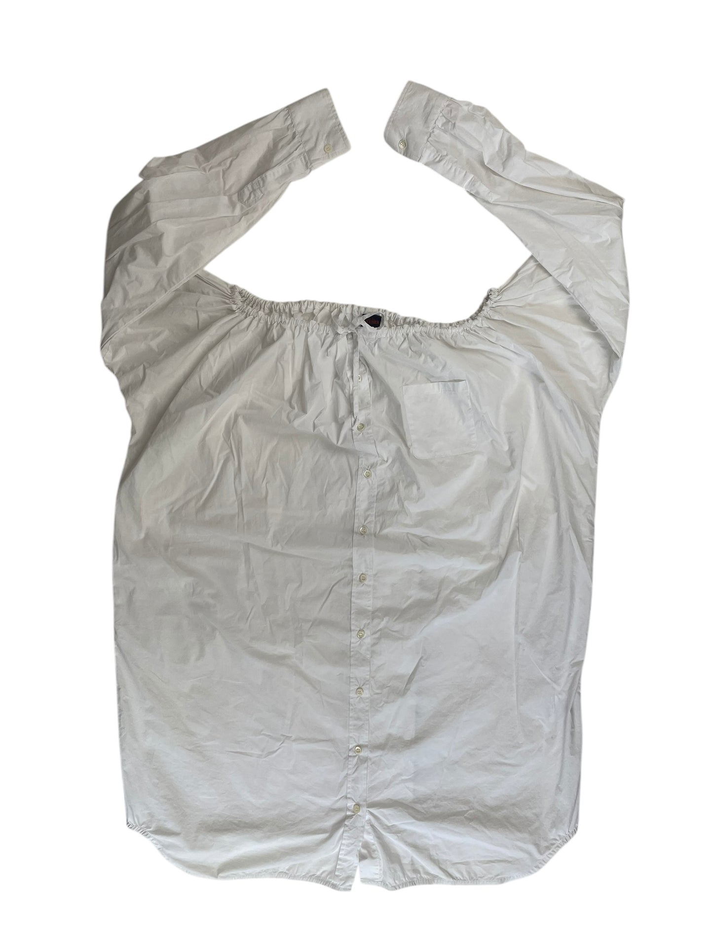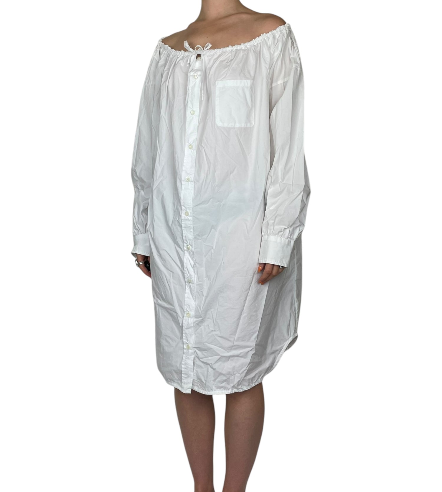 Y2K Vintage white cotton oversized smock shirt dress with adjustable ruched off shoulder neckline. Labelled size UK8 but can fit bigger due to cut.