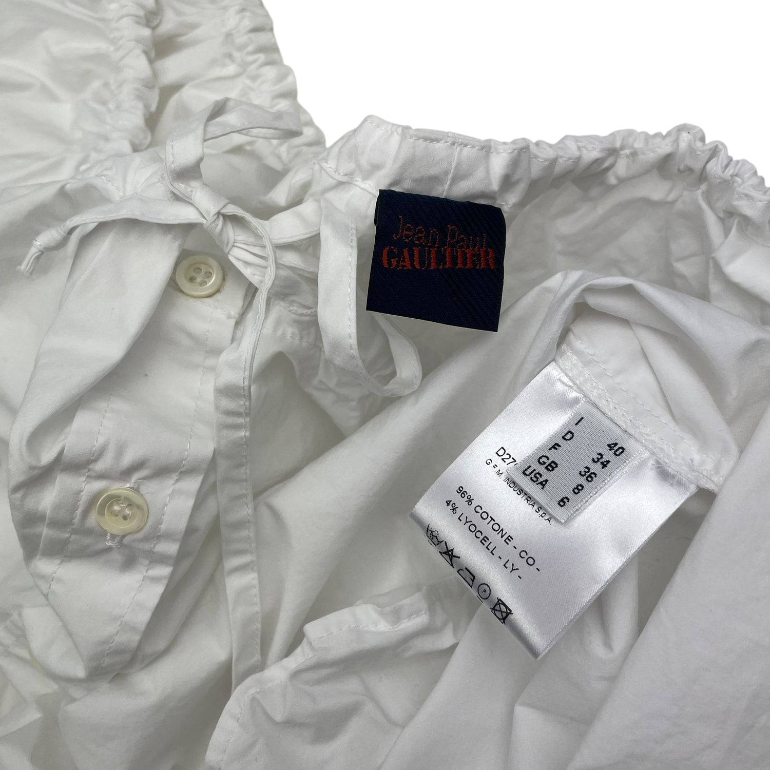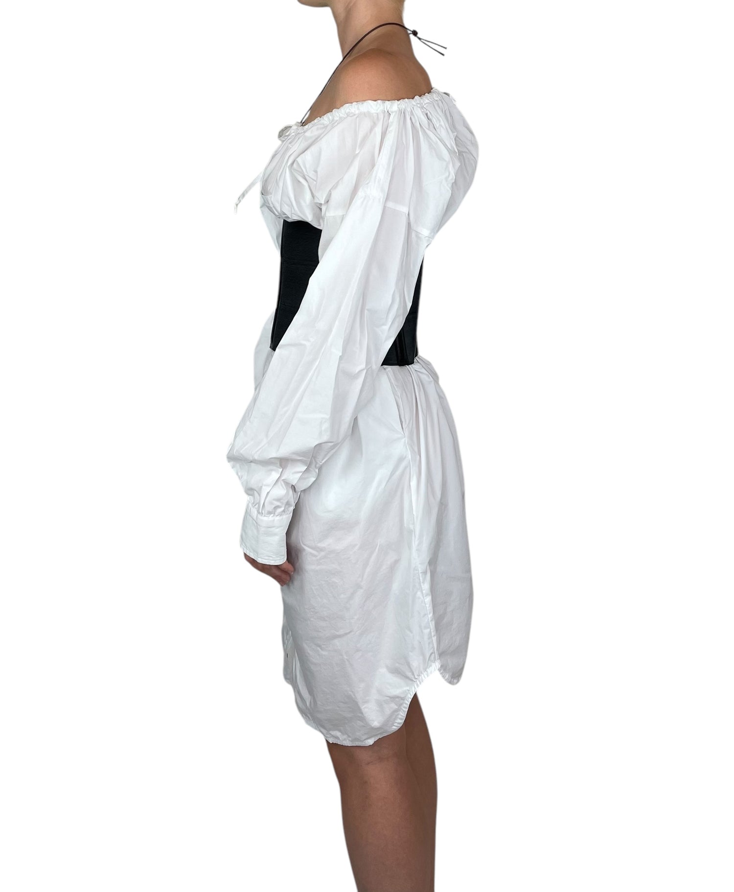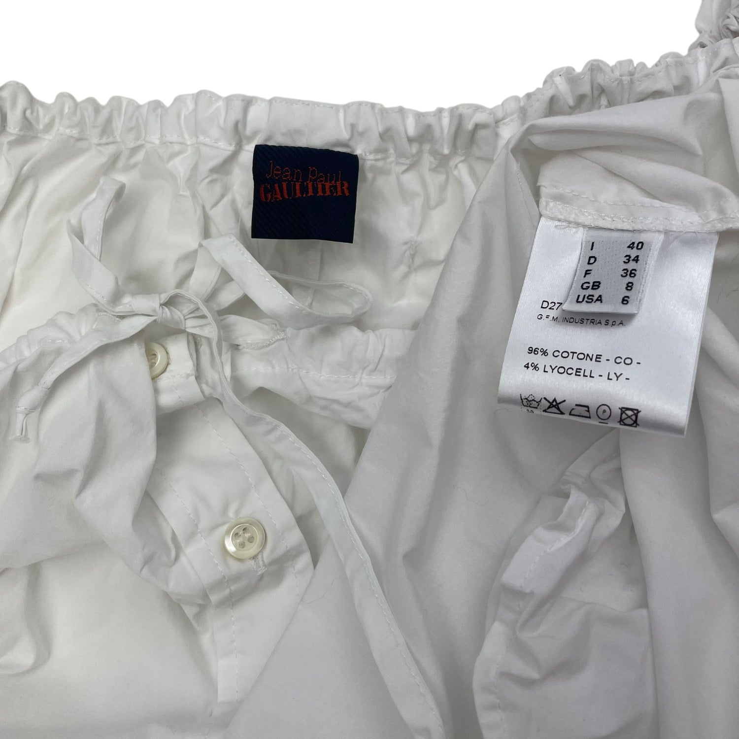 Y2K Vintage white cotton oversized smock shirt dress with adjustable ruched off shoulder neckline. Labelled size UK8 but can fit bigger due to cut.