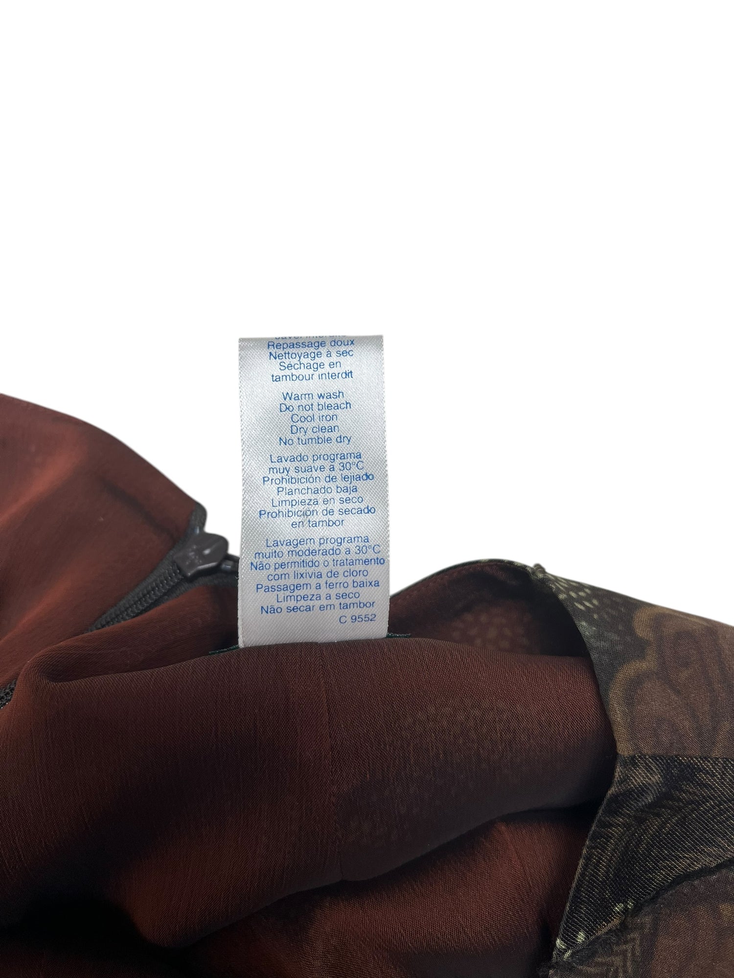 77% silk, 23% rayon. Lining 100% polyester. Warm machine wash