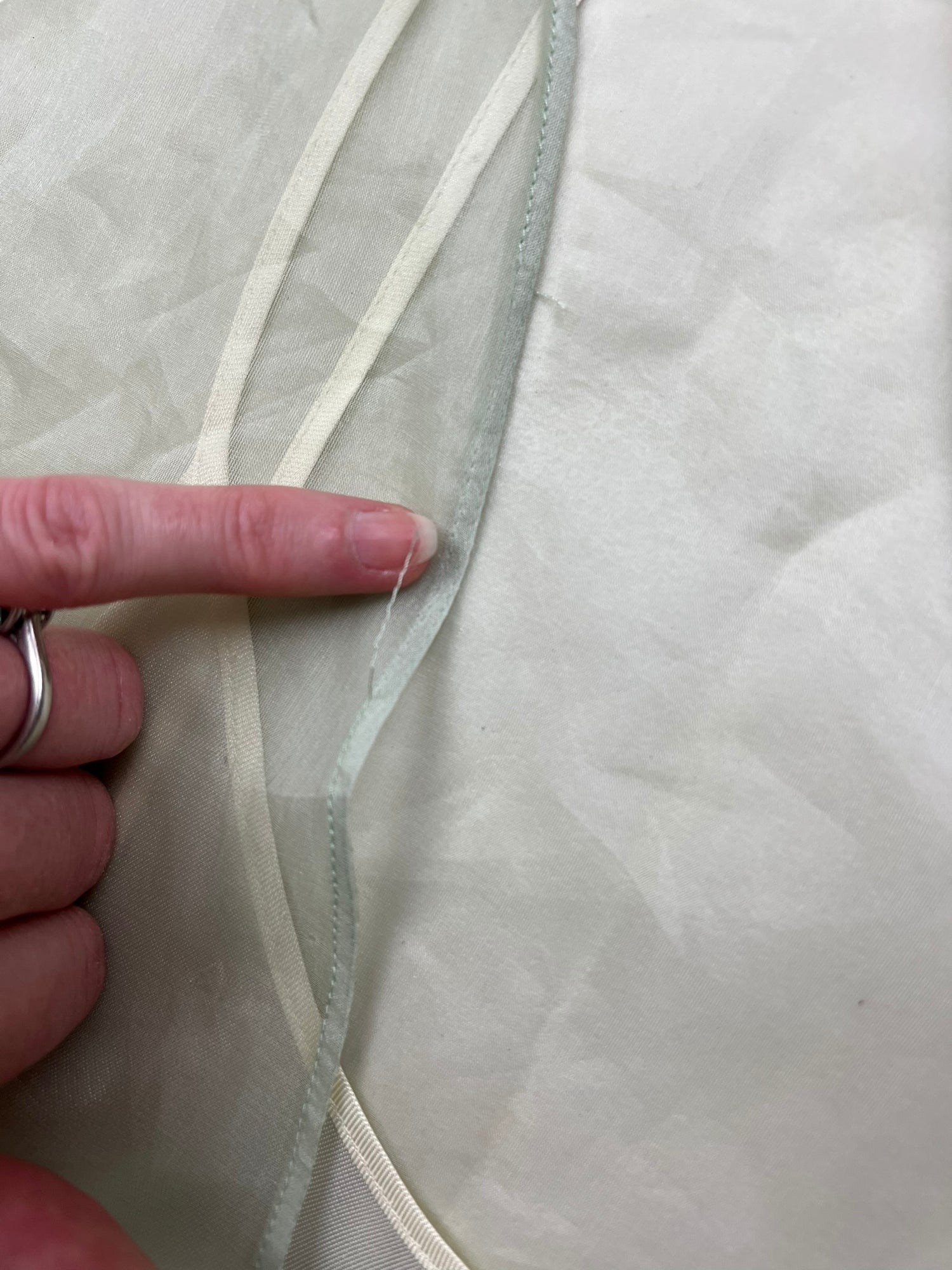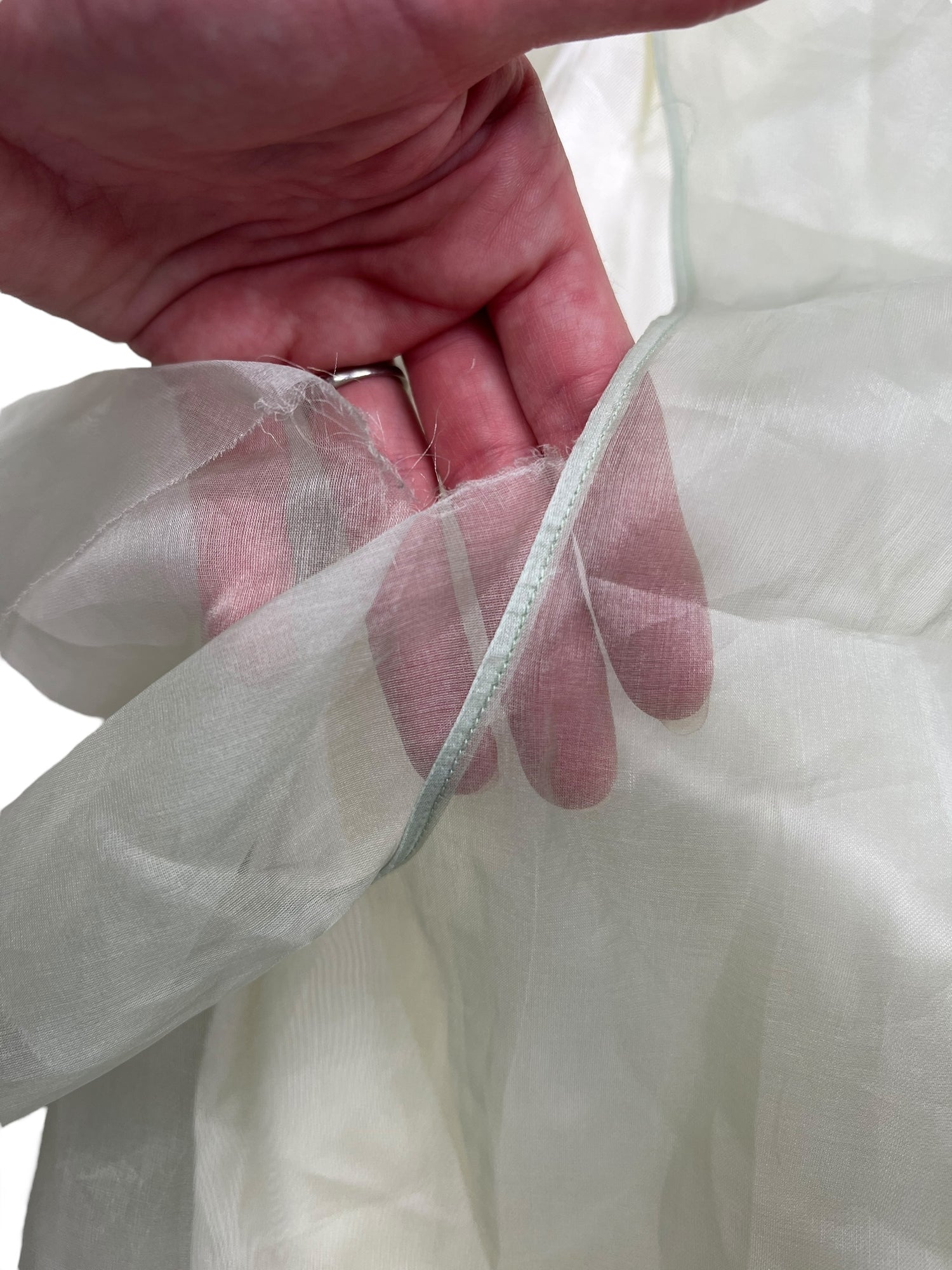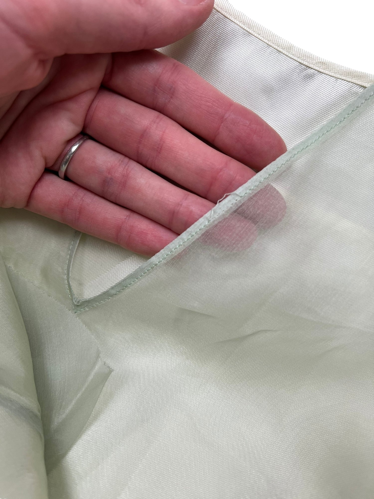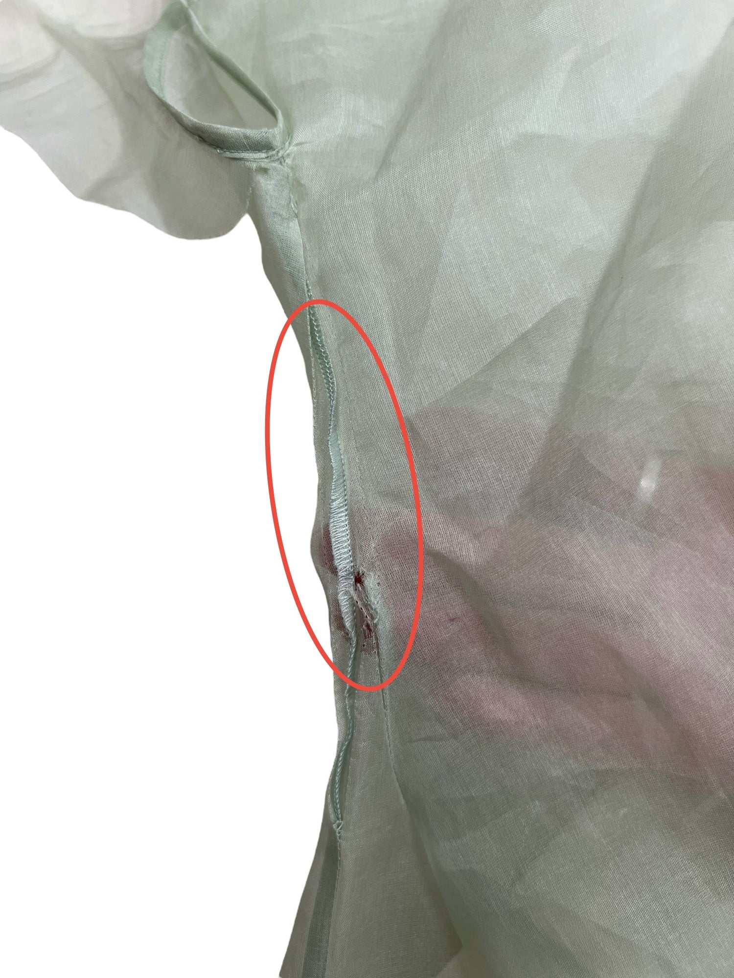 🫶 Condition is new with tags and defects. Some small imperfections throughout including a small rip on bottom hem, two tears where ruffle attachments attach to main body (not really noticeable unless you look closely and inspect with your hands), pulled threads on some seams. An area of residue where sticky labour was attached to inside of under-slip (not noticeable when worn under ruffle dress. 100% silk green ruffle dress, 100% viscose rayon under-slip. Care label states not to wash and not to dry clean.
