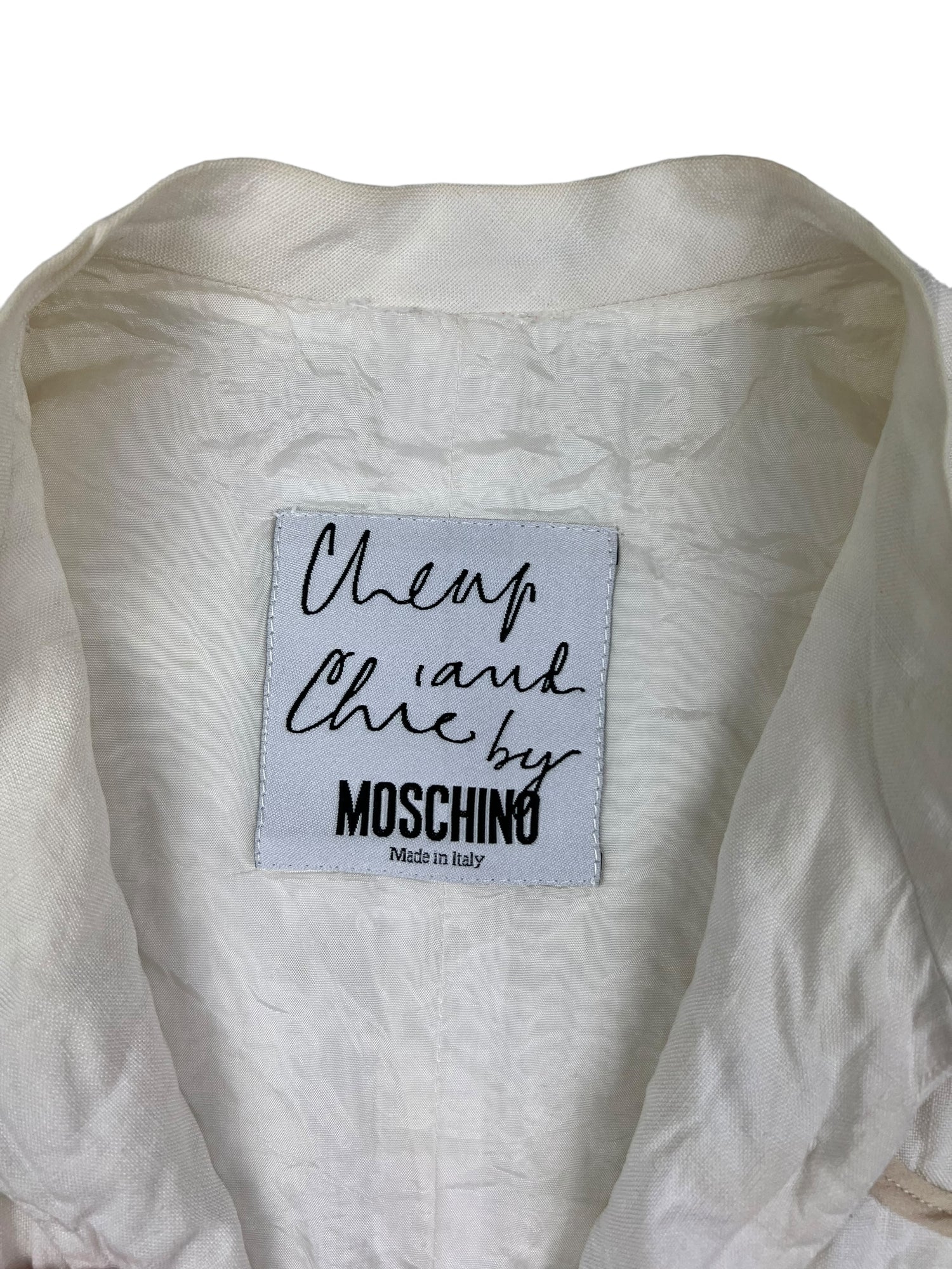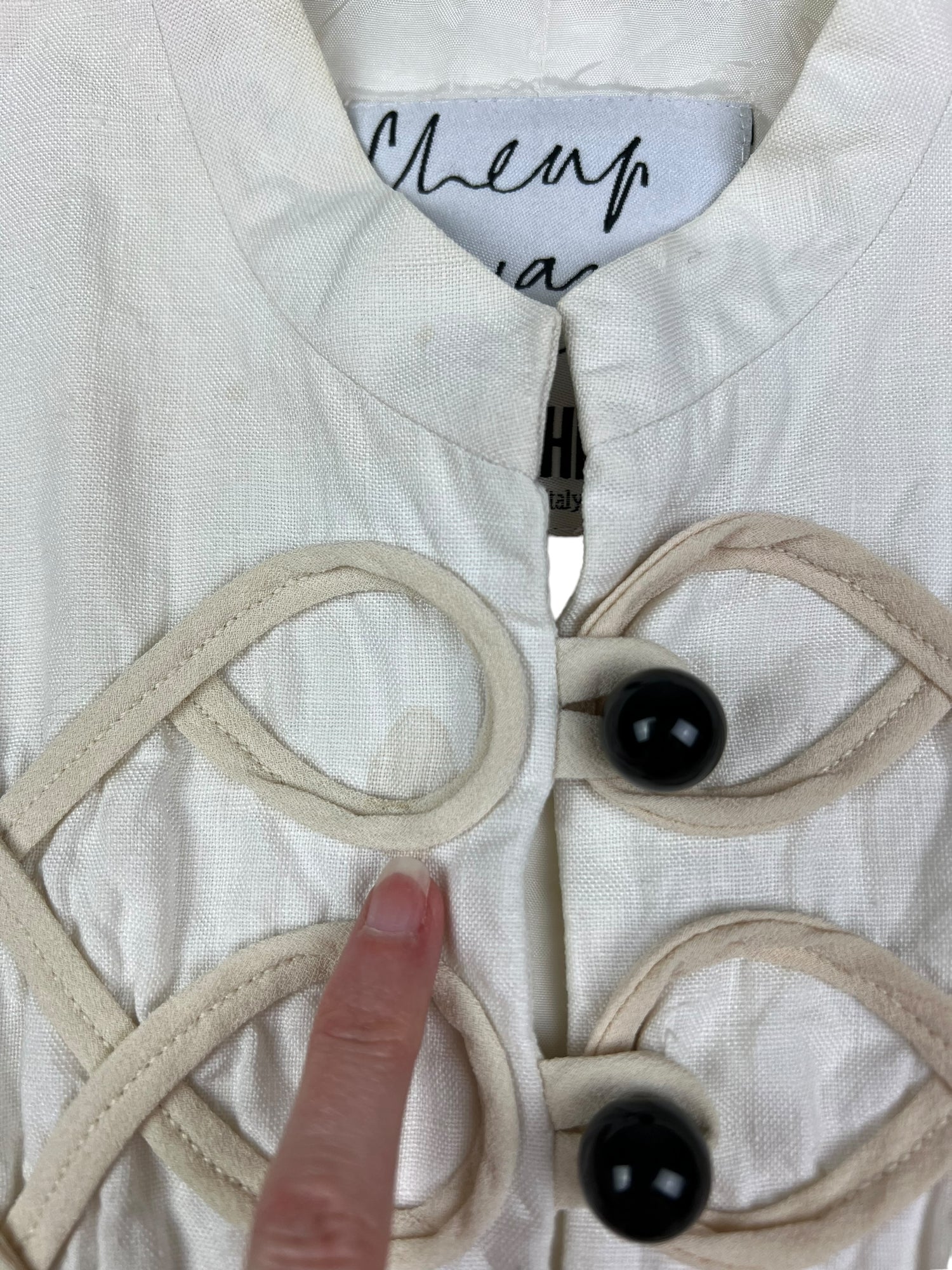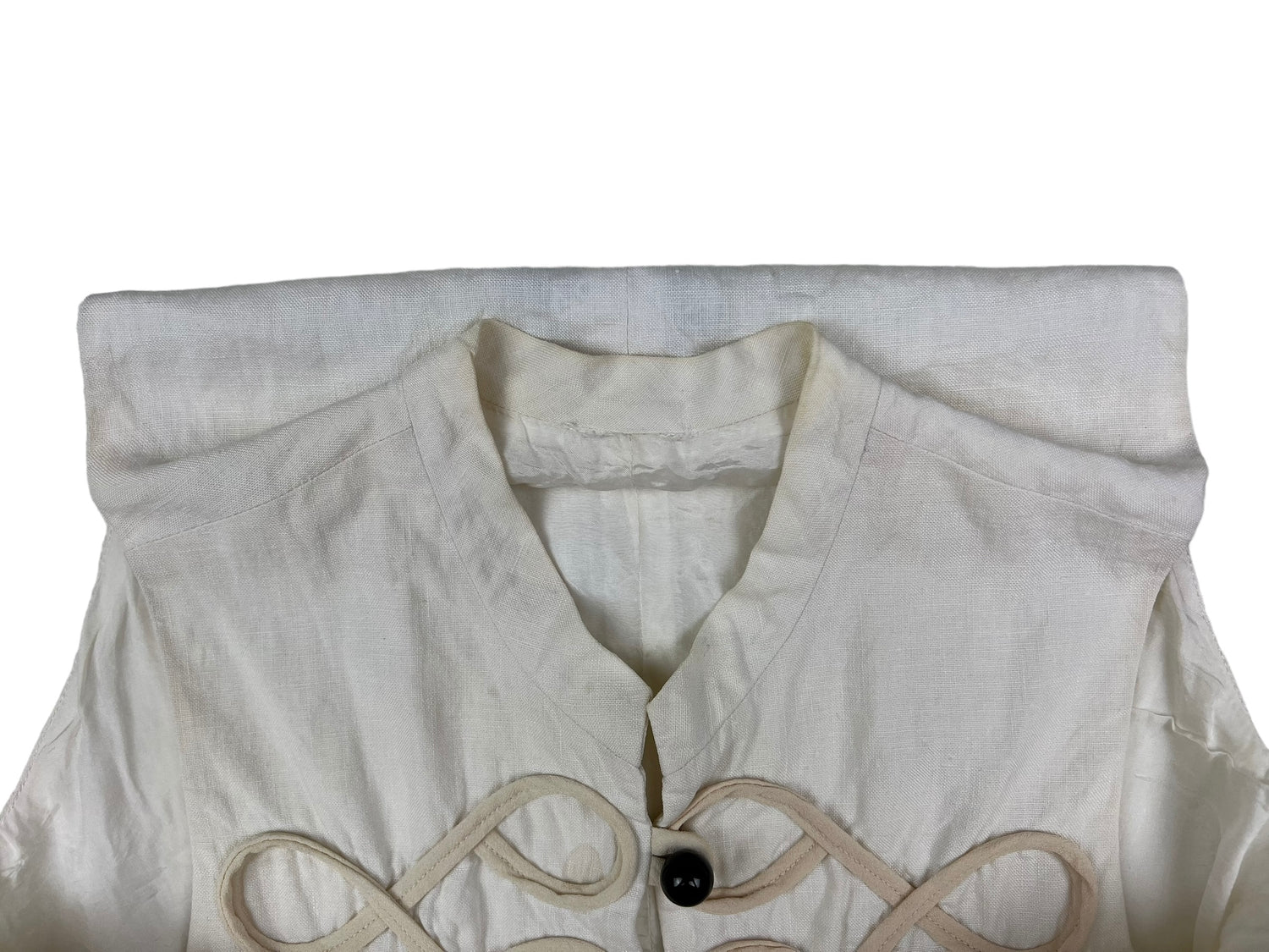 🫶 Condition is good considering age but it does have age-related light marks around armpits and collar. A small mark on front too as shown. I have gently hand washed in white vinegar and baking soda to clean the stains and this is as good as I can get it. Could be dyed a darker colour but the ribboning might not dye. All buttons secure. 100% linen outer. Acetate lining and rayon trimmings. Dry clean.