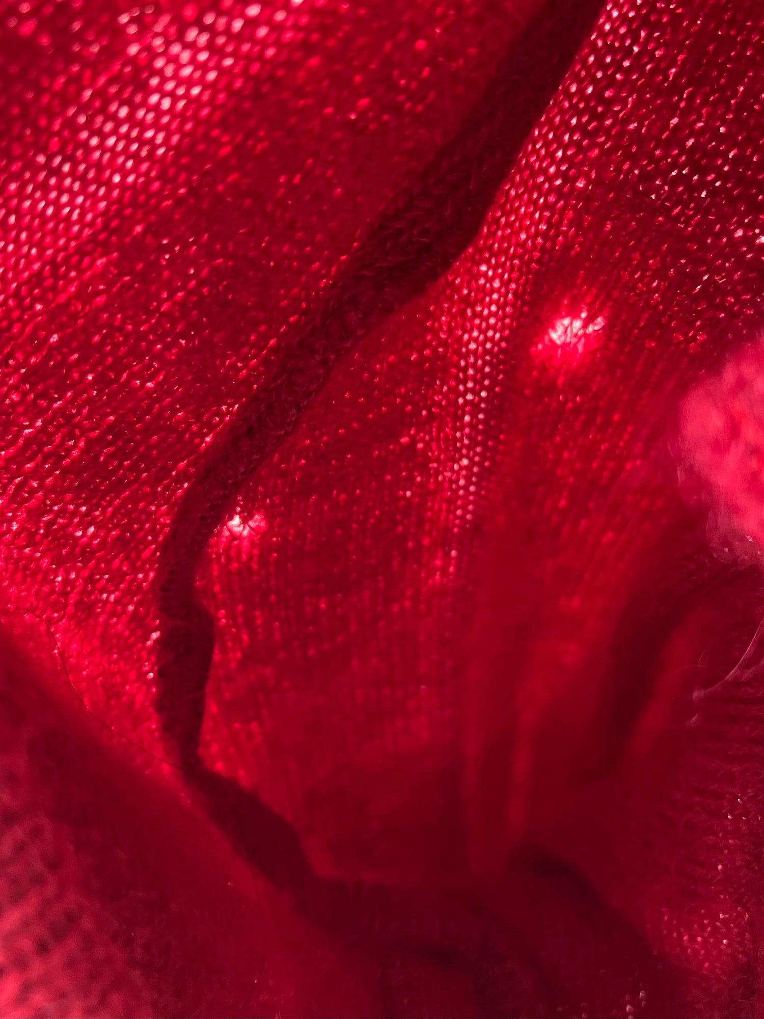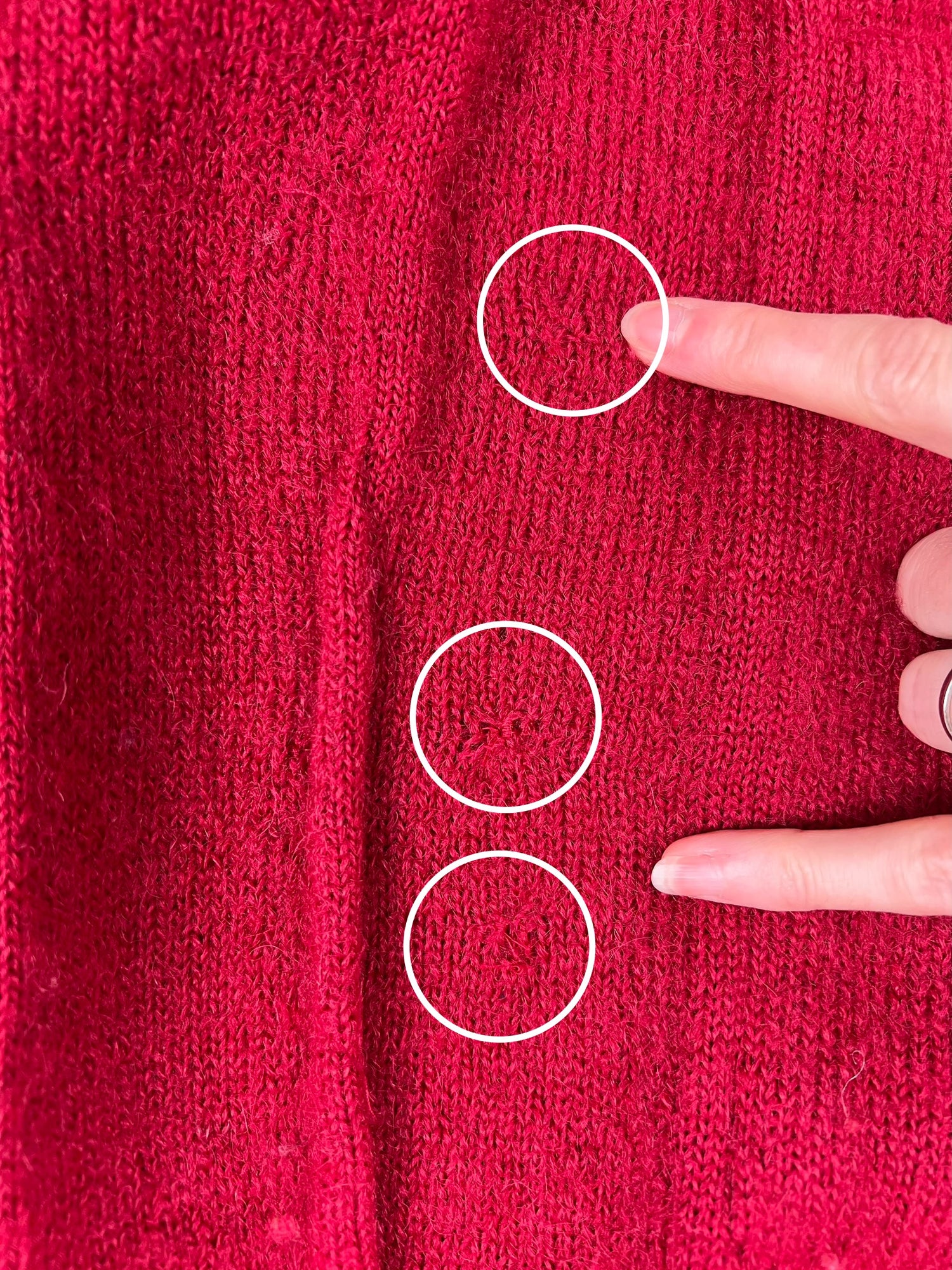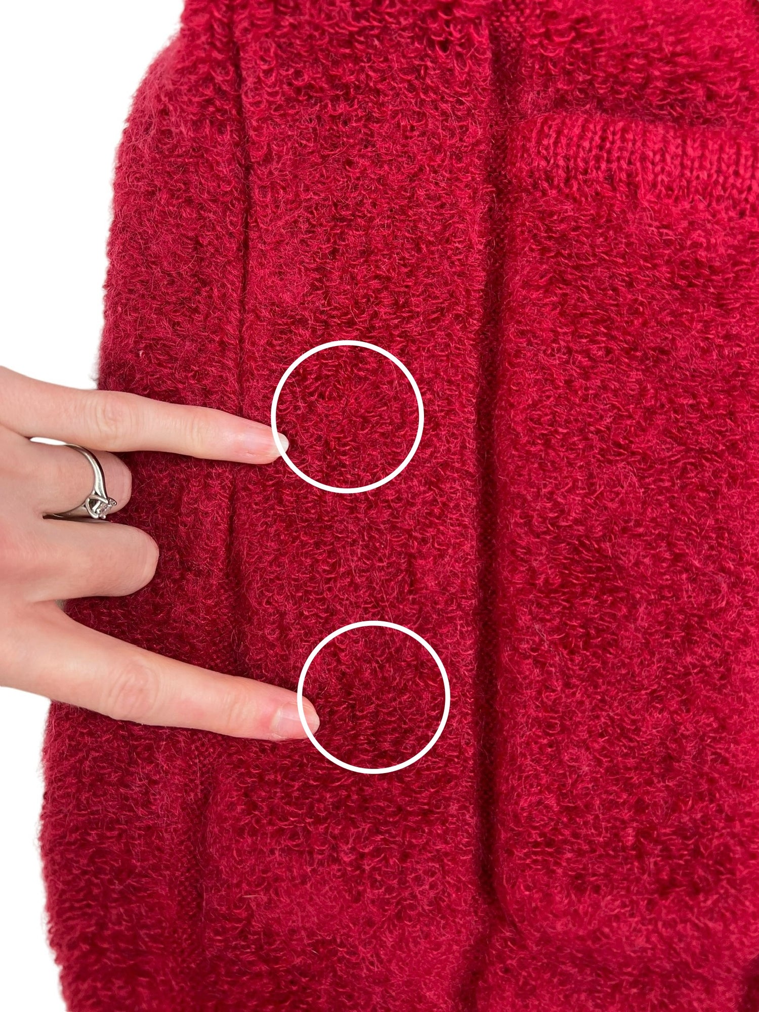 🐥 Condition is fair. Whilst is has no stains, it does have a lot of small holes throughout the centre back area, and shoulder. It has some crude but almost invisible repairs near one pocket as shown. The holes really aren’t visible when worn due to the thick fluffy knit, but you may wish to have them repaired in future to prevent them getting larger. No bad odour. Armpits and collar clean. 90% mohair, 10% nylon. Dry clean only.