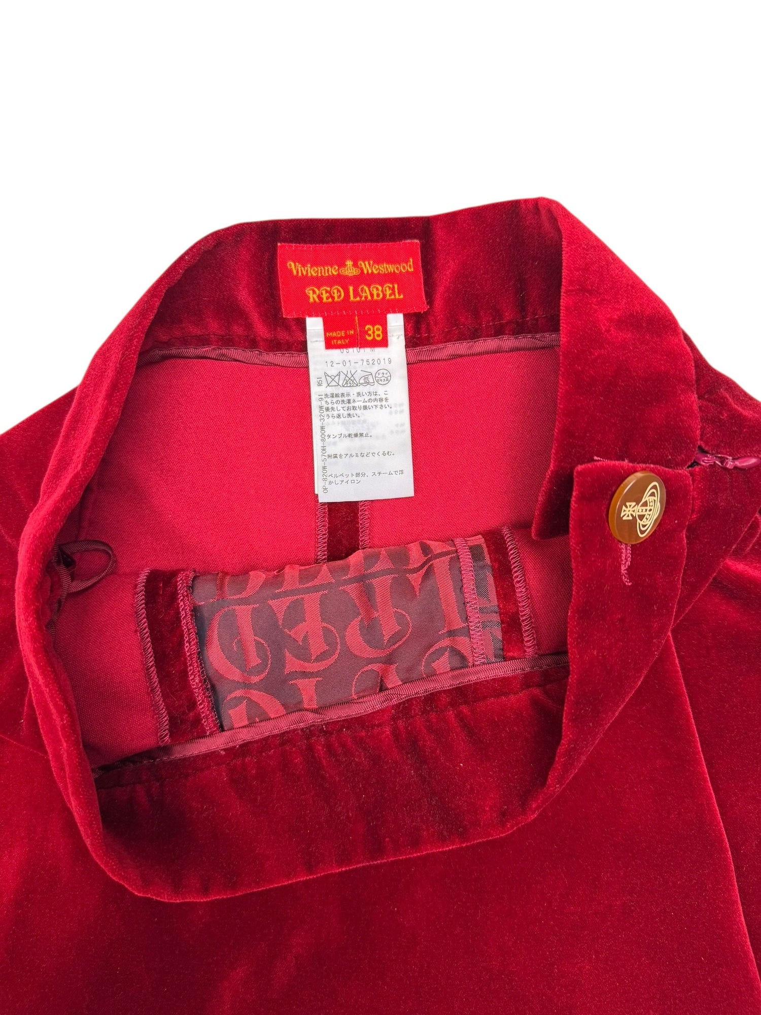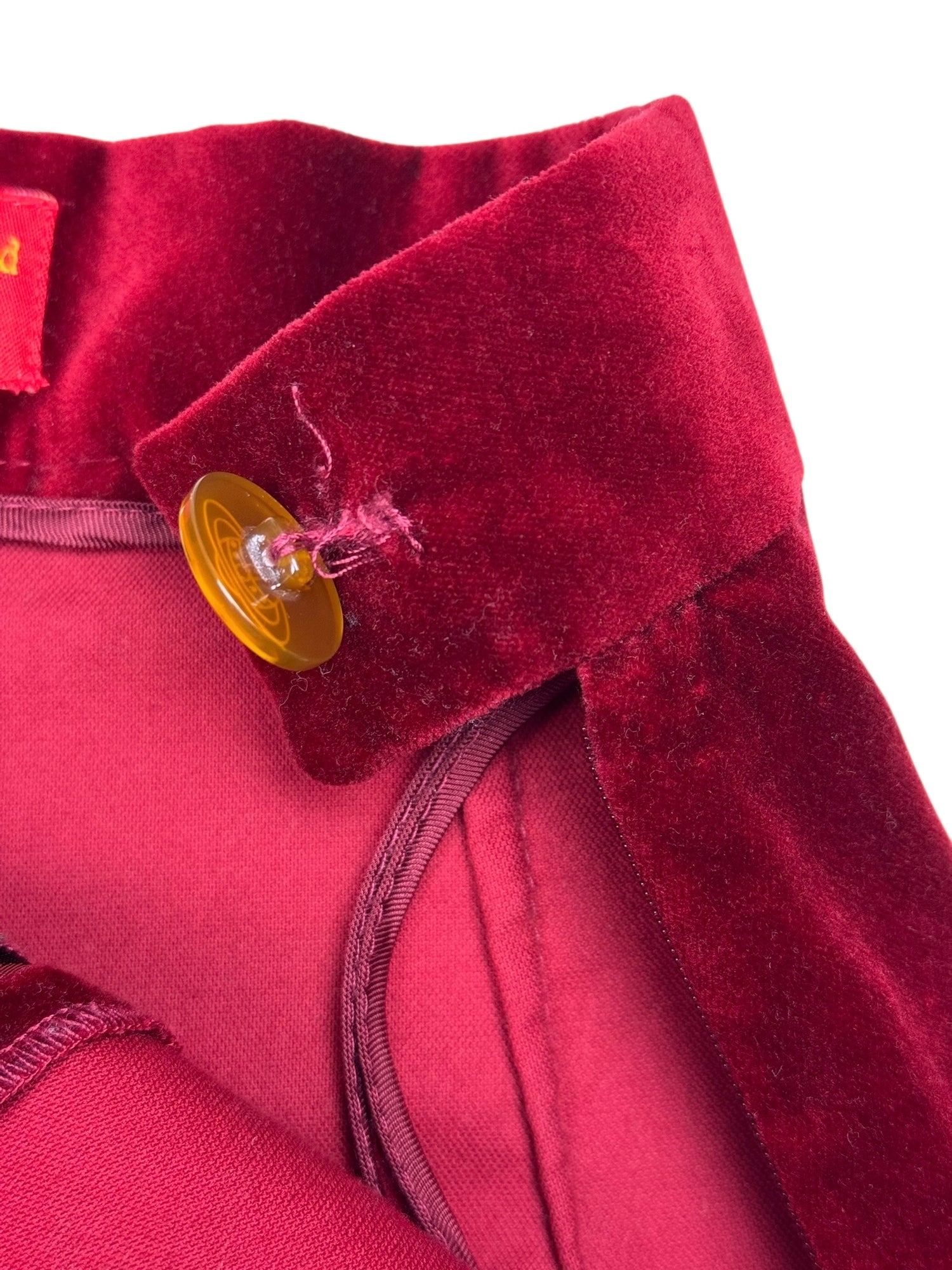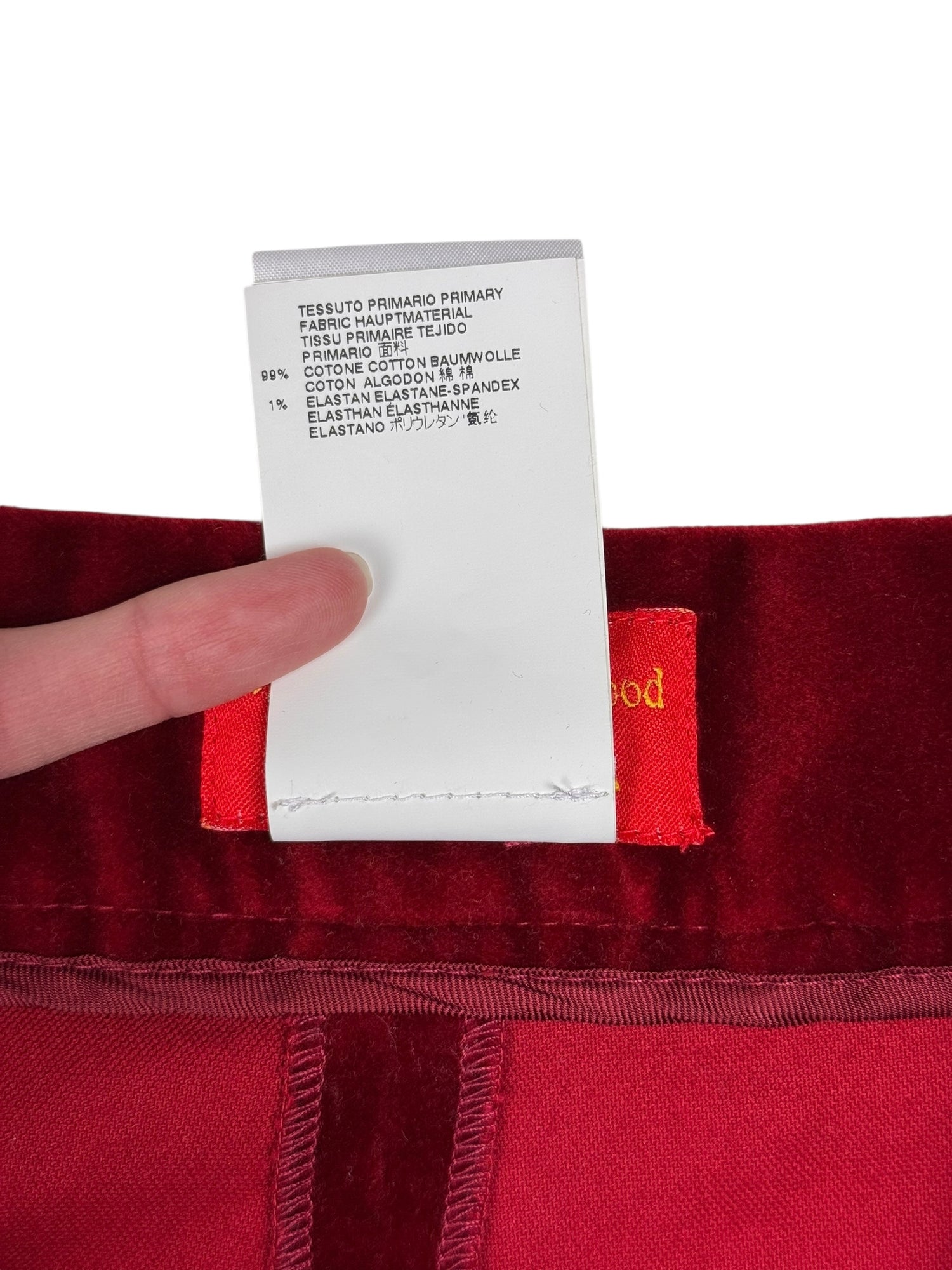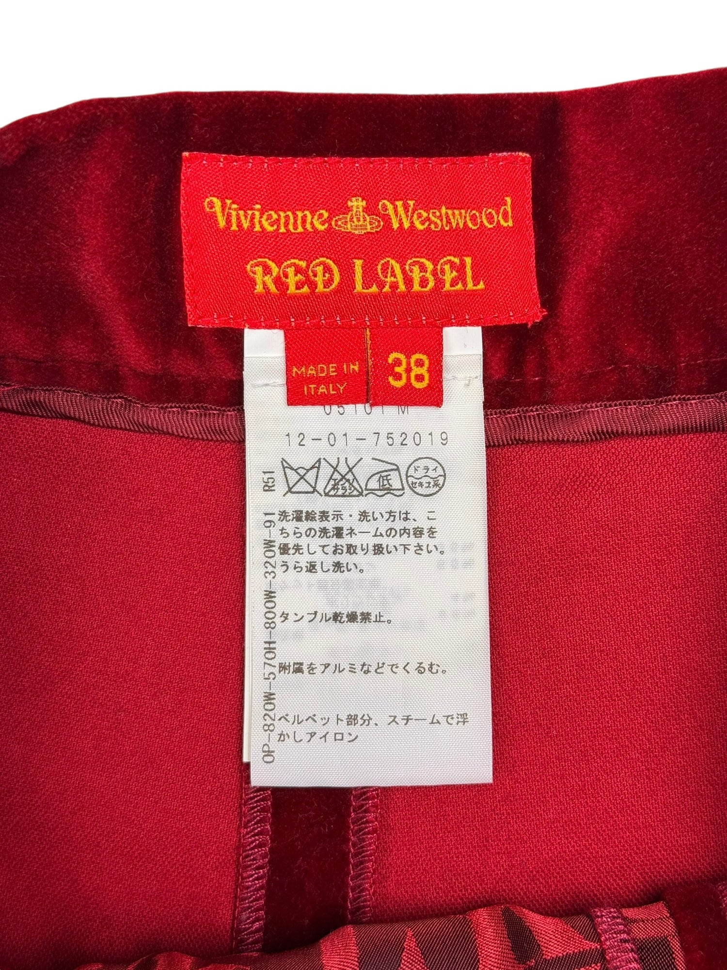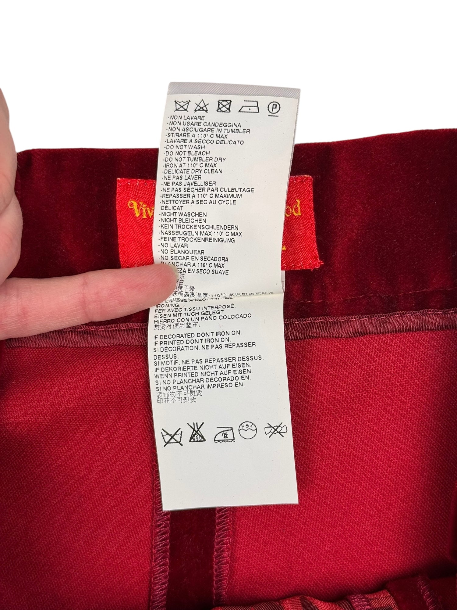 Vivienne Westwood 2015 Red Label red velvet Skort. These are the Japanese label so weren’t on show on the runway but there are similar pieces on the FW 2014 London/Paris shows which hark back to early 90s velvet pieces. Pleat skirt at front and shorts at the back. Size UK8. I also have this in brown herringbone in size UK10 in a seperate listing. The have a quirky small hidden ‘pocket’ or pouch on the front where the material folds over. All details below👇