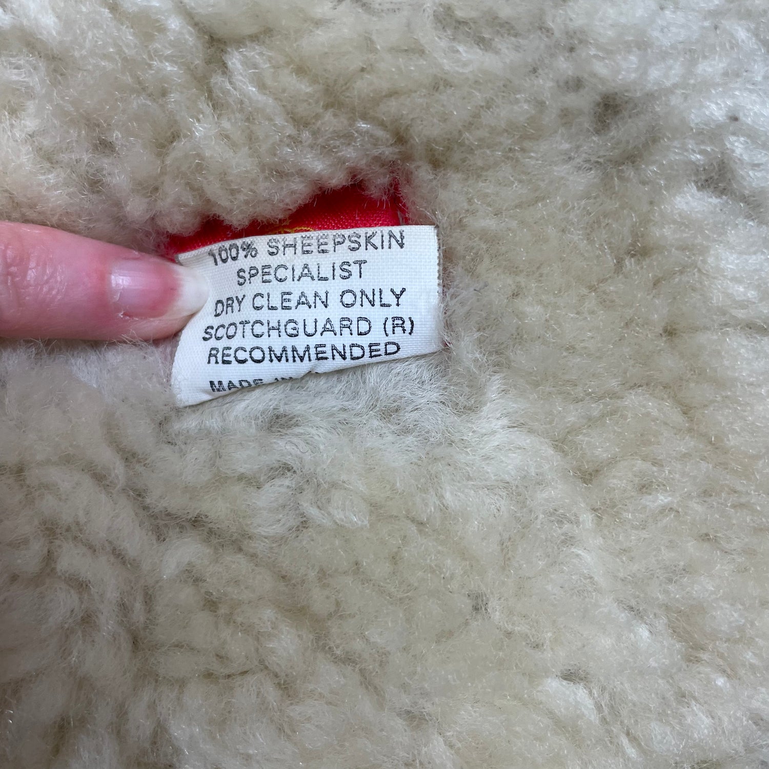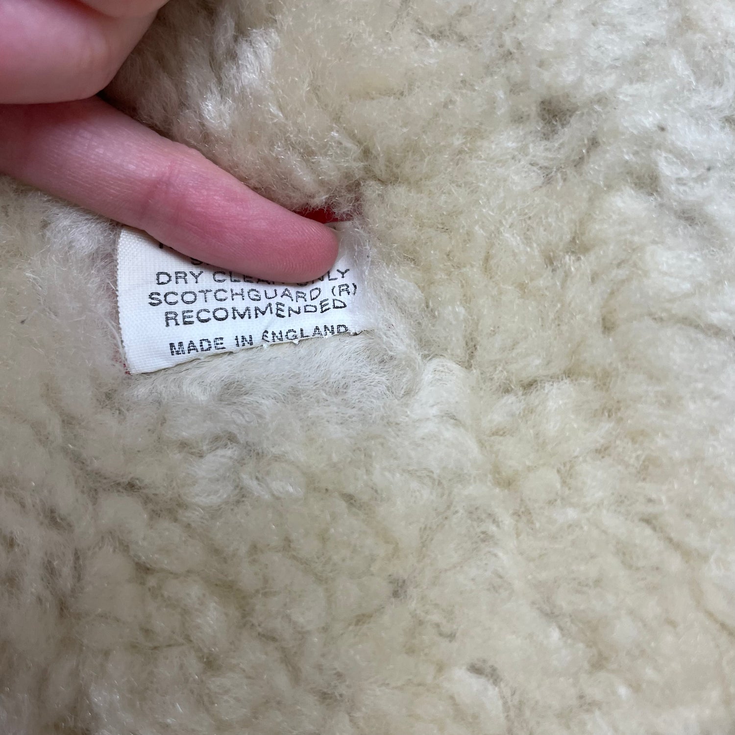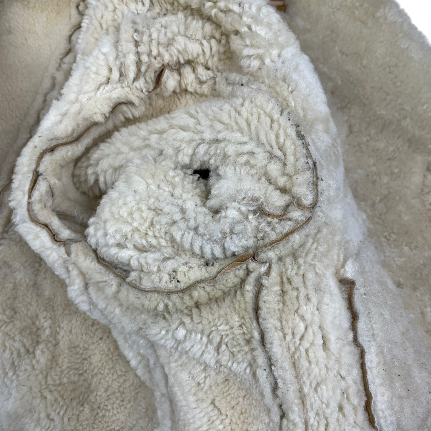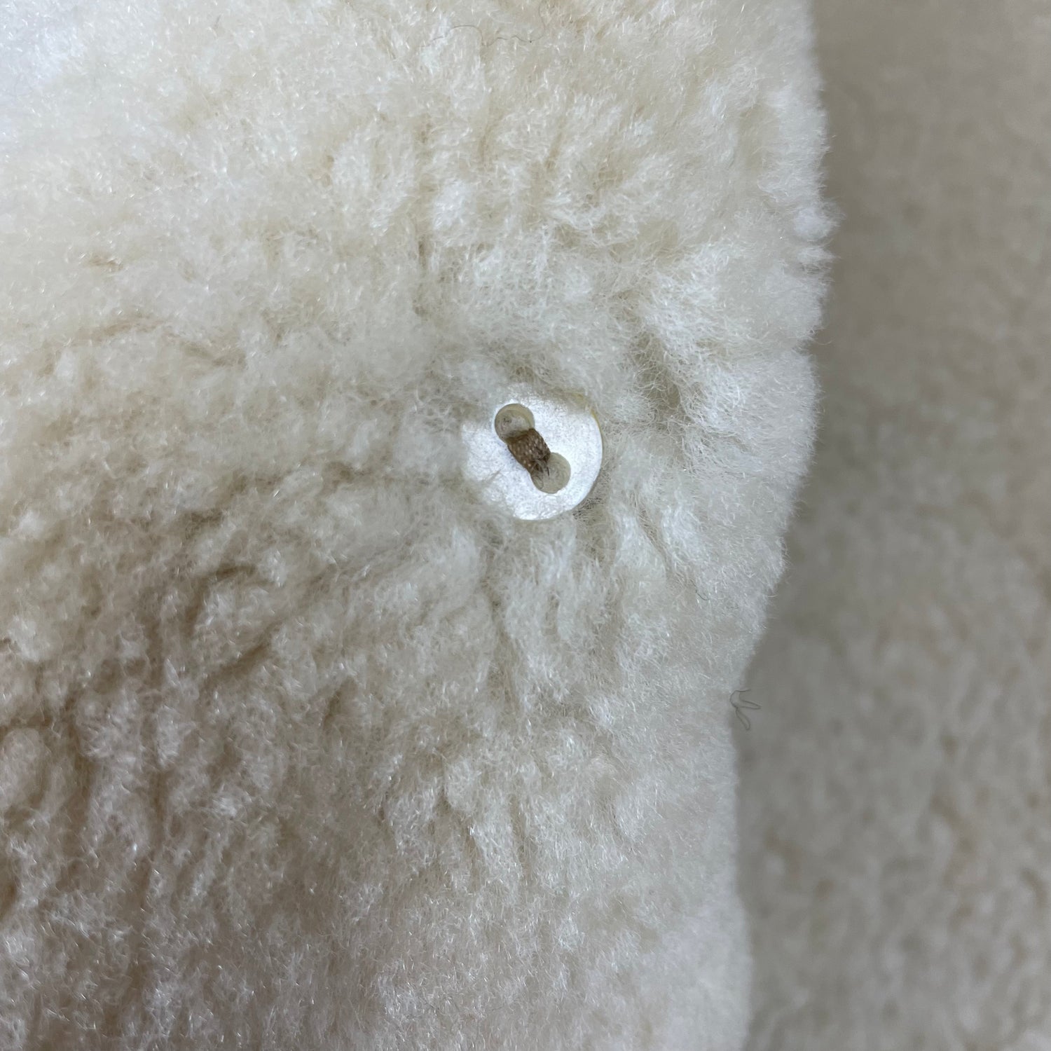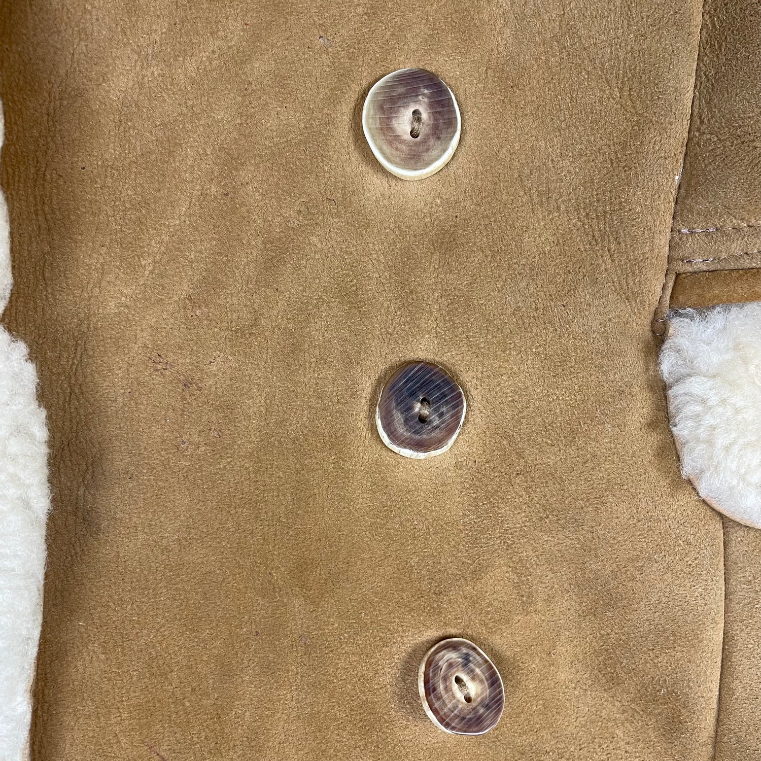 Condition: light marks throughout but no significant stains. No holes, no bad or stale odour. All horn buttons securely fixed and each have a small transparent plastic button attached to the back to secure. 100% sheepskin, specialist dry clean only.
