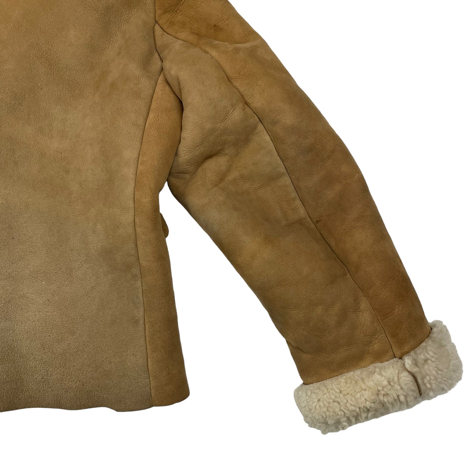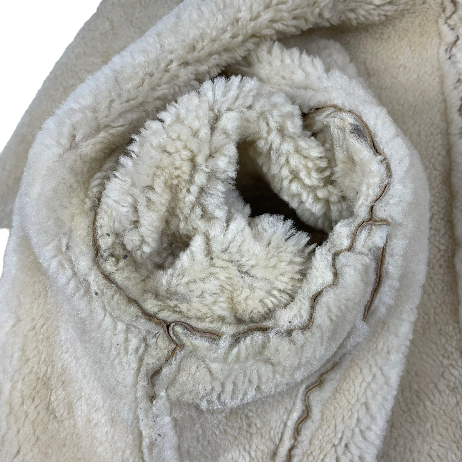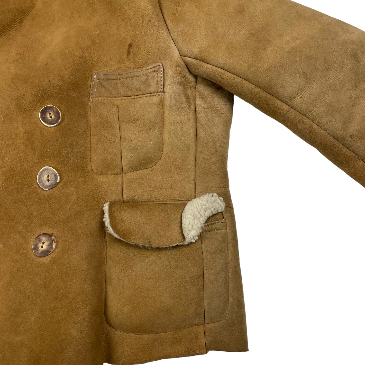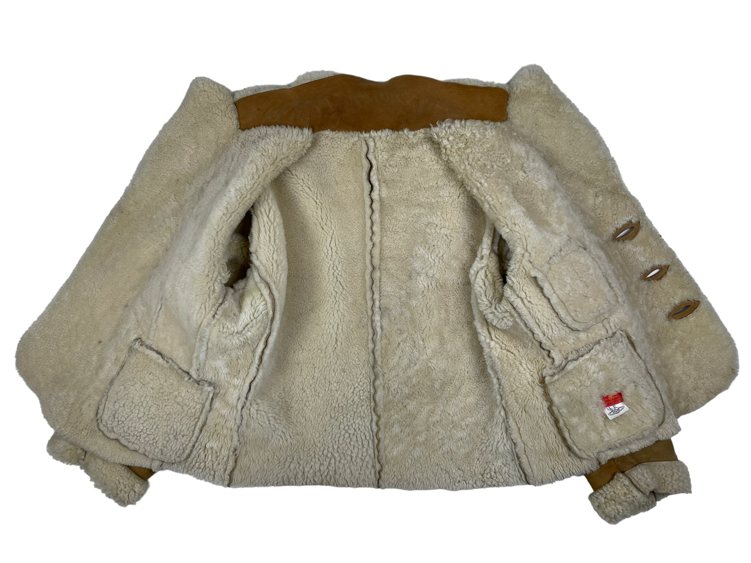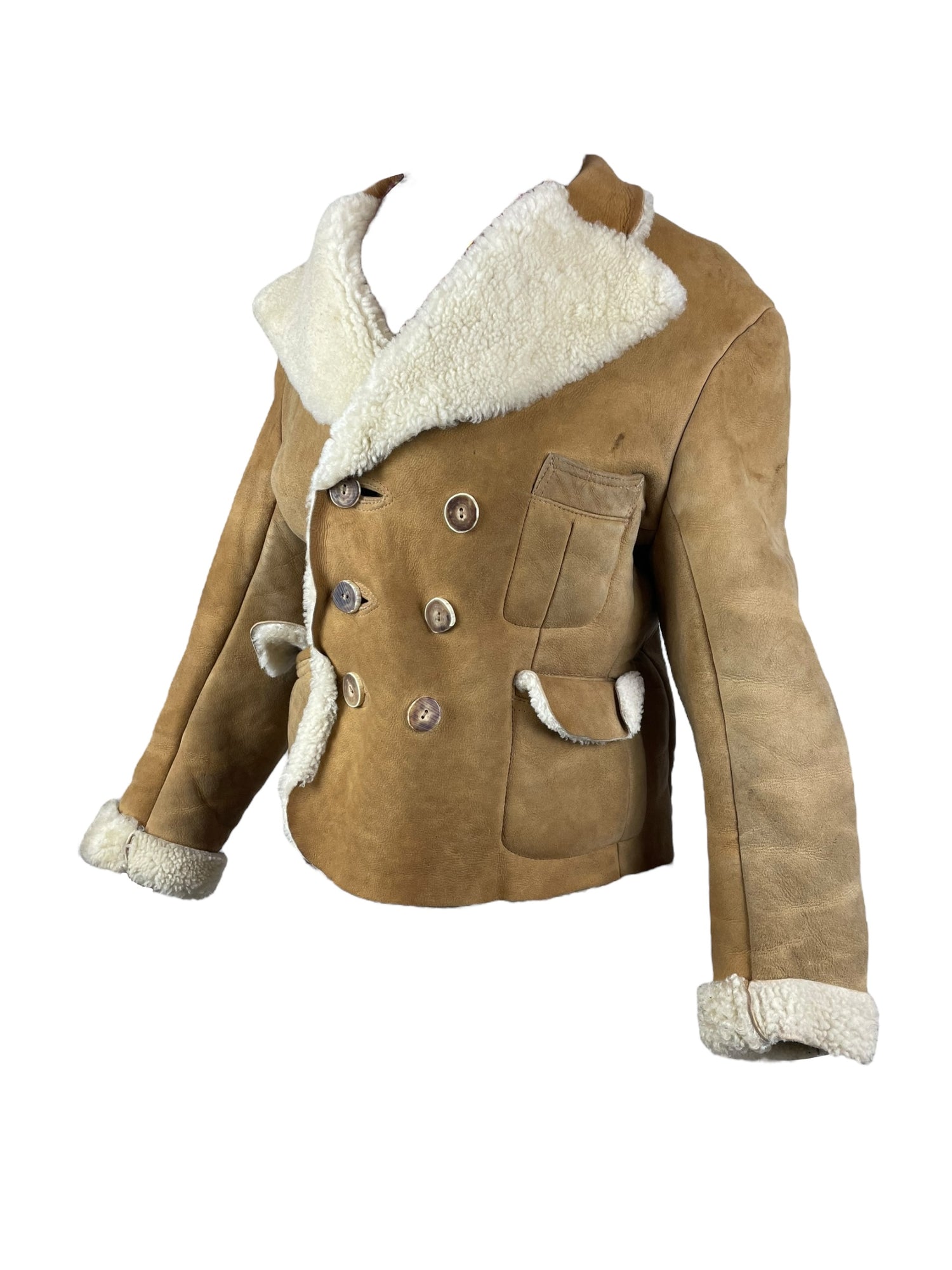 Condition: light marks throughout but no significant stains. No holes, no bad or stale odour. All horn buttons securely fixed and each have a small transparent plastic button attached to the back to secure. 100% sheepskin, specialist dry clean only.