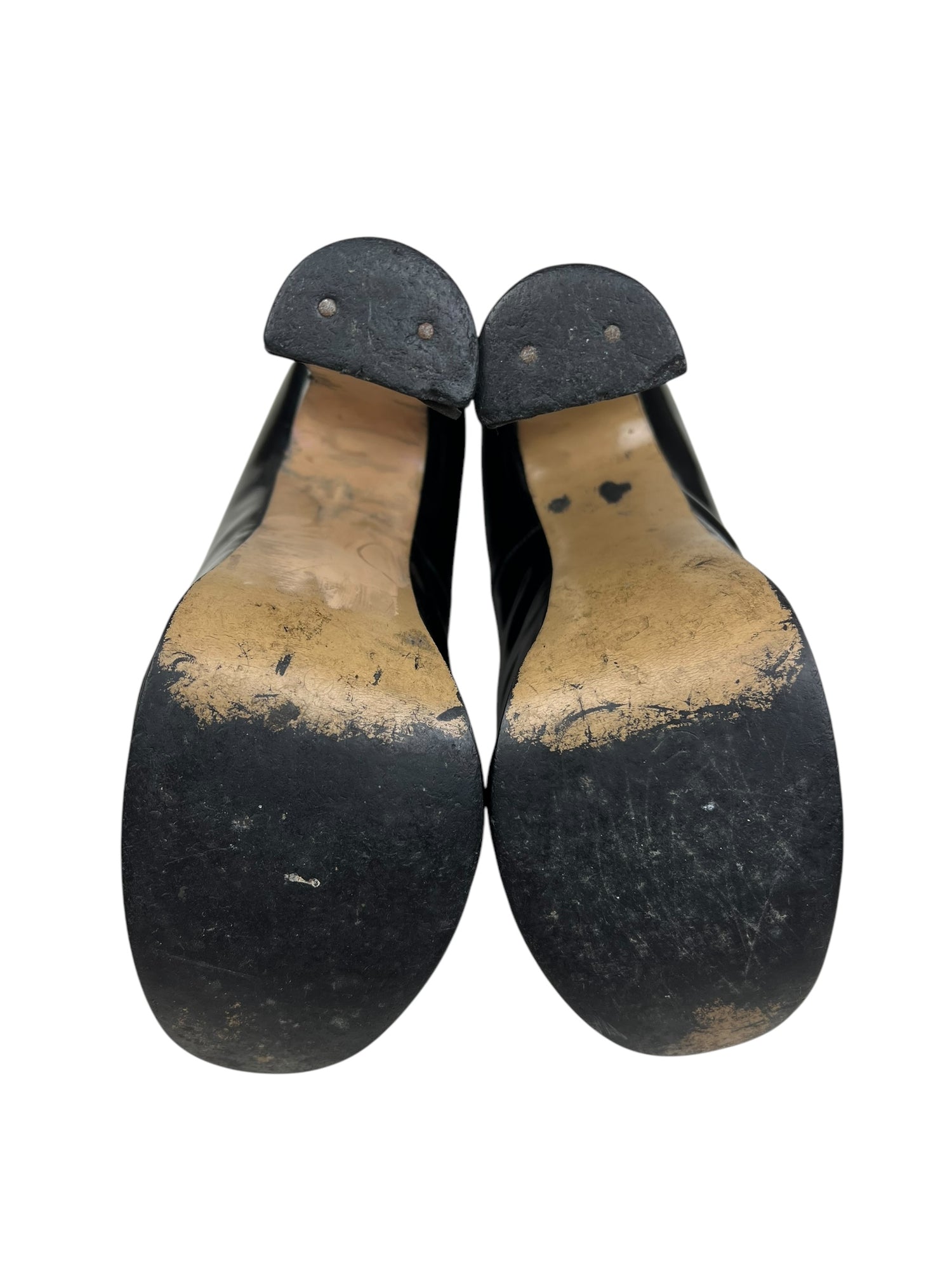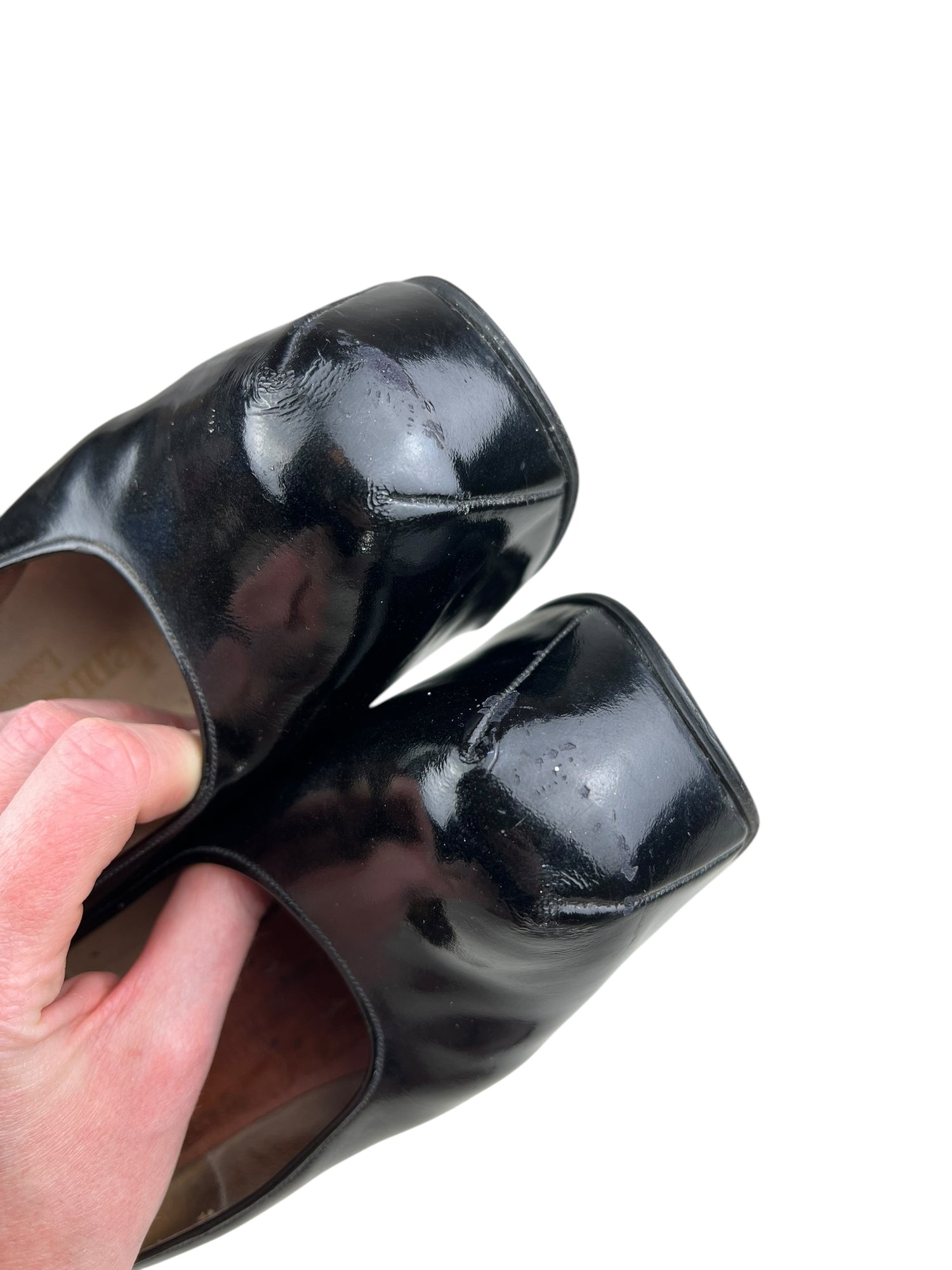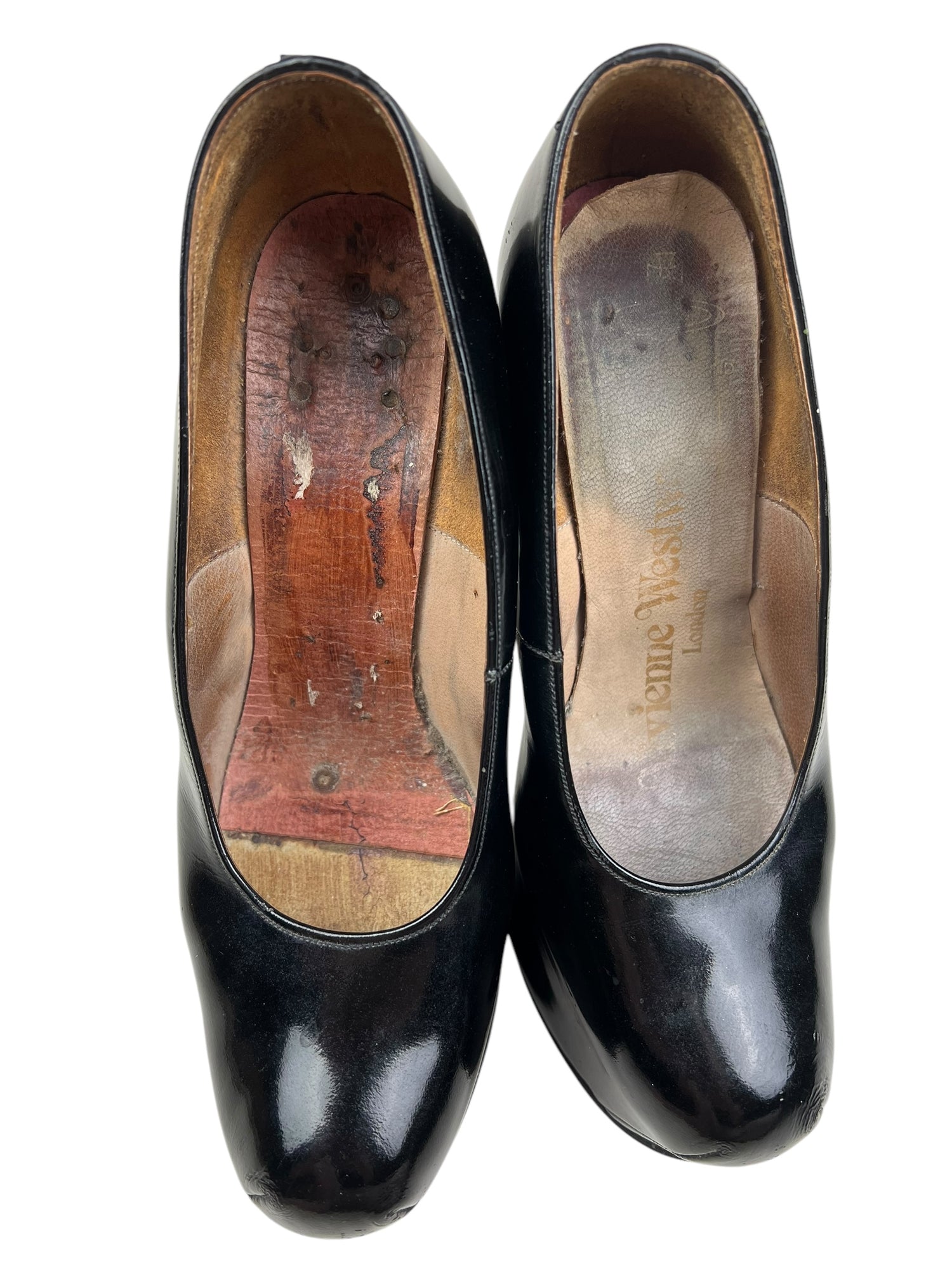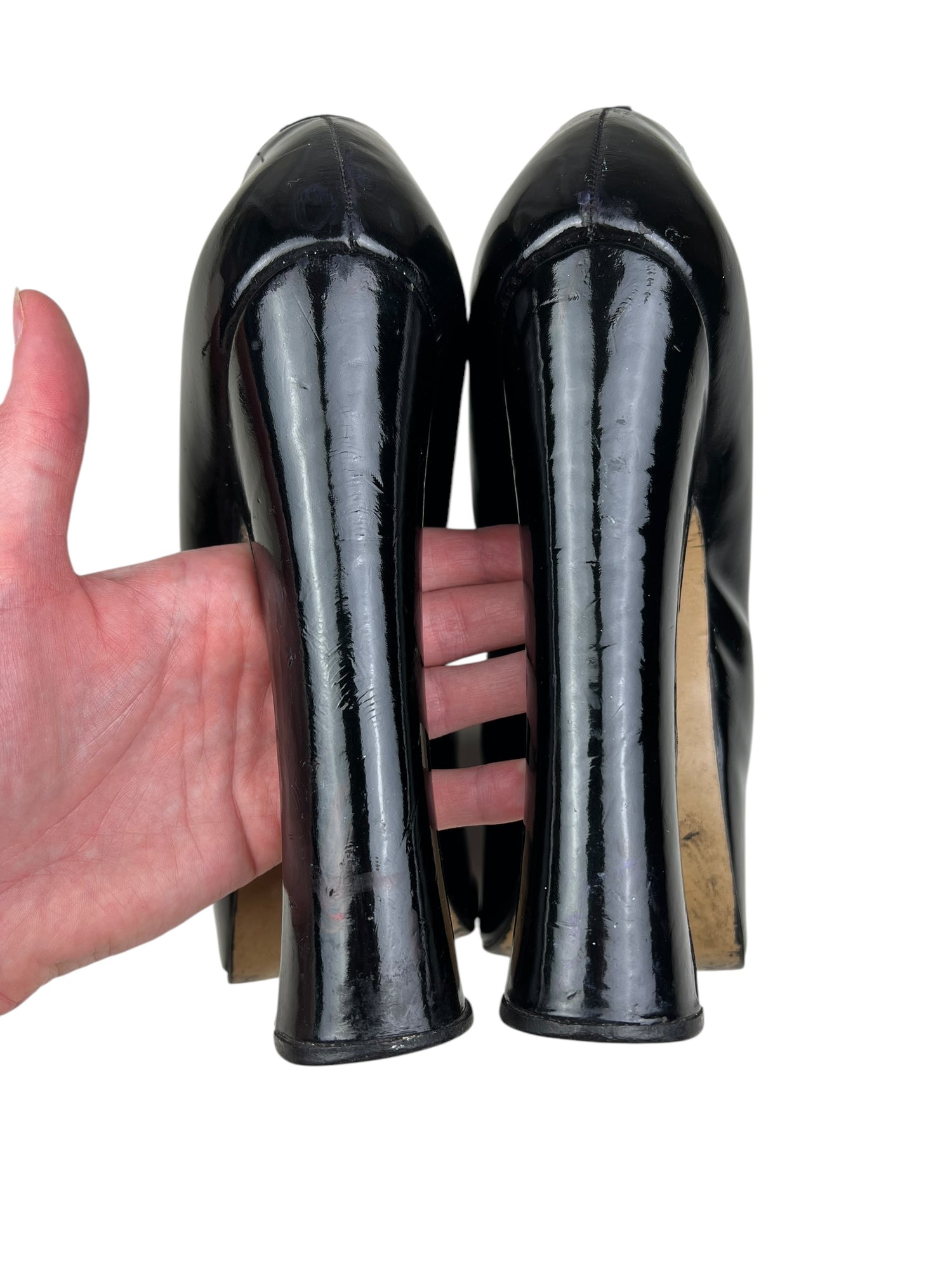👢Condition is preloved with signs of wear, but structurally sound. Still a show stopping historical archival collectors piece. There are scuffs throughout - please zoom in on pictures and examine closely. Patent leather in good condition with a few scuffs to toes, some creasing and small dents throughout. Heels evenly worn and still have lots of life. Inner sole missing from right shoe but easy to replace and isn’t uncomfortable to wear in current condition. Left inner sole loose and would benefit from glueing down. Soles have been painted in areas, presumably to hide scuffs. 100% leather. No original box. I will send in a secure replacement cardboard box with plenty of padding.