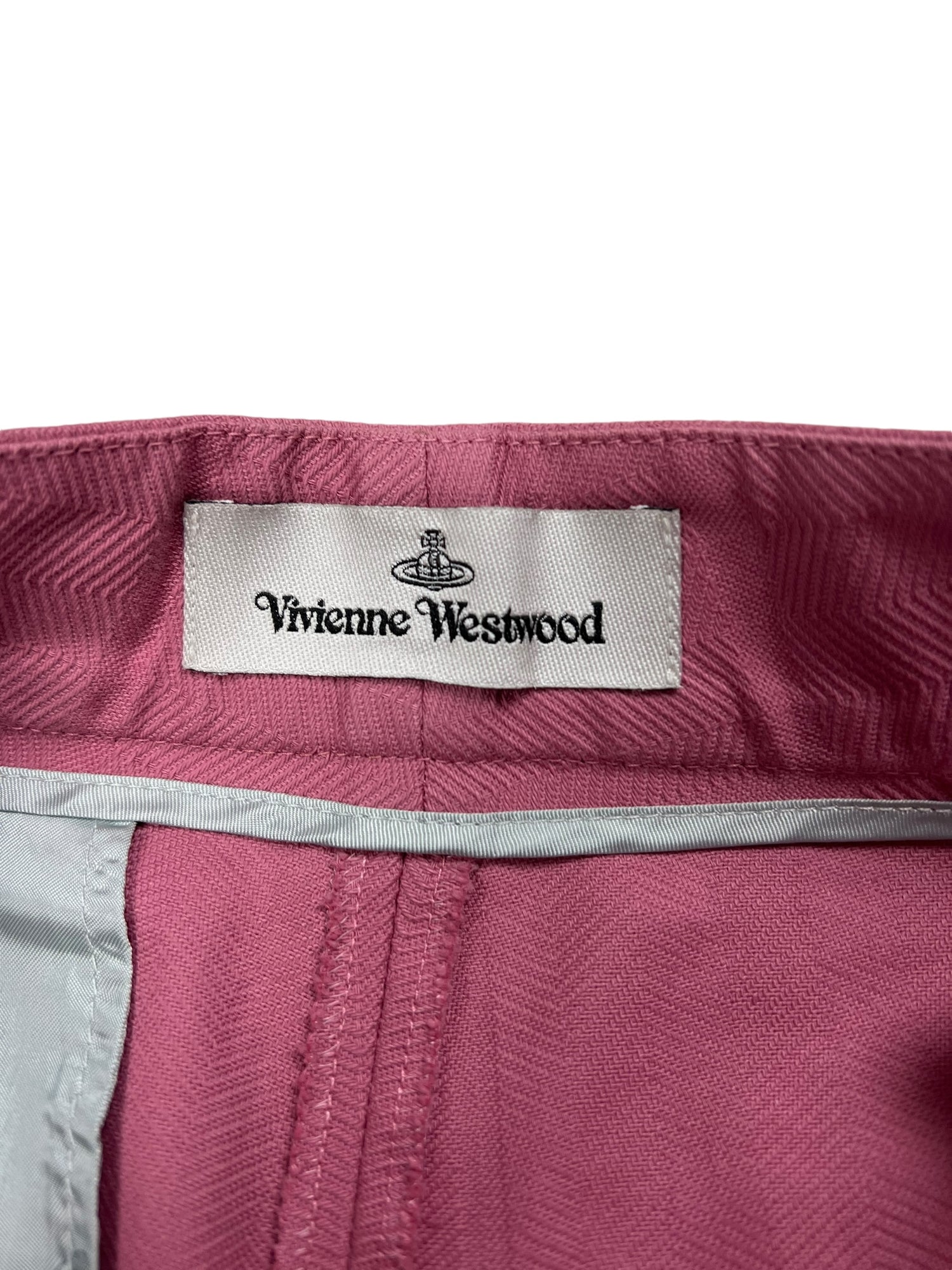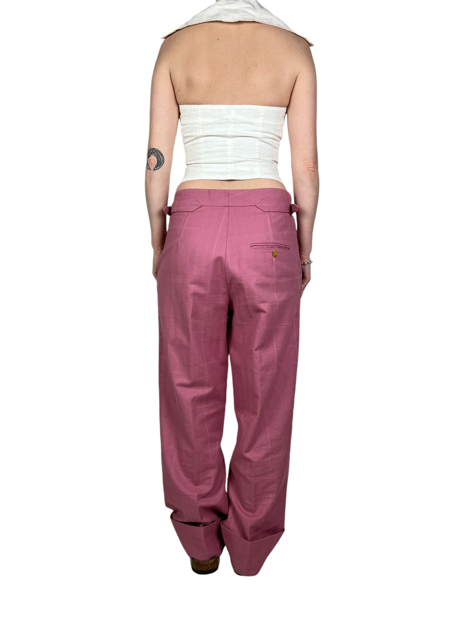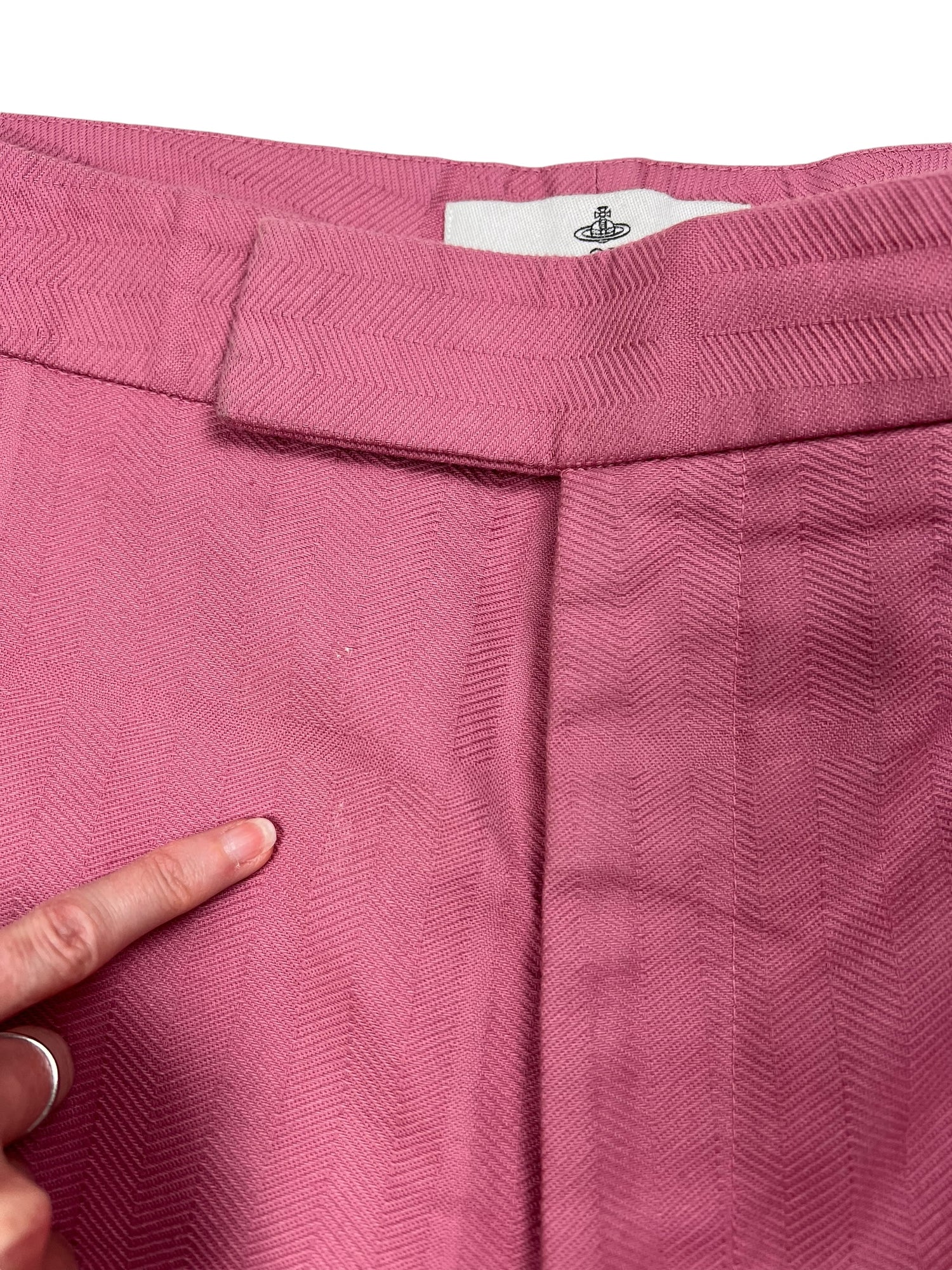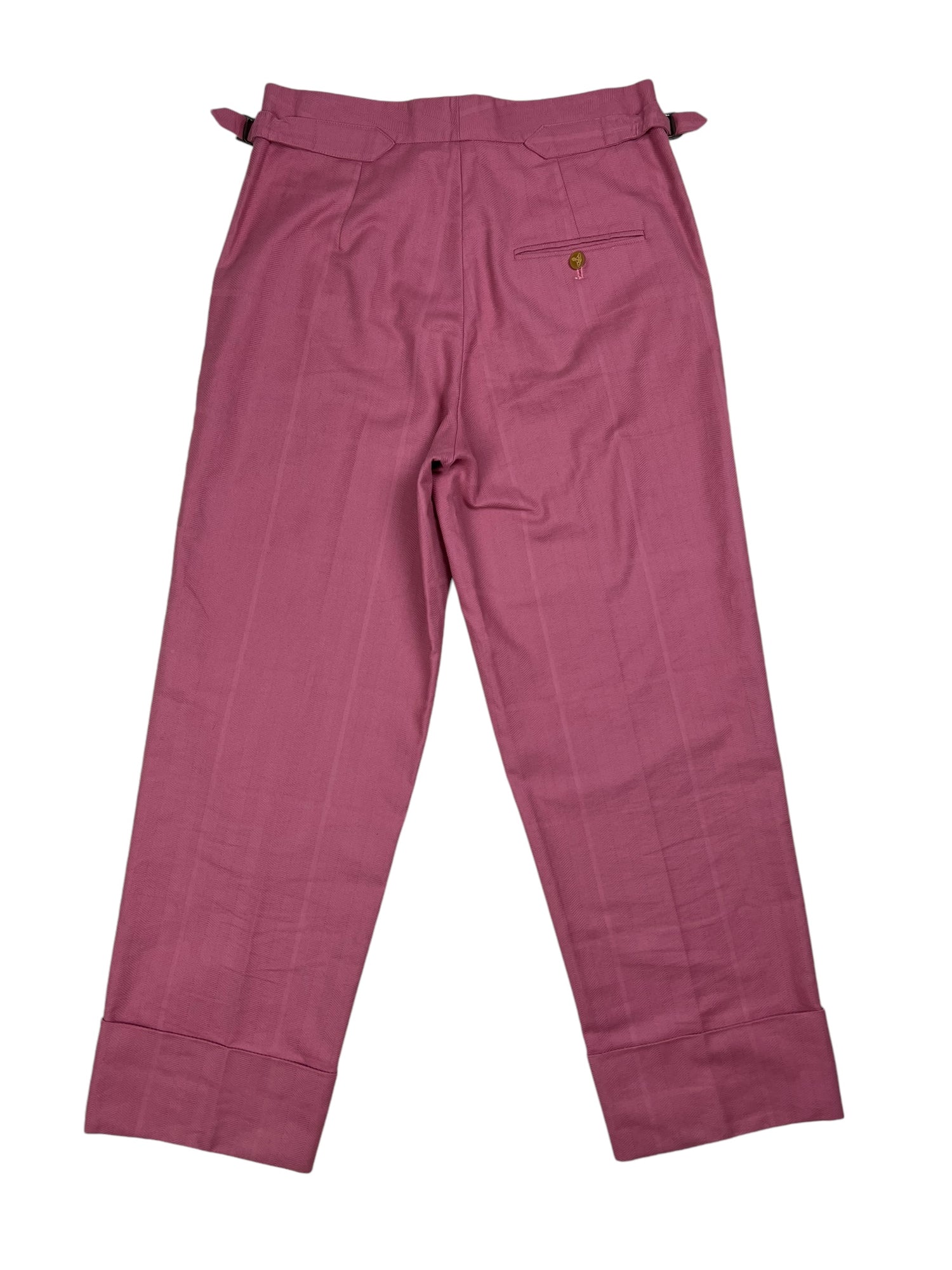 Vivienne Westwood F/W 2019 ‘Dave’ pink trousers. RRP £570. Herringbone stitch with a subtle large check pattern, in thick cotton. Straight leg with wide turn up ankle. Adjustable waist so fits UK10-12. All details below: