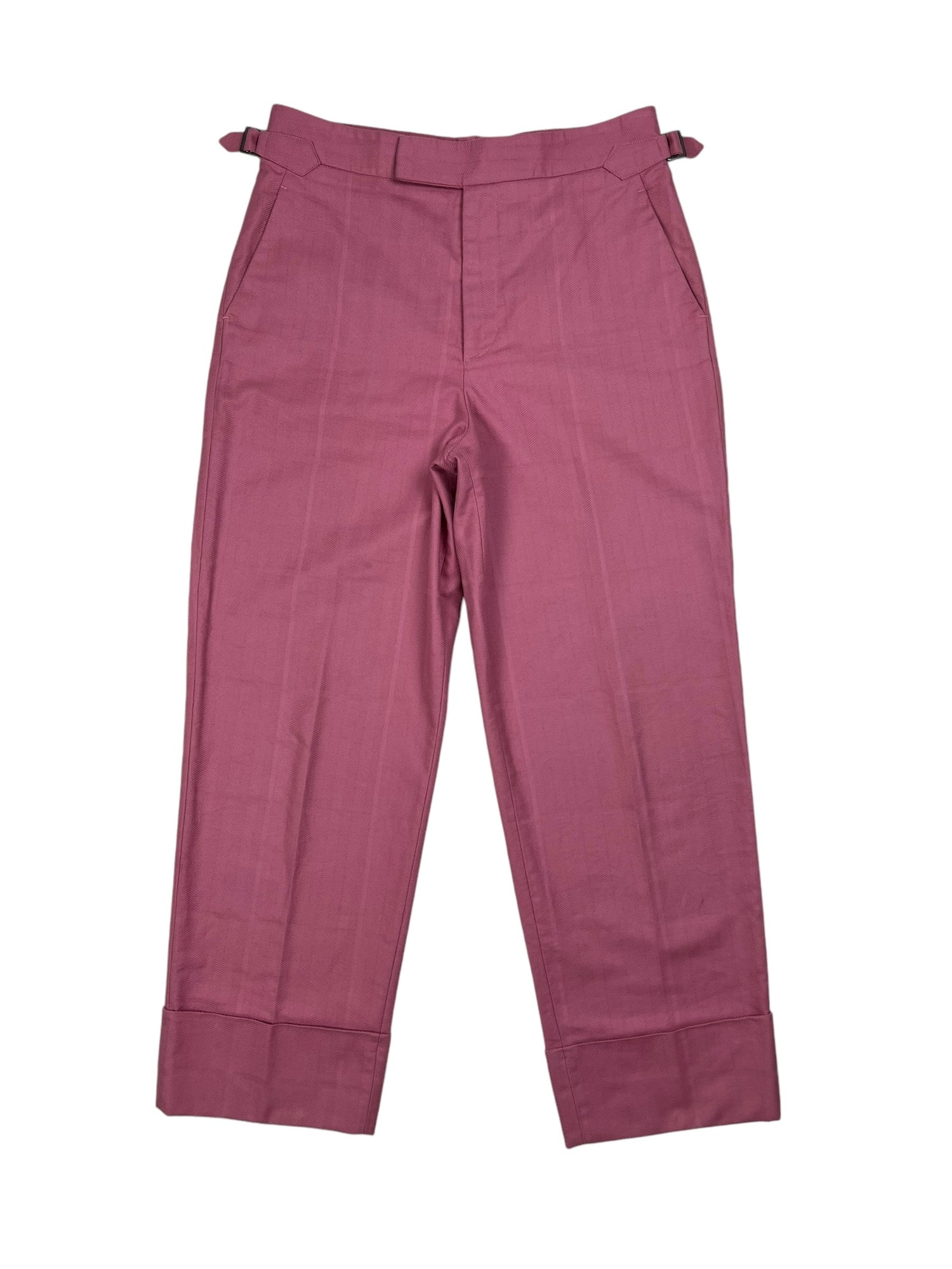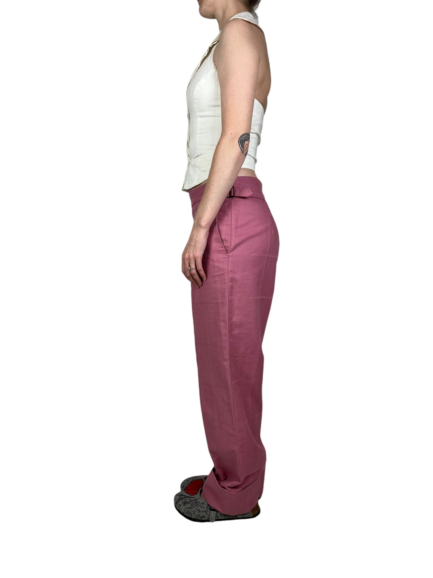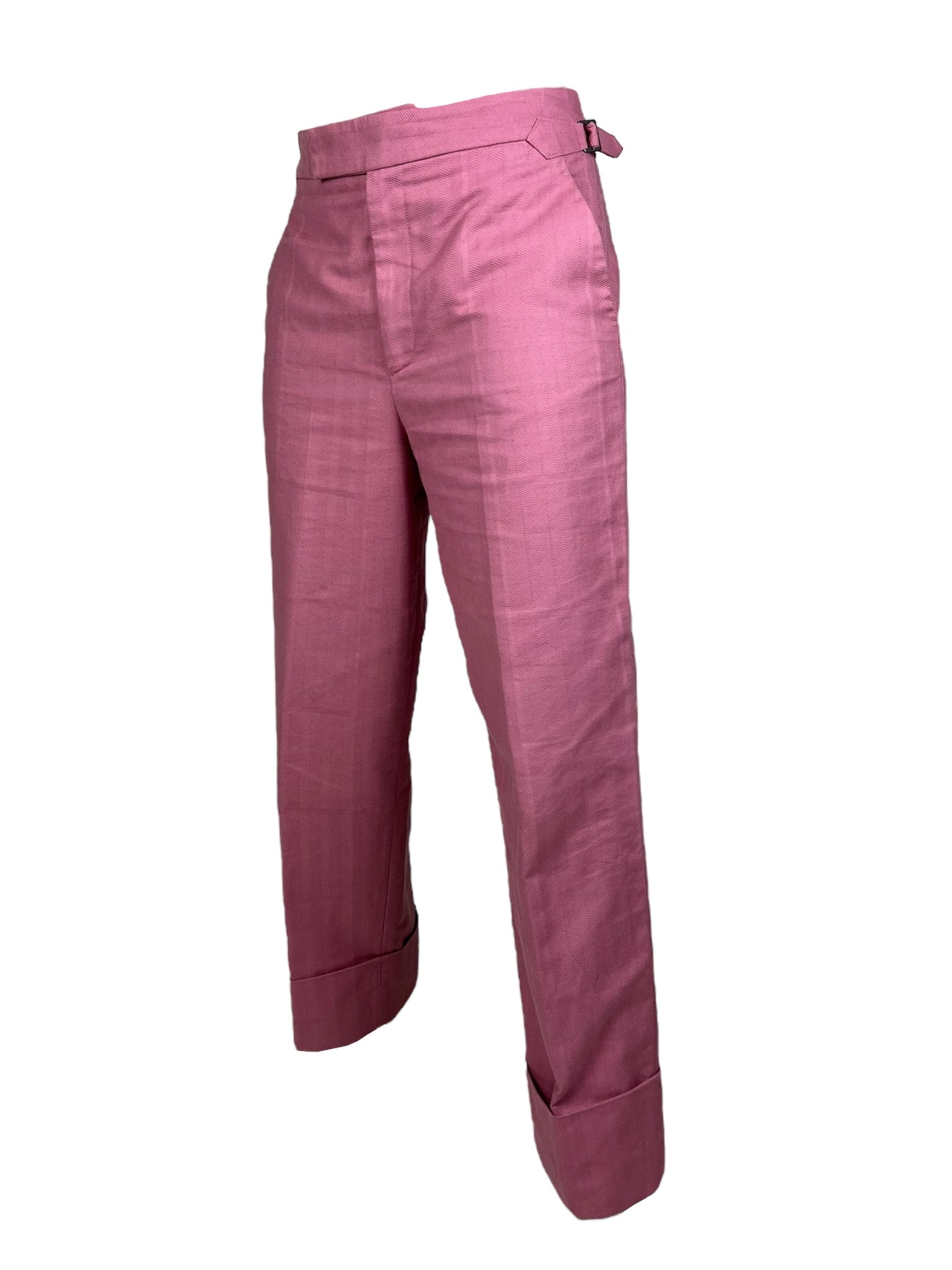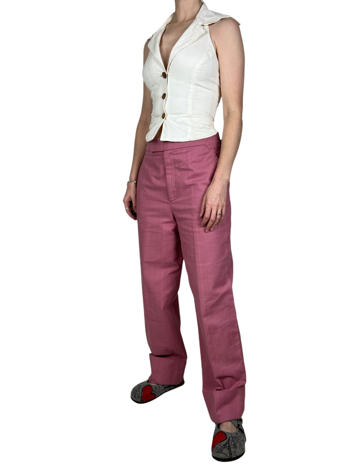 Vivienne Westwood F/W 2019 ‘Dave’ pink trousers. RRP £570. Herringbone stitch with a subtle large check pattern, in thick cotton. Straight leg with wide turn up ankle. Adjustable waist so fits UK10-12. All details below: