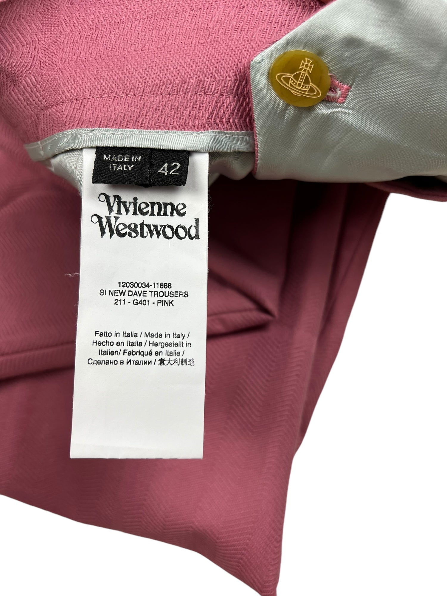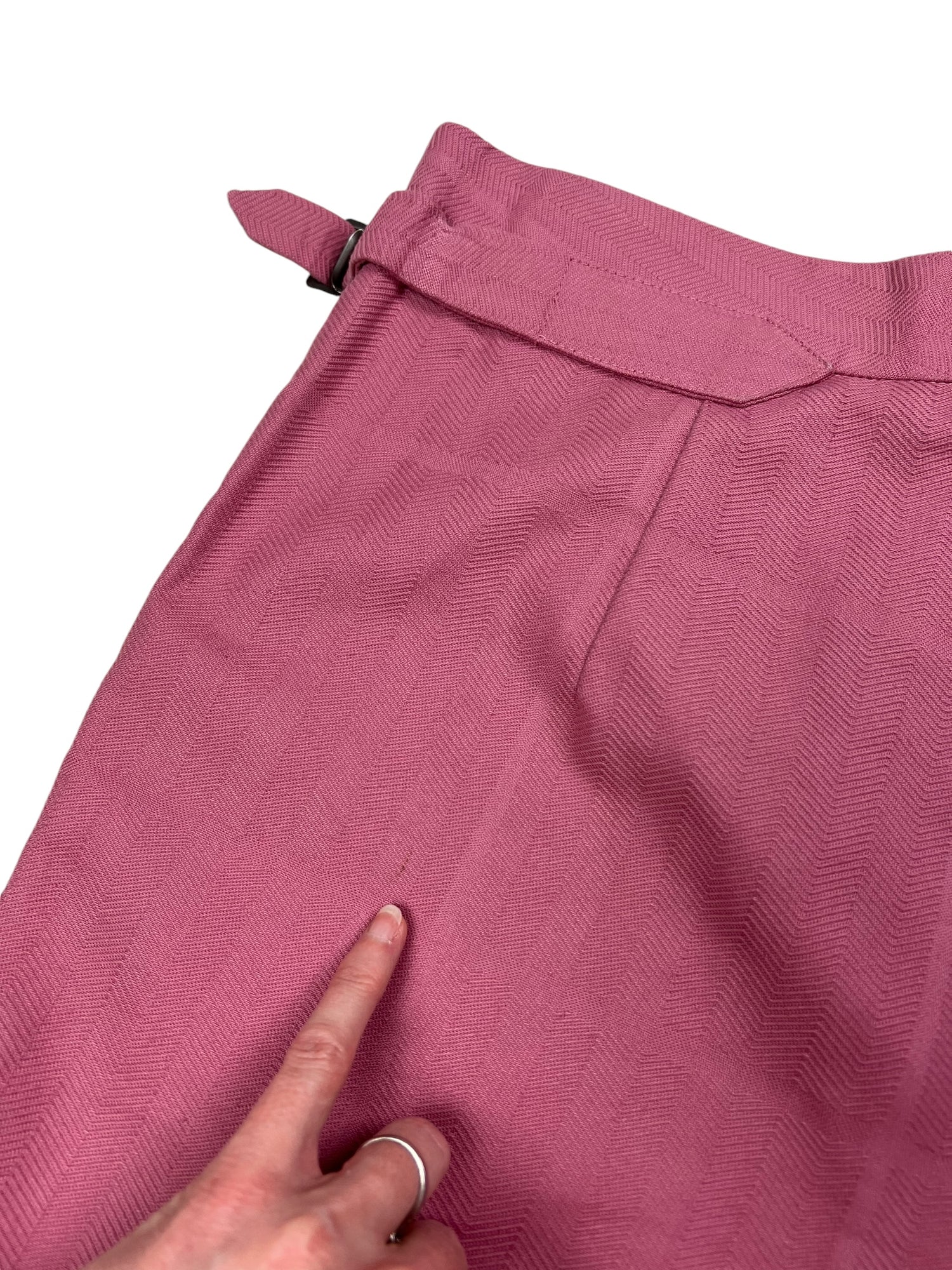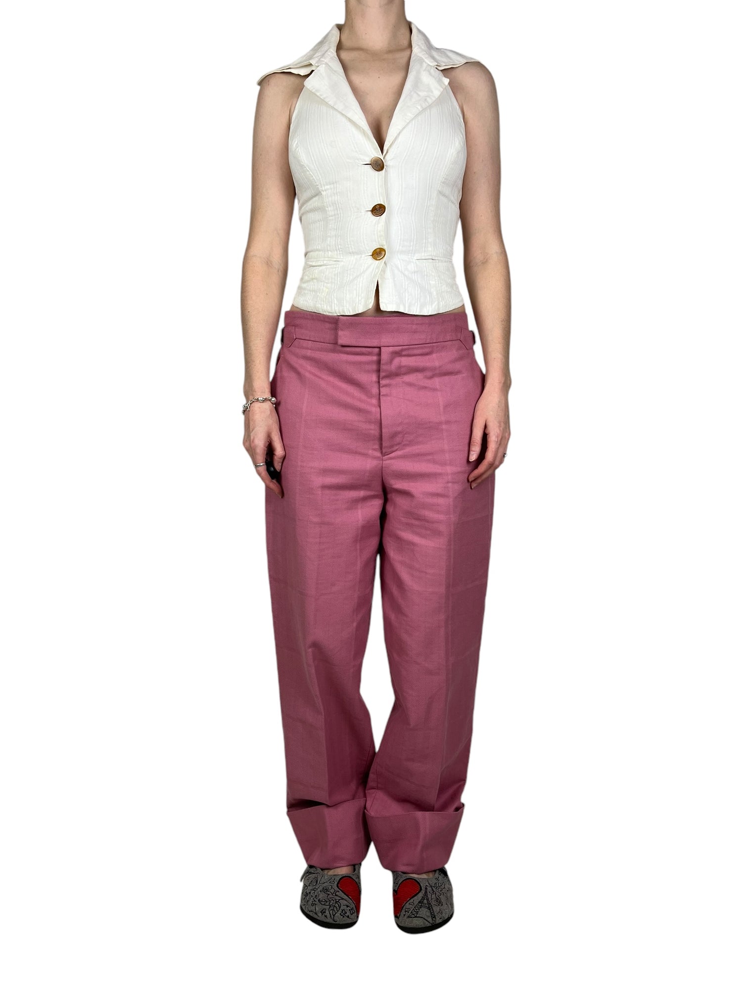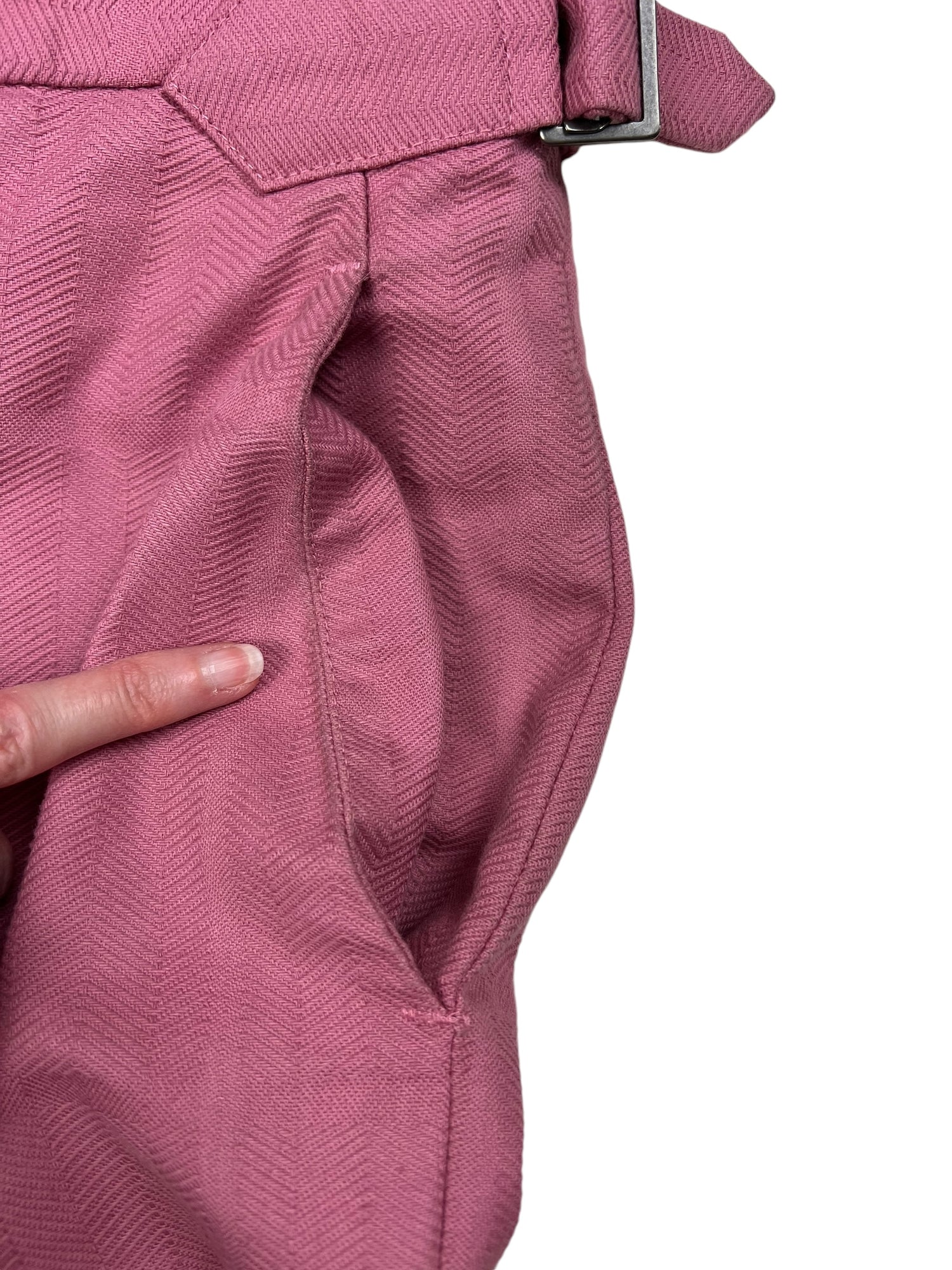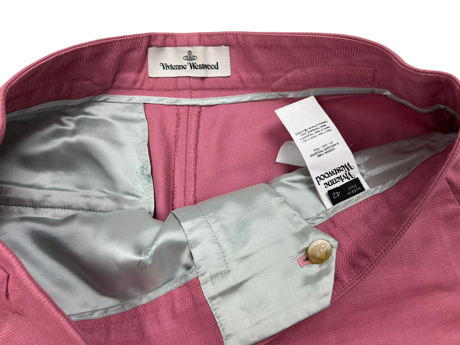 Vivienne Westwood F/W 2019 ‘Dave’ pink trousers. RRP £570. Herringbone stitch with a subtle large check pattern, in thick cotton. Straight leg with wide turn up ankle. Adjustable waist so fits UK10-12. All details below: