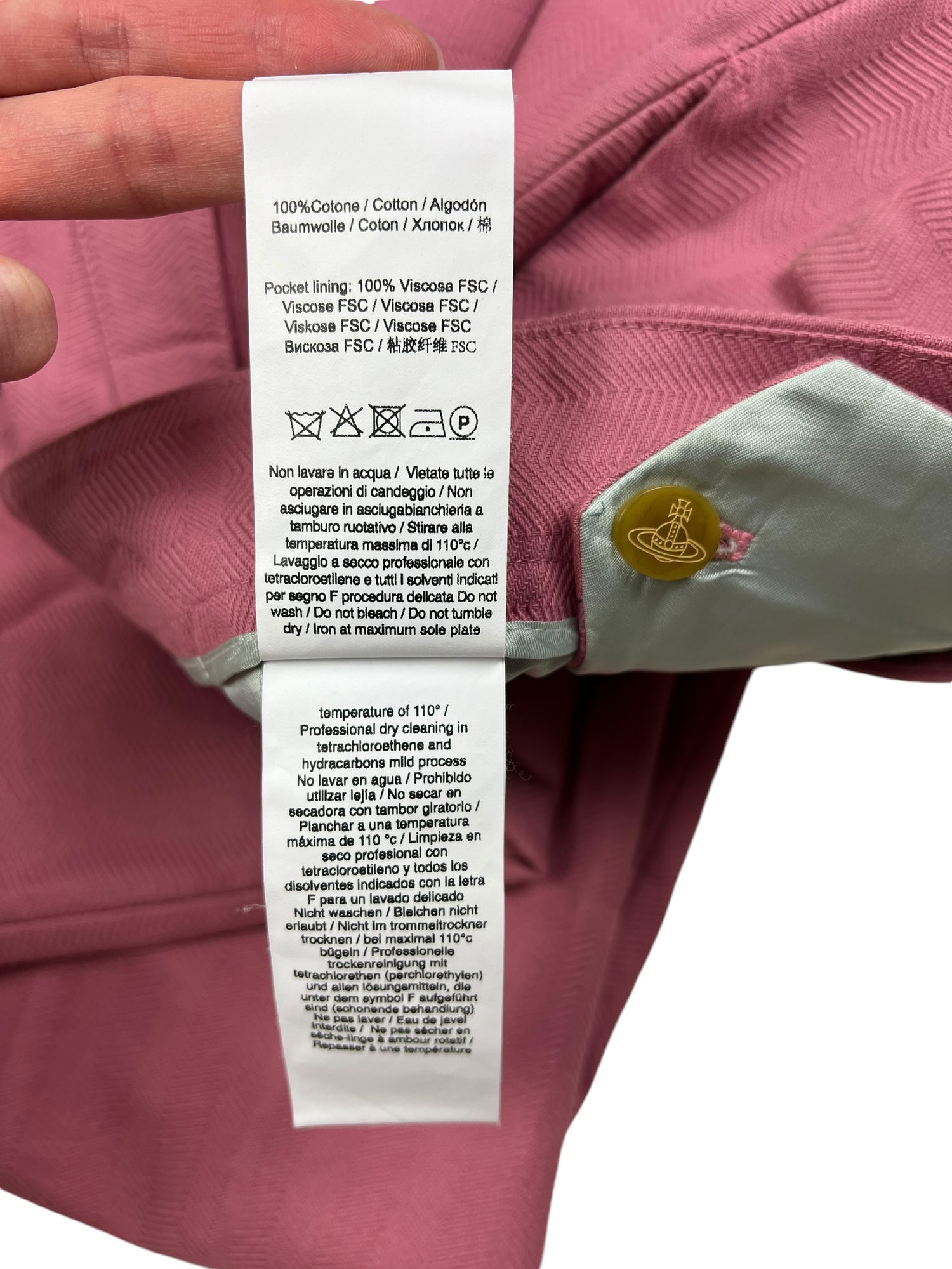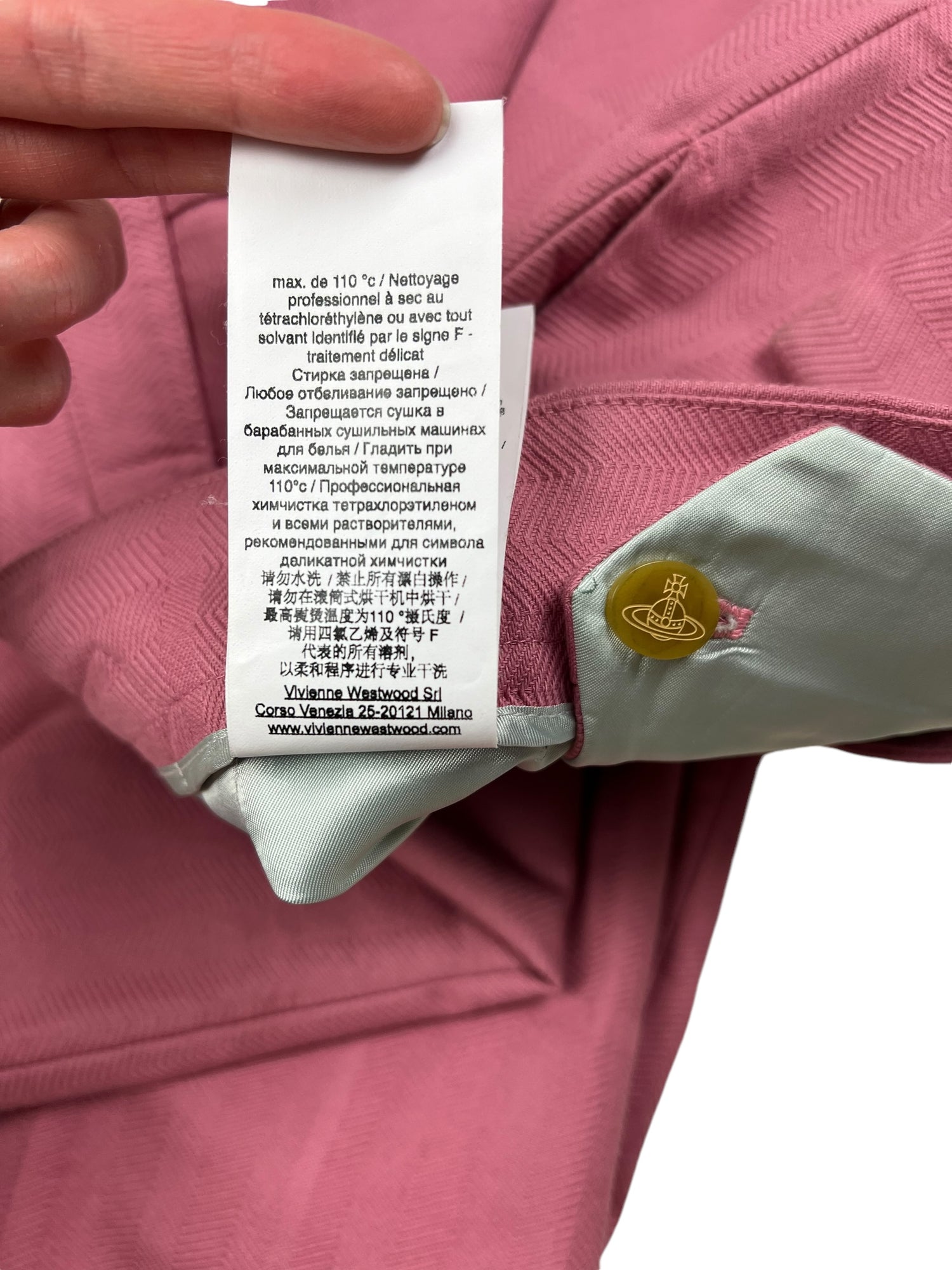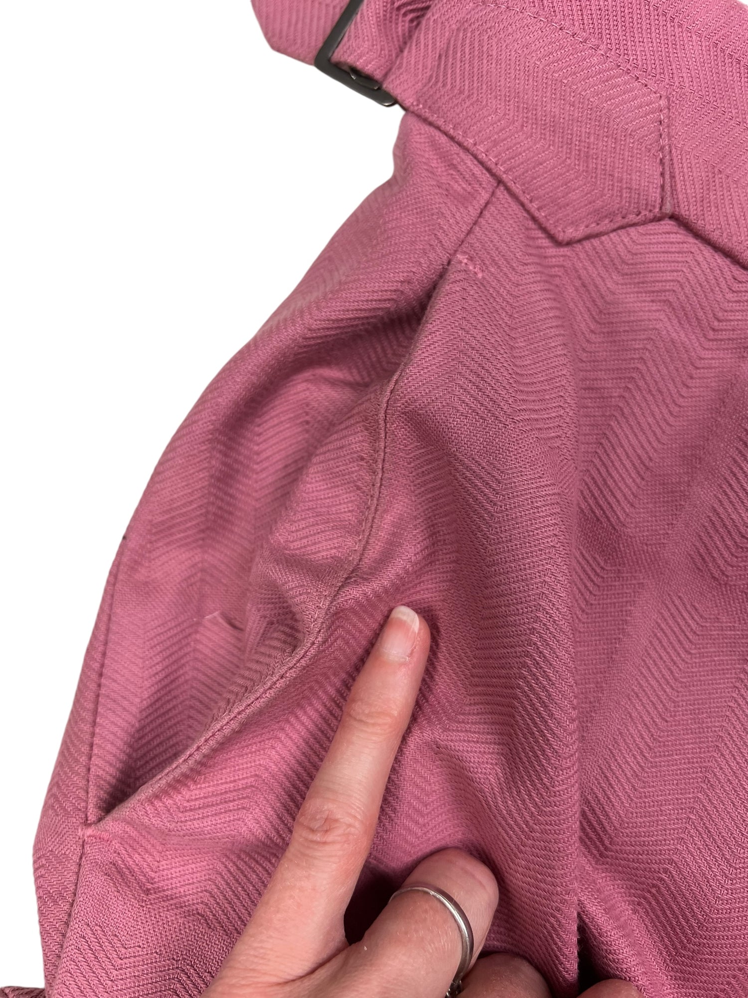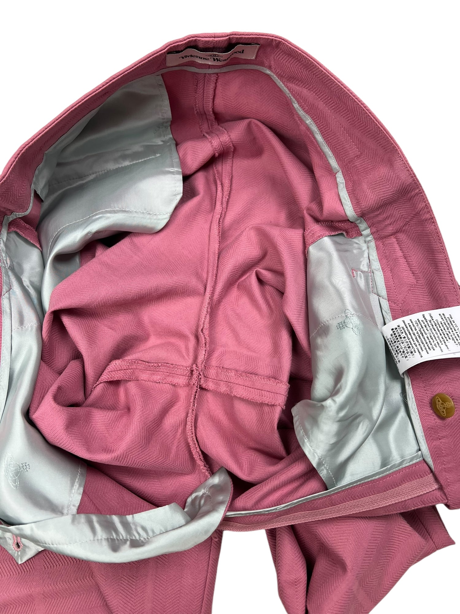 Vivienne Westwood F/W 2019 ‘Dave’ pink trousers. RRP £570. Herringbone stitch with a subtle large check pattern, in thick cotton. Straight leg with wide turn up ankle. Adjustable waist so fits UK10-12. All details below: