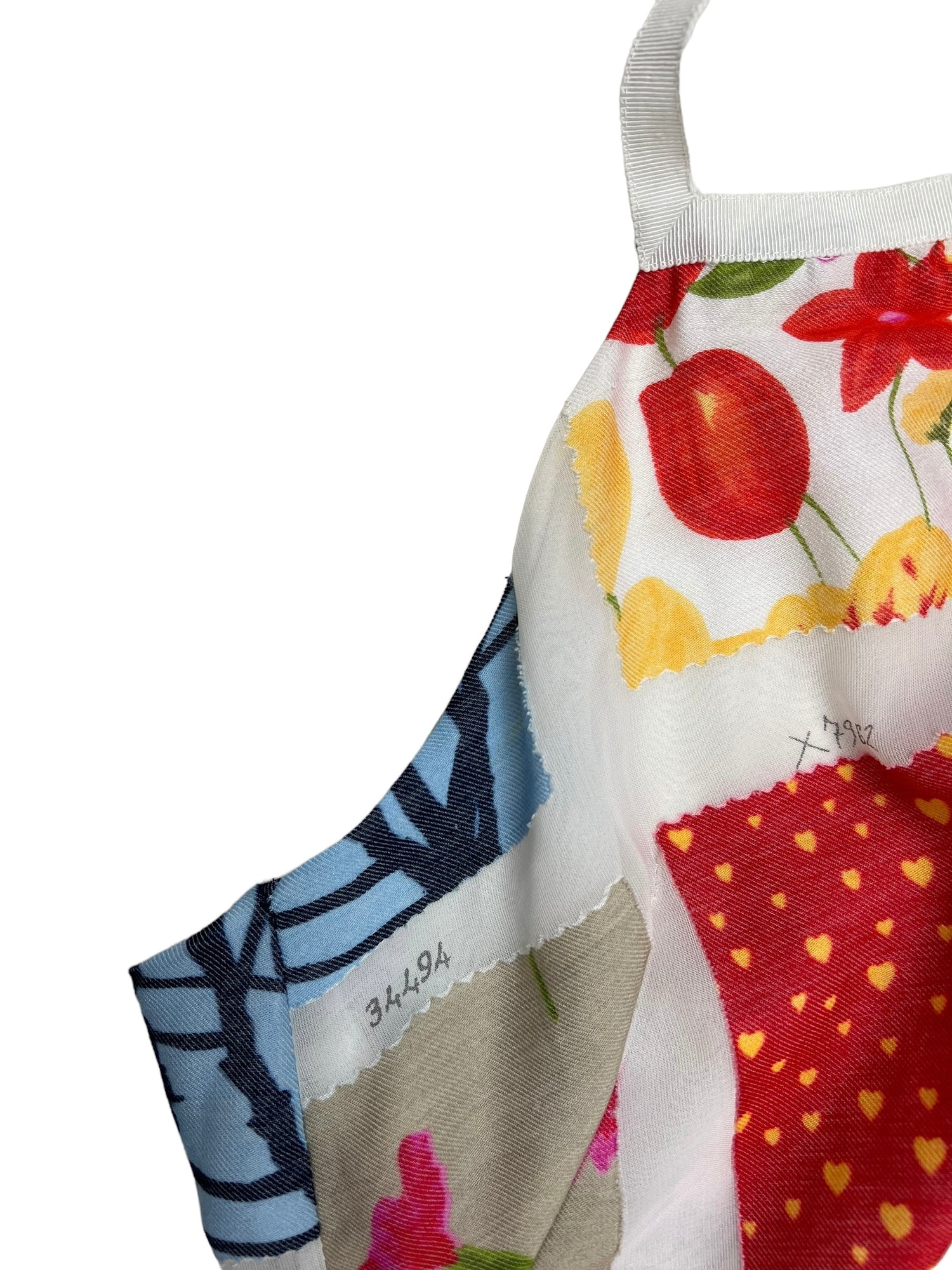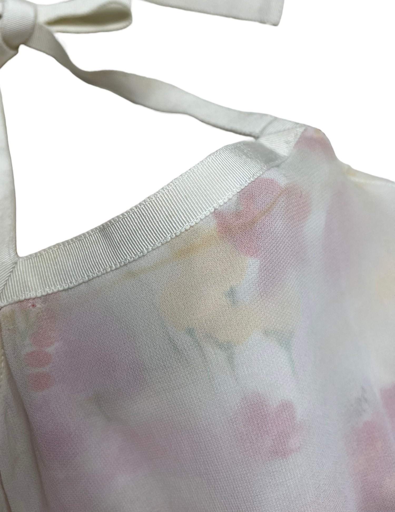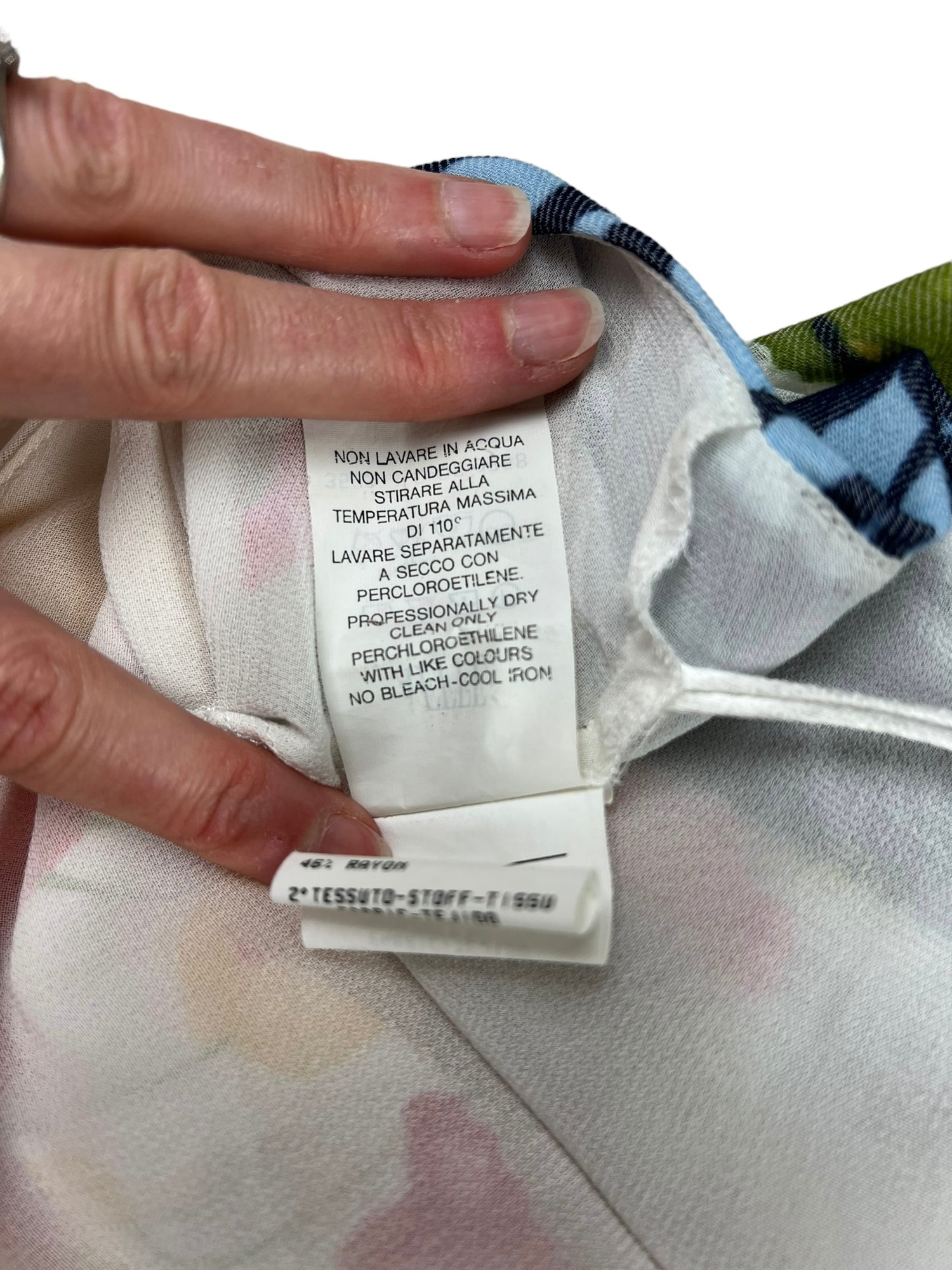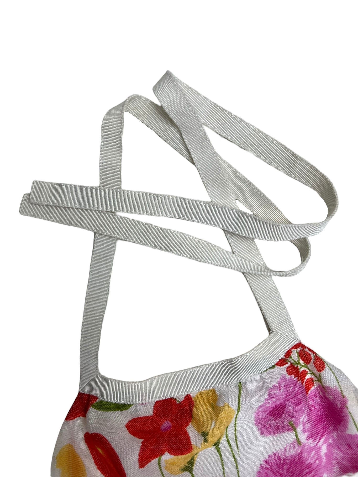 🐥 Condition is very good. No holes, or odour. The main body is in almost immaculate condition. Armpits clean on our side. A couple of very small minor scuffs (but not holes) to the mesh near seams as shown - barely visible and you’d never notice them. Inside the neck and arm pits are some yellow water marks but these do not shown on the outside, and they’re very faint. Halter neck straps clean with very minimal marks - again, you’d never notice. Some marks to bottom of under slip as shown - again, not visible at all from the outside. 54% polyester, 46% rayon outer. Rayon lining. Dry clean ONLY.