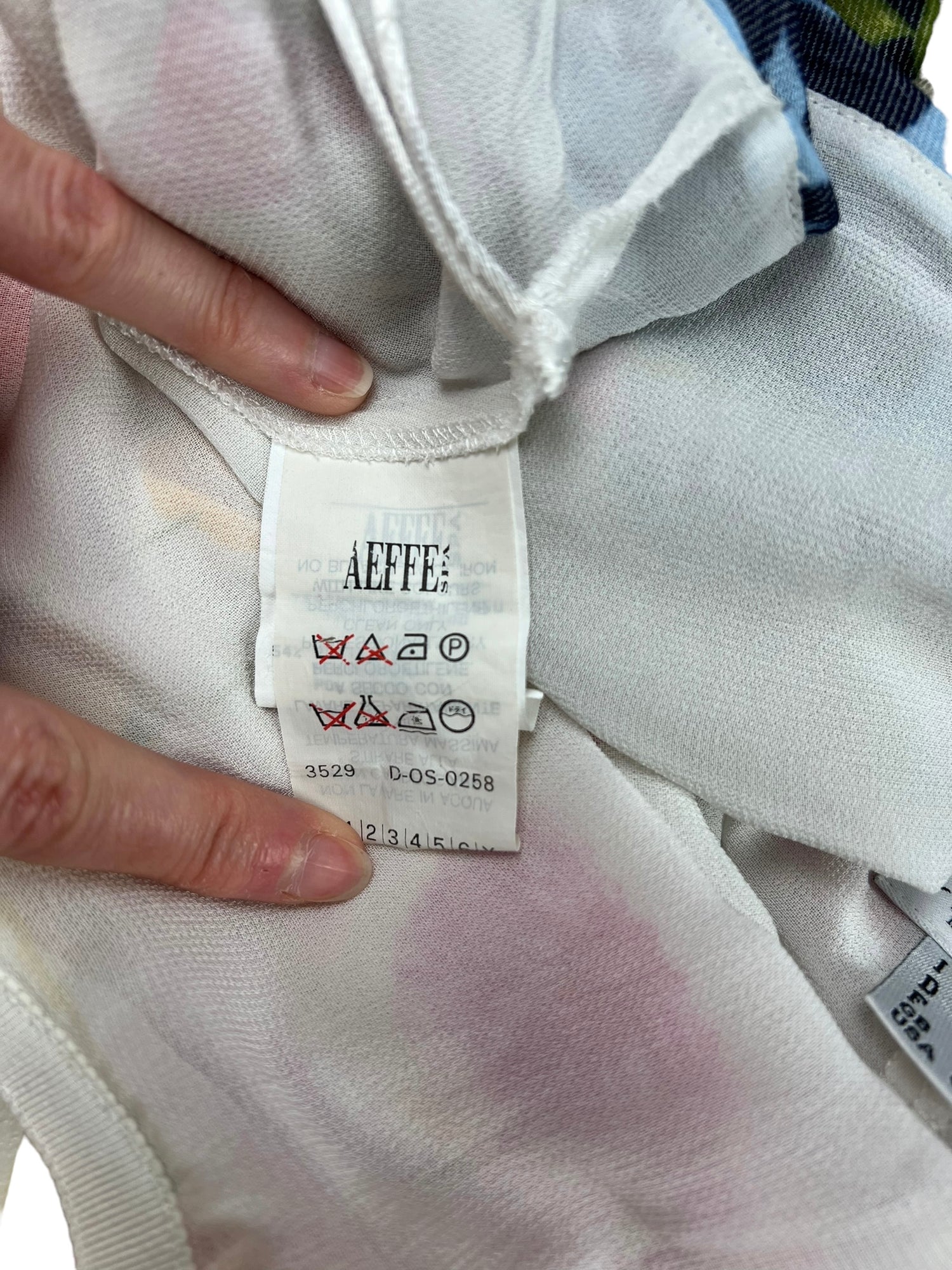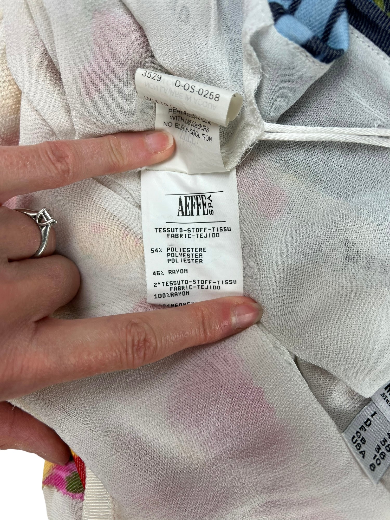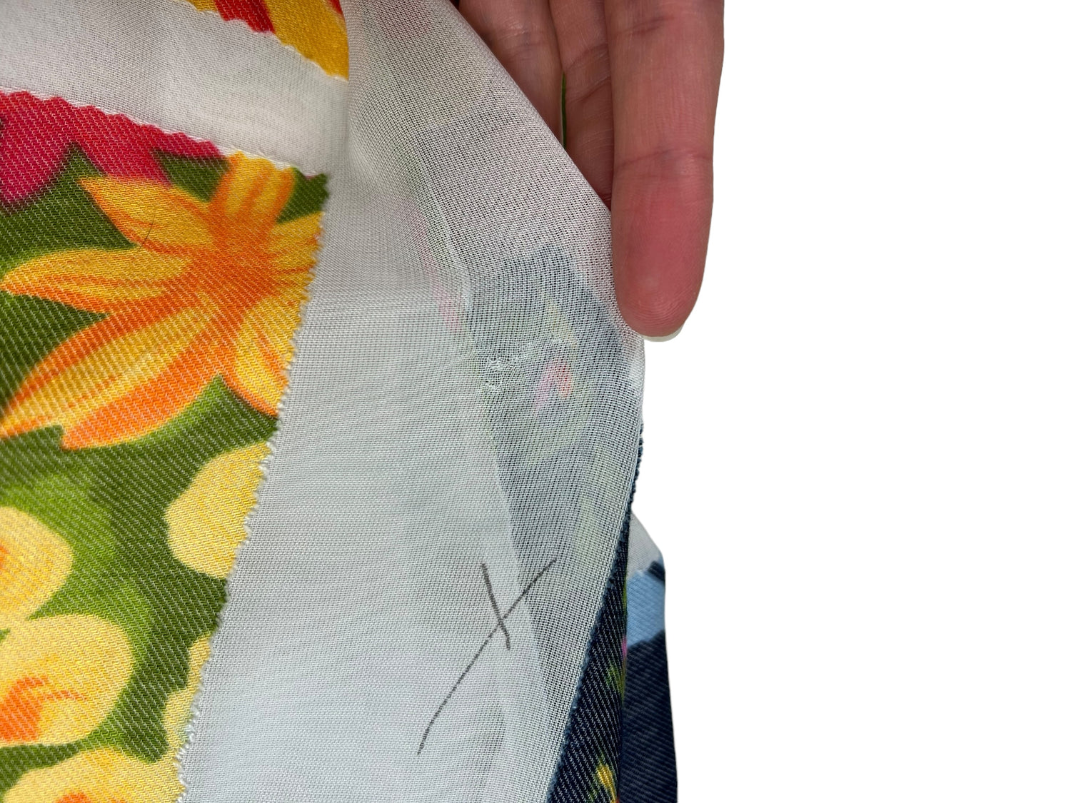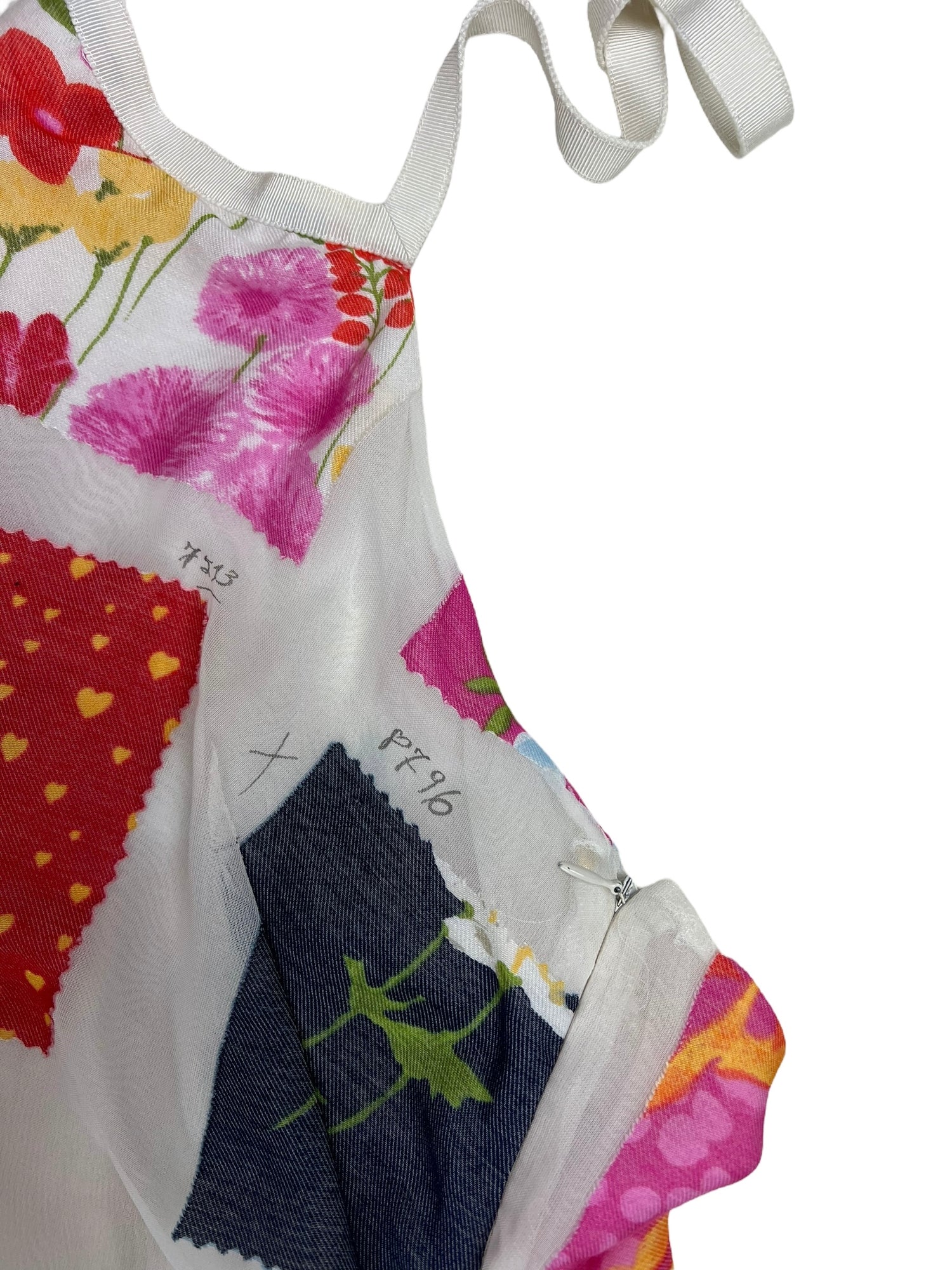 🐥 Condition is very good. No holes, or odour. The main body is in almost immaculate condition. Armpits clean on our side. A couple of very small minor scuffs (but not holes) to the mesh near seams as shown - barely visible and you’d never notice them. Inside the neck and arm pits are some yellow water marks but these do not shown on the outside, and they’re very faint. Halter neck straps clean with very minimal marks - again, you’d never notice. Some marks to bottom of under slip as shown - again, not visible at all from the outside. 54% polyester, 46% rayon outer. Rayon lining. Dry clean ONLY.