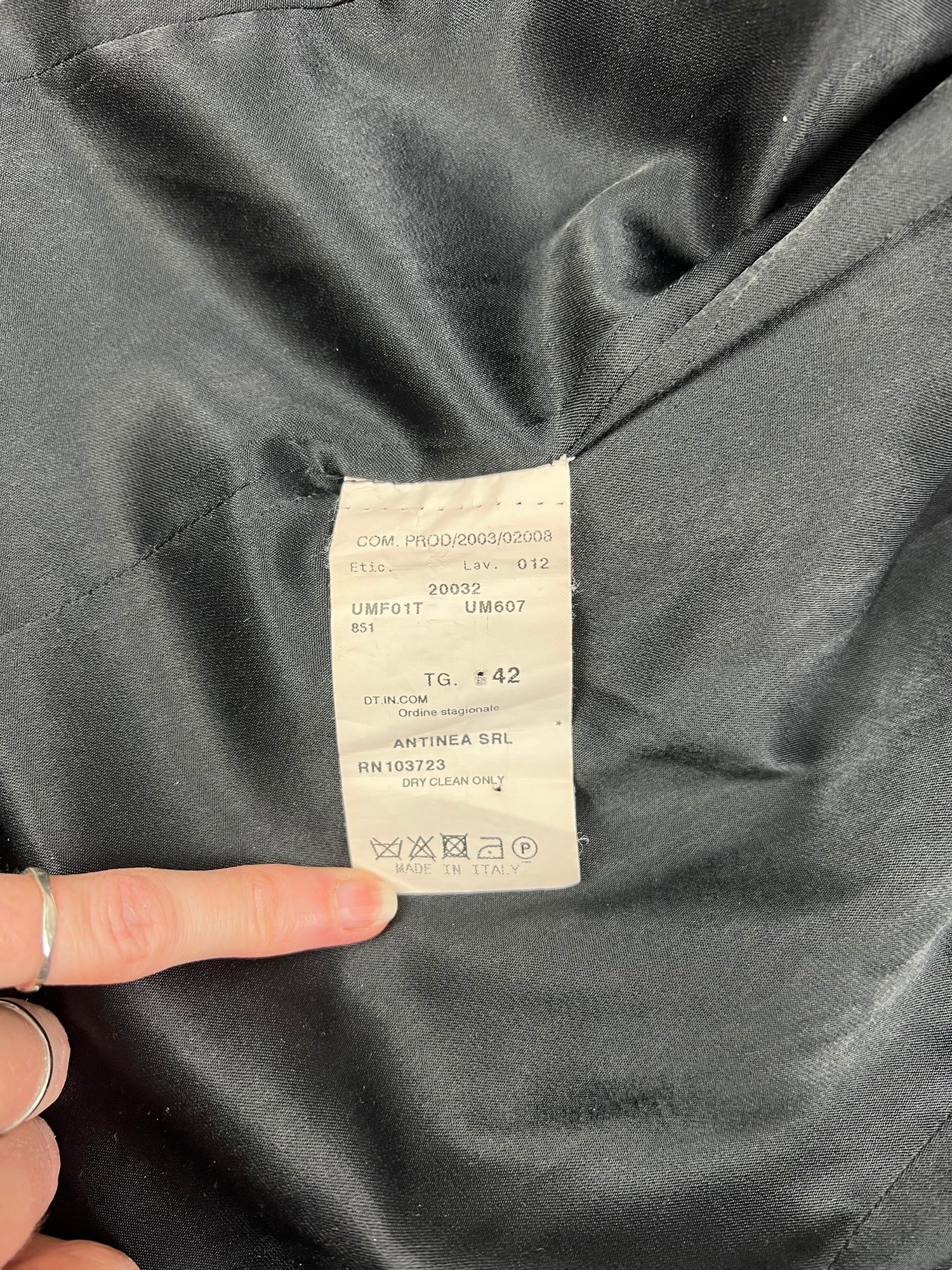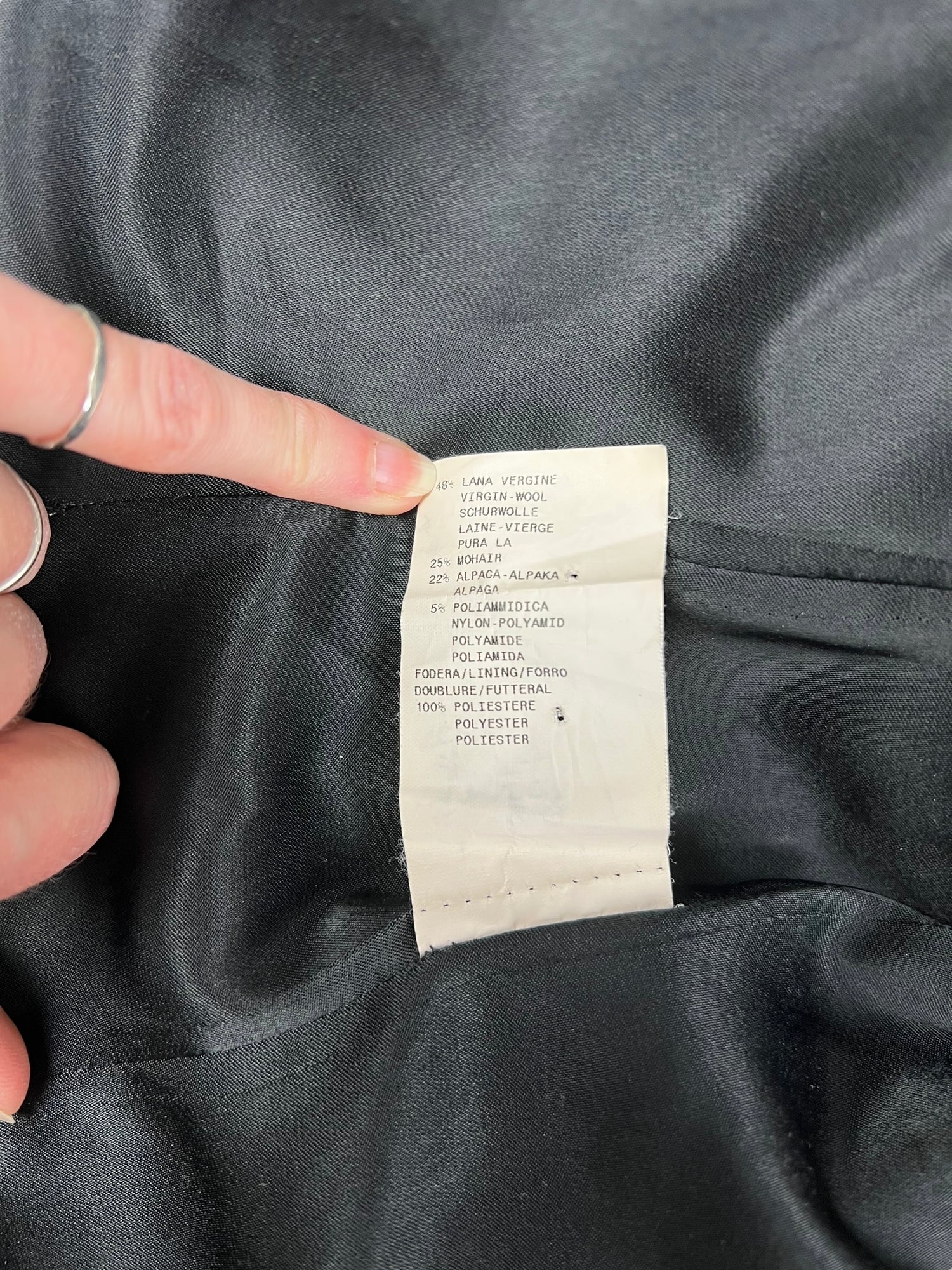 🐥 Condition is excellent, no exterior signs of wear. No stains, pulls, holes, or odour. Inside very good - armpits and collar clean and stain-free. One inner seam has become unstitched but doesn’t affect wearability. 48% wool, 25% mohair, 22% alpaca, 5% polyamide. Lining 100% polyester. Dry clean.