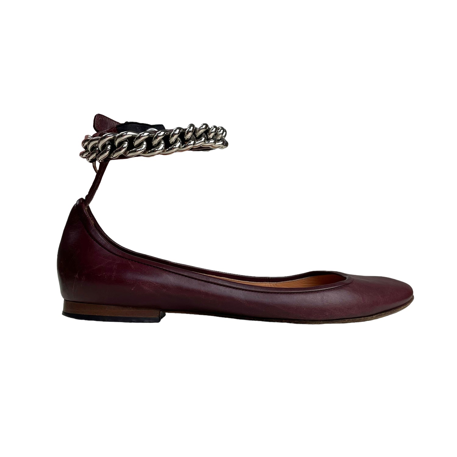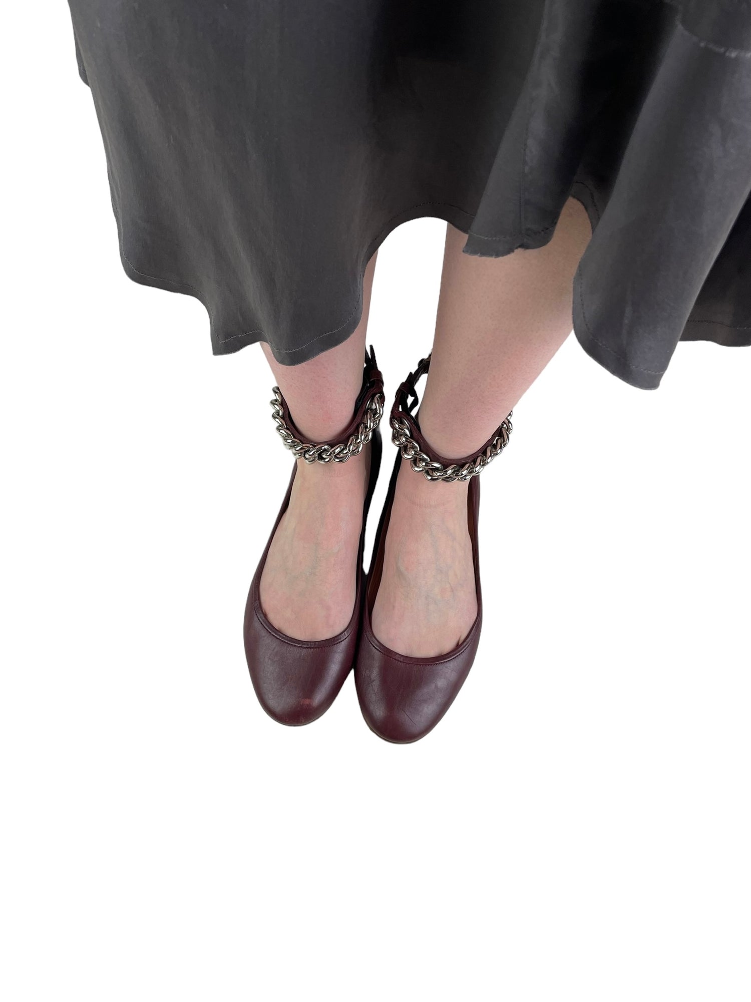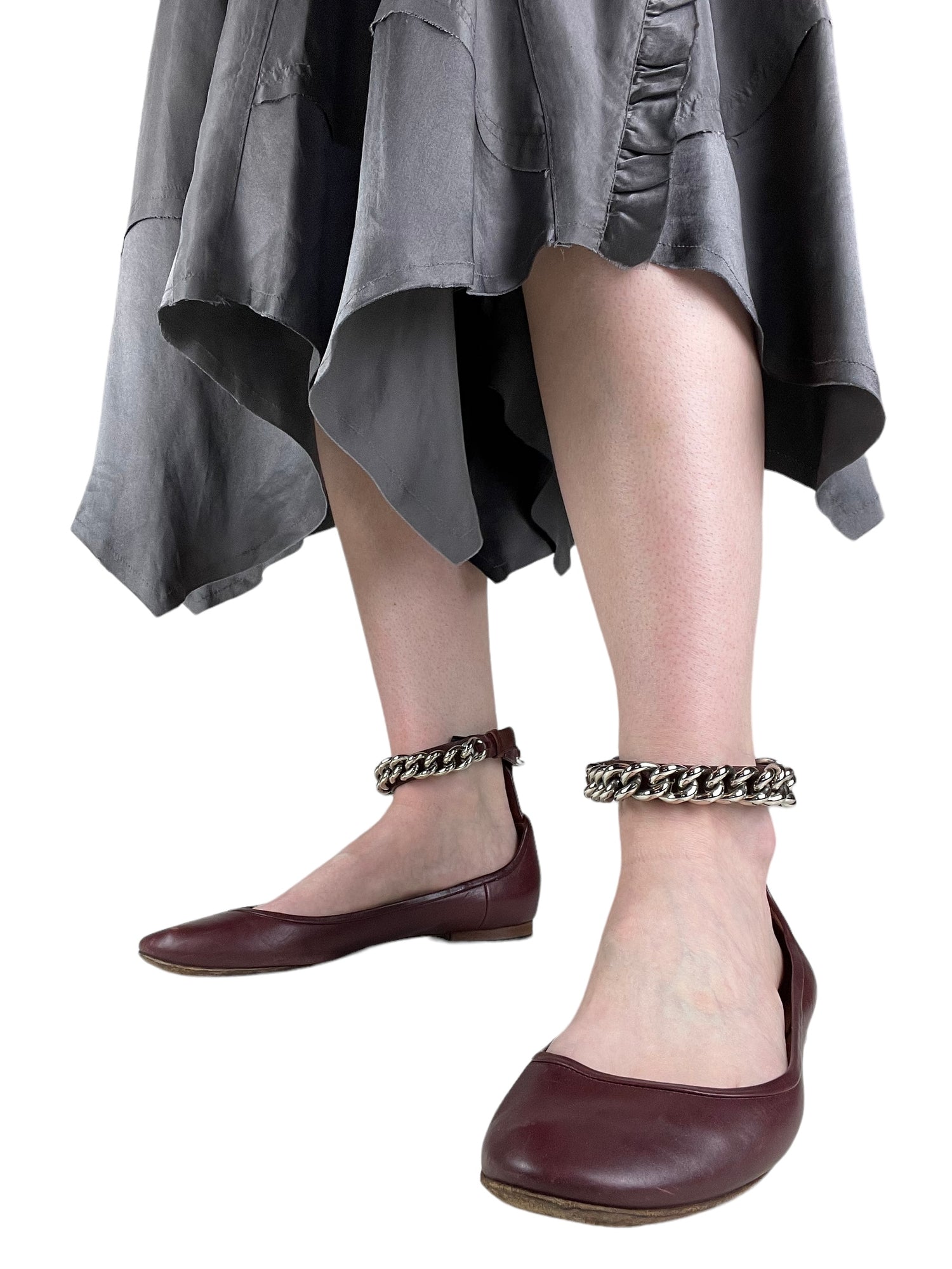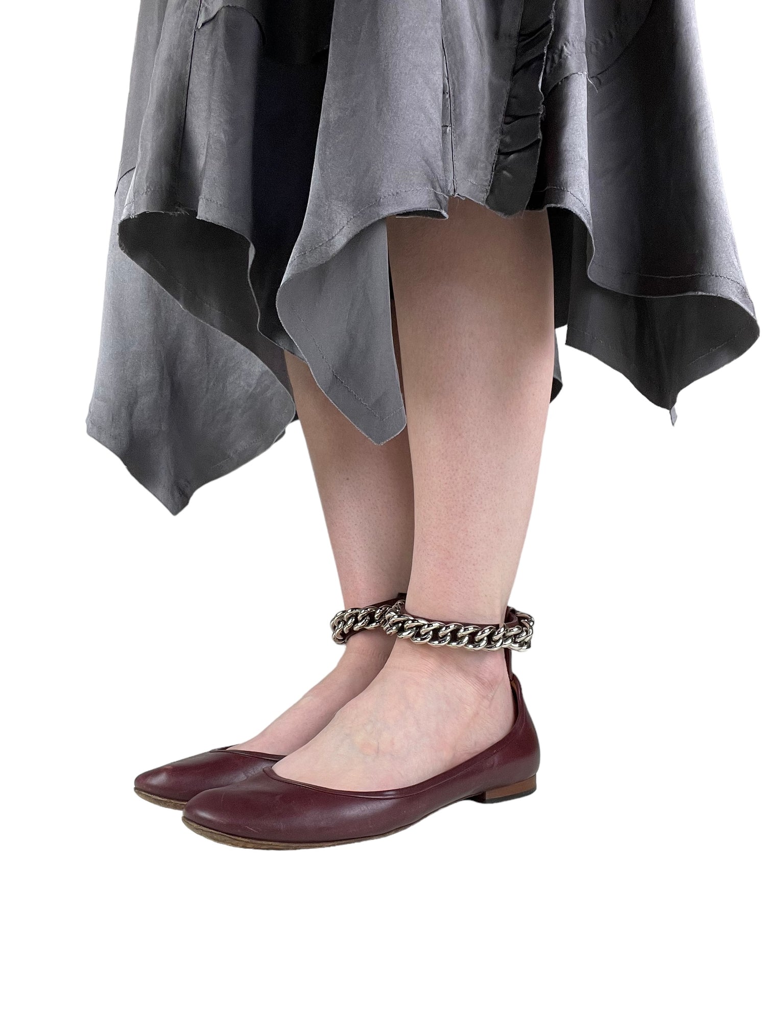 Deep maroon red leather with silver-tone metal curb link ankle chain. Size UK5.5. All details below 👇