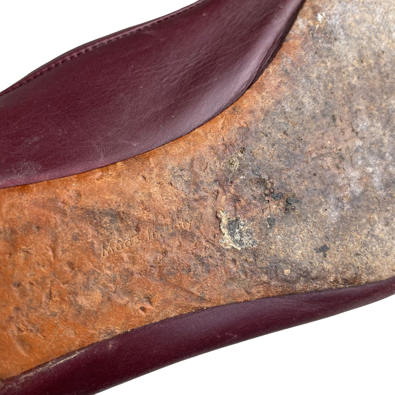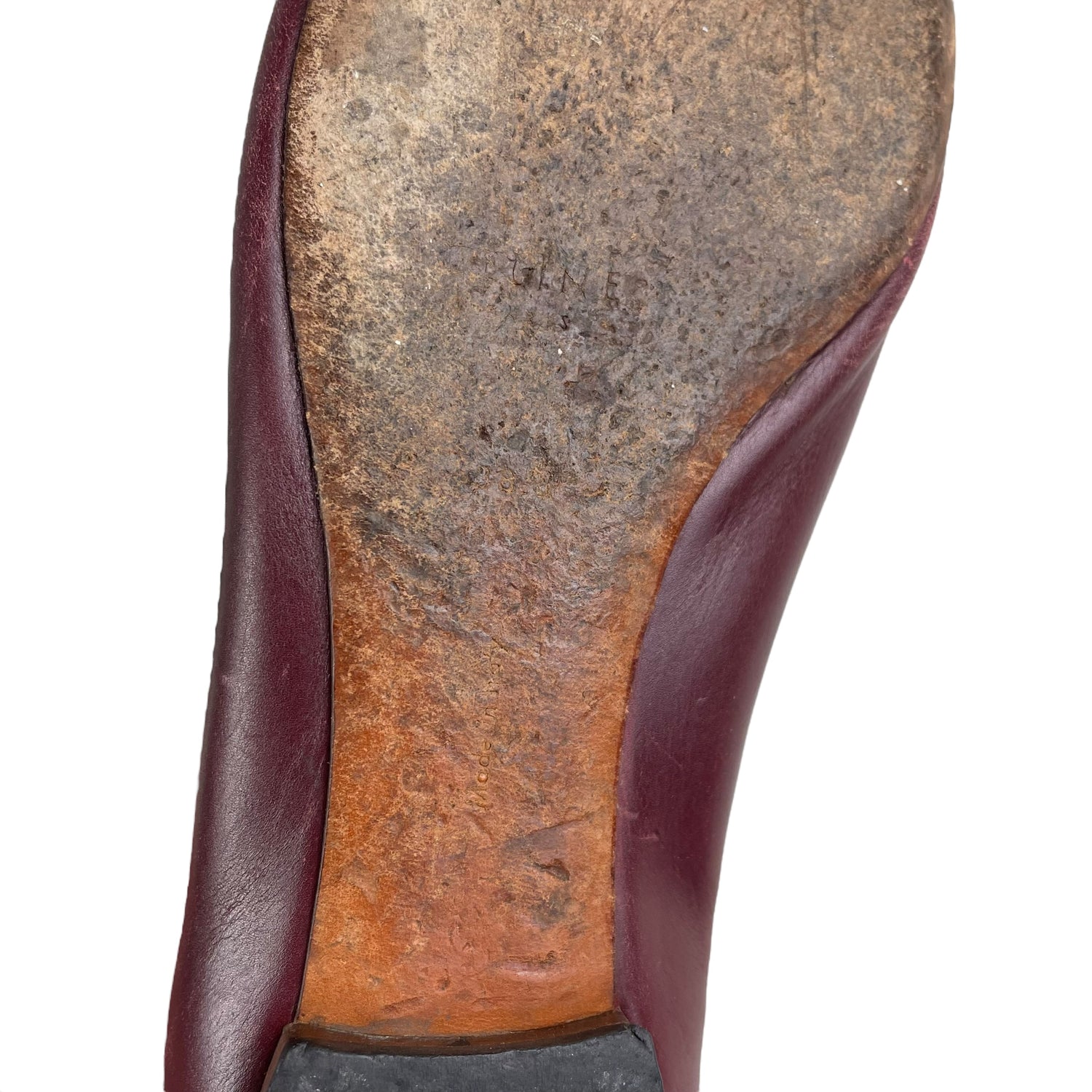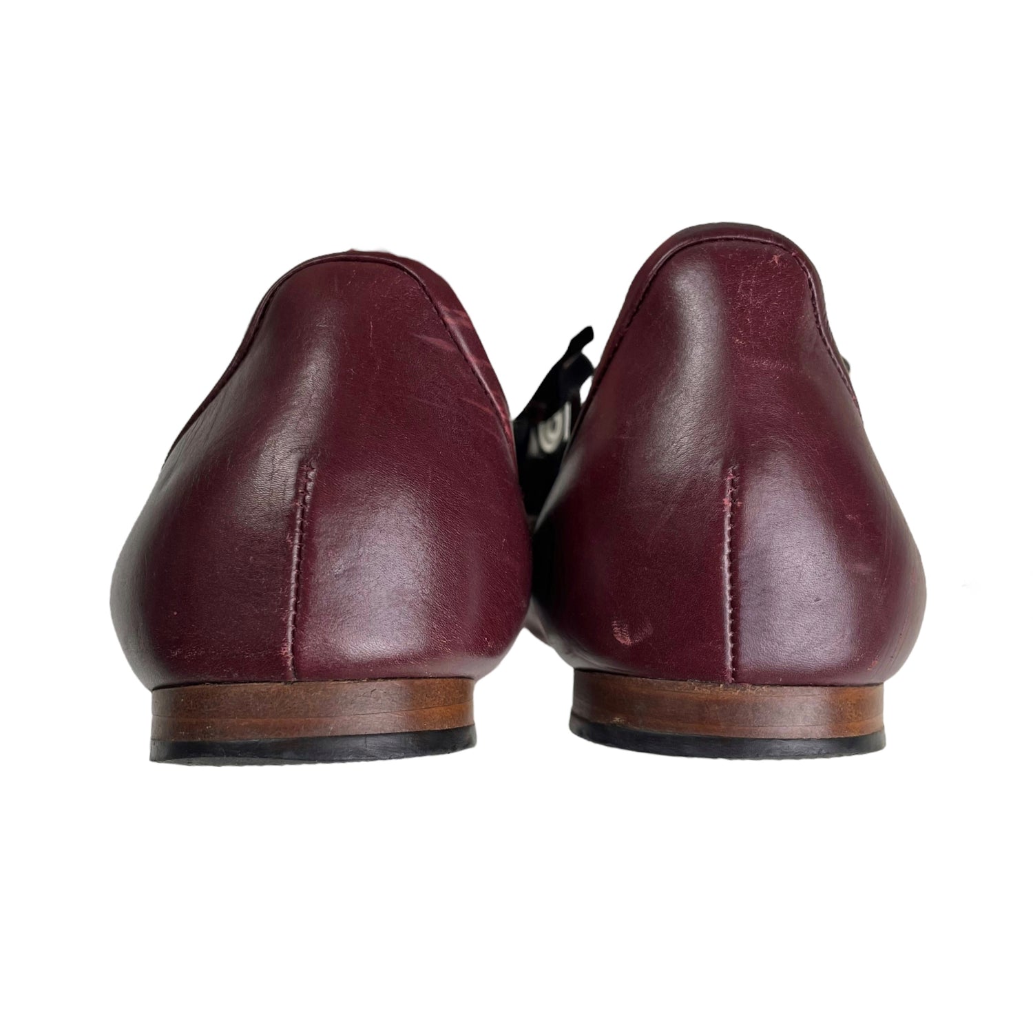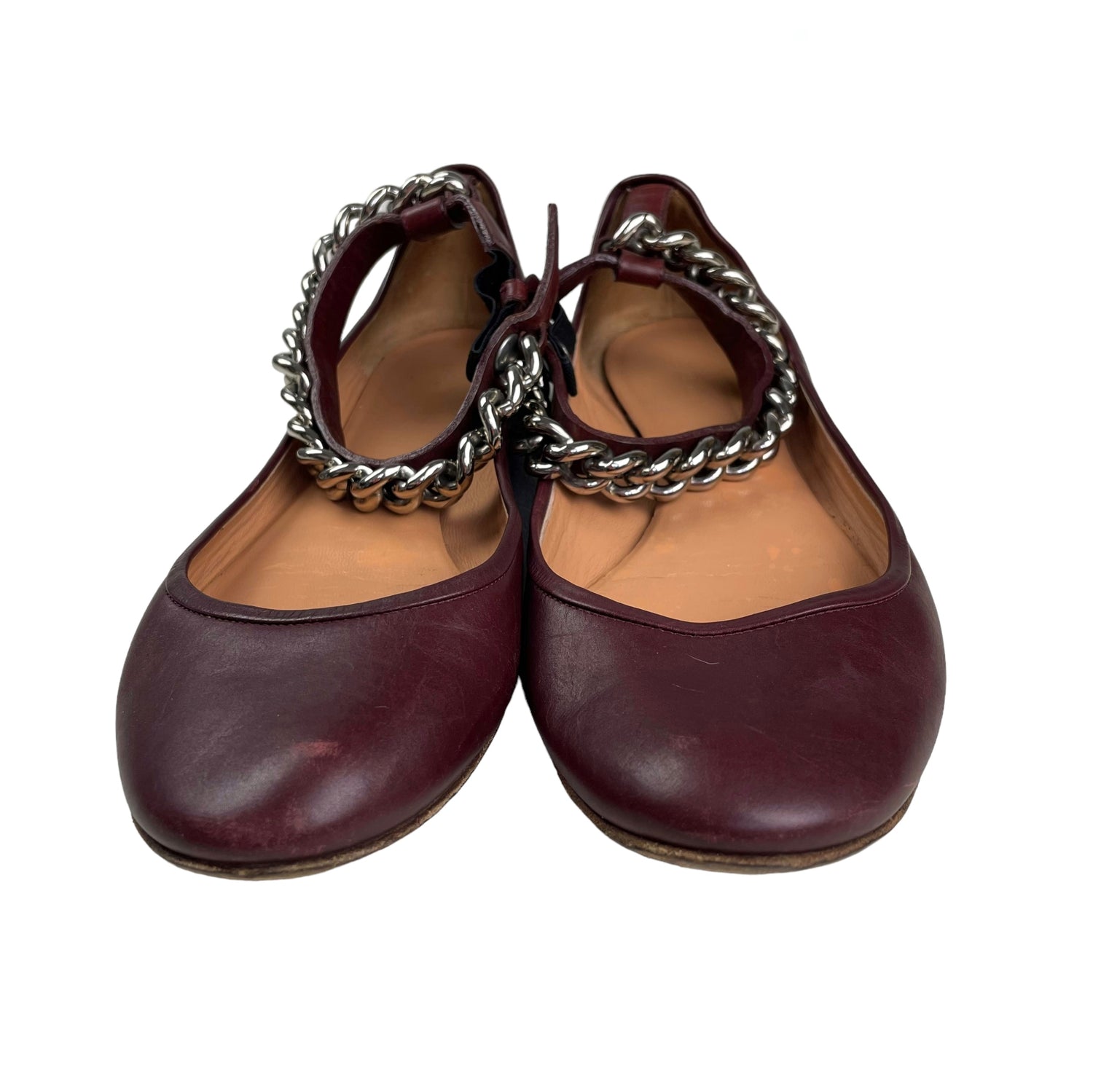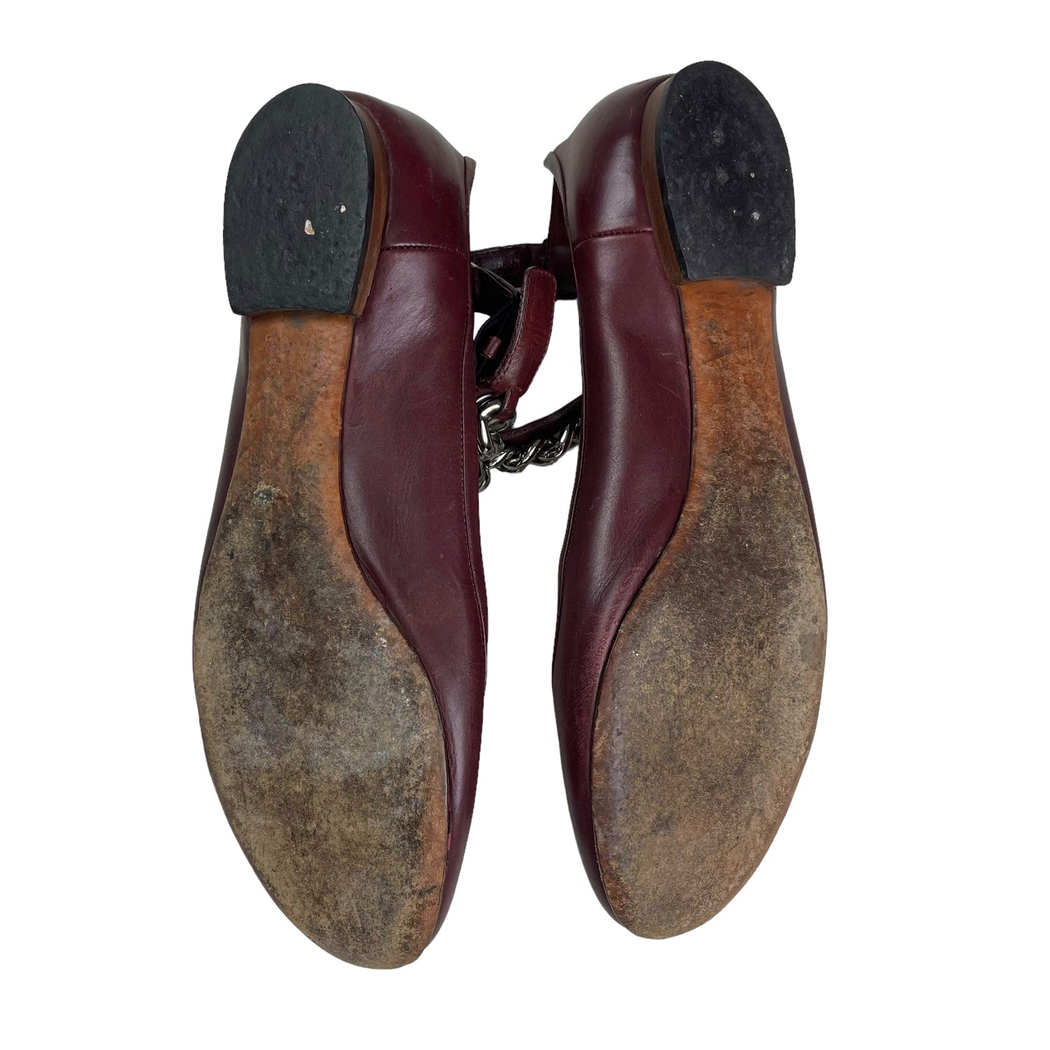 Deep maroon red leather with silver-tone metal curb link ankle chain. Size UK5.5. All details below 👇