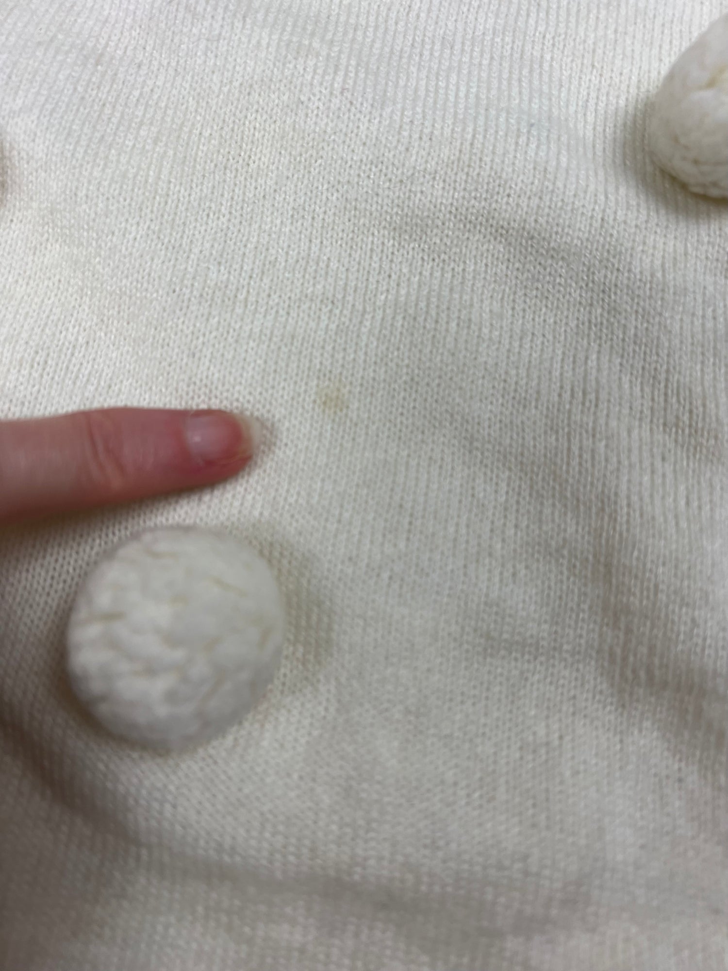 🐥 Condition is good. Light bobbling to Pom poms and main body but not significant. Two small marks - one to front, one to cuff as shown. Armpits clean and stain-free. 70% acrylic, 30% wool. Dry clean only