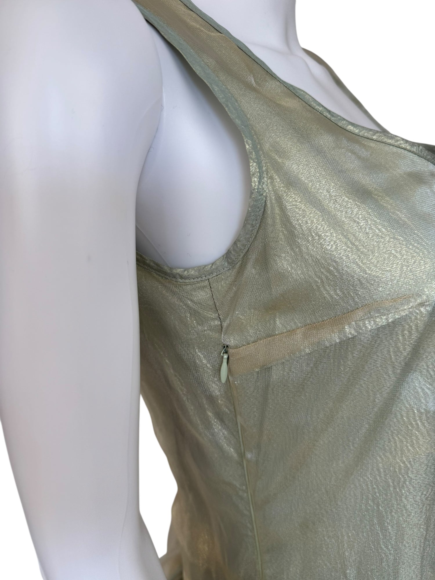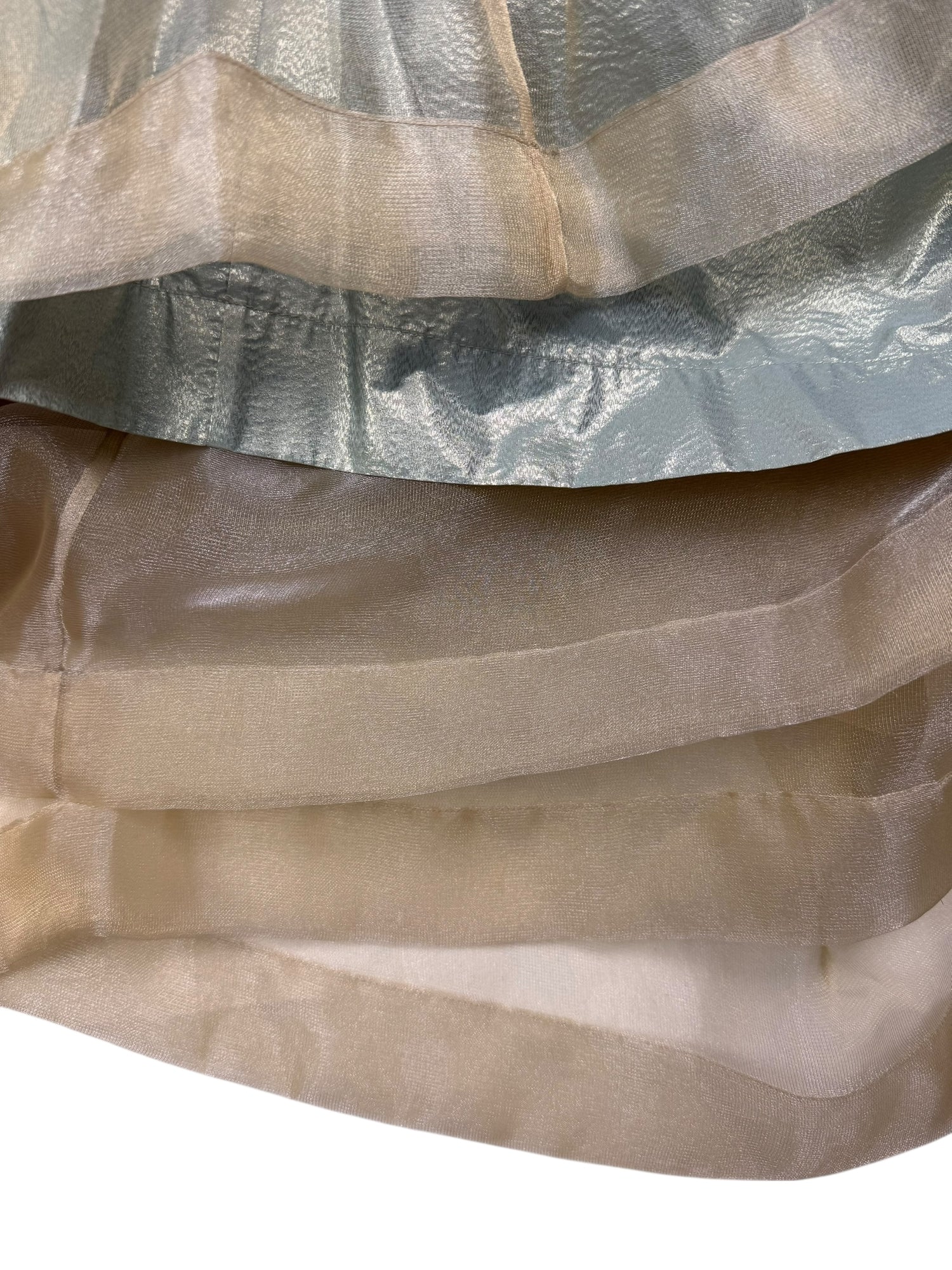 Exquisite Vivienne Westwood Demi-Couture Gold Label dress with lamé green foil base and gold fine organza top layer. The layered skirt section has loosely structured panels, creating a voluptuous silhouette. This dress first appeared in the F/W 2010 Gold Label collection and was worn by Sarah Jessica-Parker to the Tokyo premiere of Sex and the City 2 earlier in the year. A corseted bridal version of this dress was released in the Autumn 2011 Luxury Wedding Show Catwalk at The Saatchi Gallery, London. The dress was then released in a peach and a black colourway for The Queen’s Diamond Jubilee capsule collection in 2012, and some of the gowns from this small 9-piece collection featured on the F/W 2012 runway collection titled ‘The Red Carpet Capsule Collection’. Vivienne Westwood muse and Queen of Gothica, Helena Bonham-Carter, wore the black corseted version to the 2013 Oscars. Rita Ora wore the peach gold corseted version more recently in her 2017 ‘Anywhere’ music video. And this dress has been reimagined once again for the latest 2026 Bridal collection in a corset and skirt version very similar to the F/W 2010 ‘Sarah Jessica-Parker’ one, with a slightly different Pierre Joseph Redouté-inspired rose print, as seen on actress Vicky Krieps. UK10. All details below👇