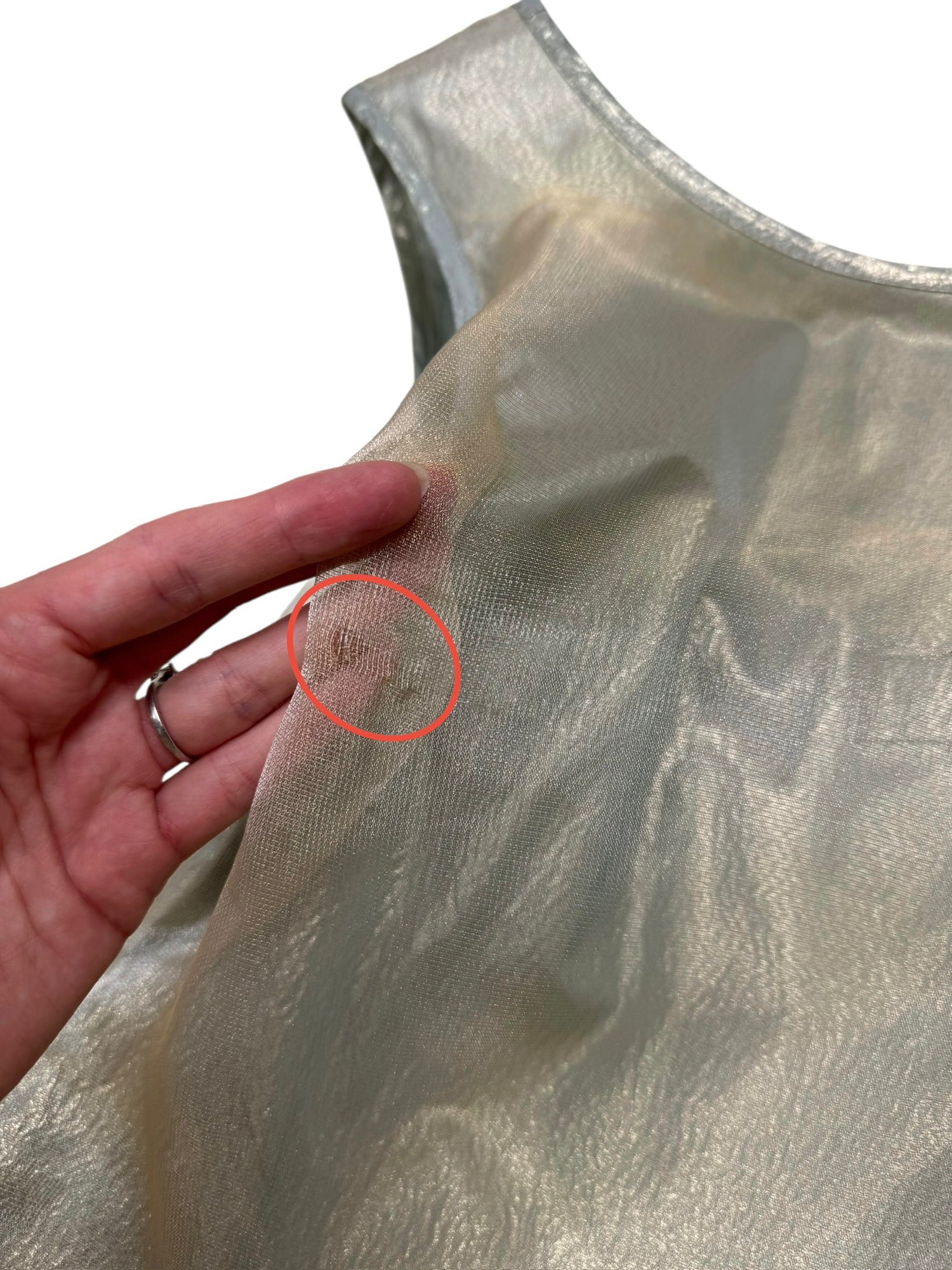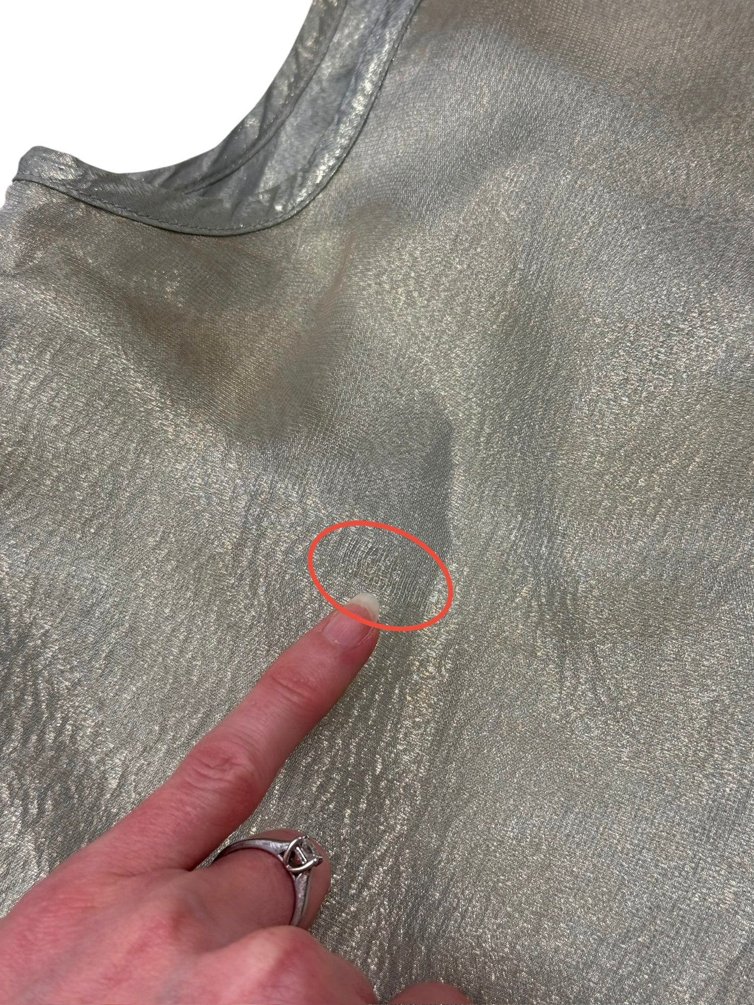 🫶 Condition is excellent - new with tags. No holes, stains, or odour. Underarms clean and stain-free. One very small stretch to the mesh fabric on the back as shown - it’s very hard to photograph so I have taken multiple picture from different angles. One minuscule pull to front left which is near impossible to photograph. Main fabric 53% silk, 35% polyamide, 12% polyester. 2nd fabric 100% polyester. Dry clean only.